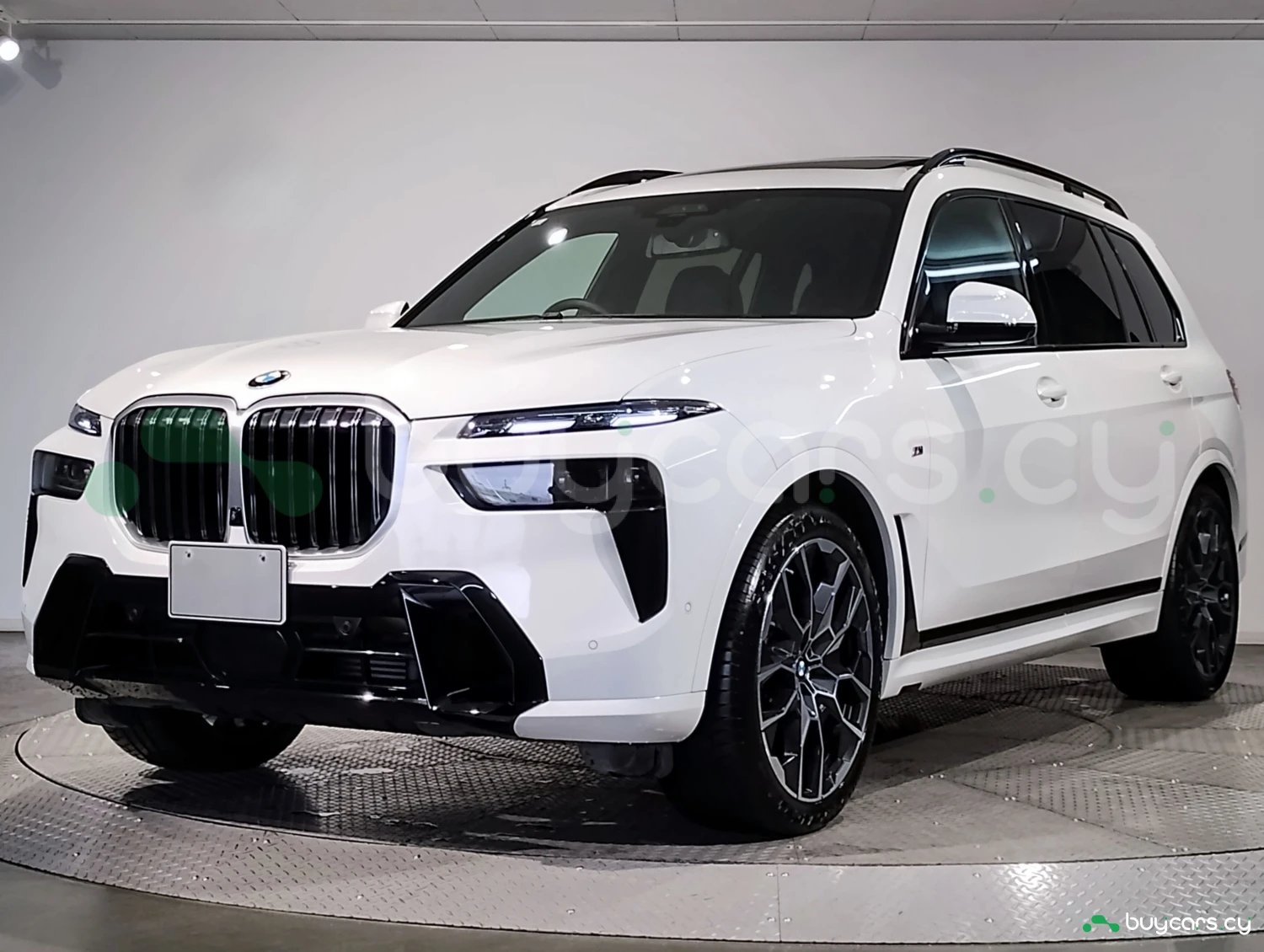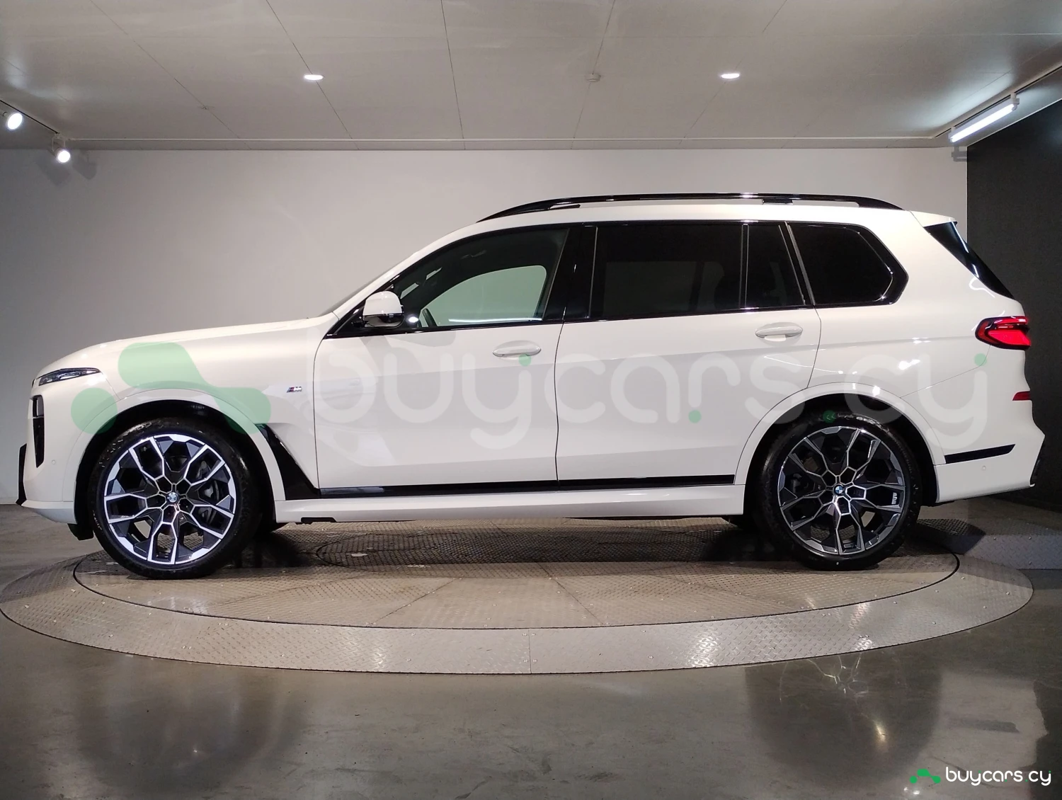 Finished in Alpine White, the BMW X7 features adaptive LED headlights, roof rails, aluminum wheels, and distinctive M Sport design elements that emphasize its bold and dynamic presence.