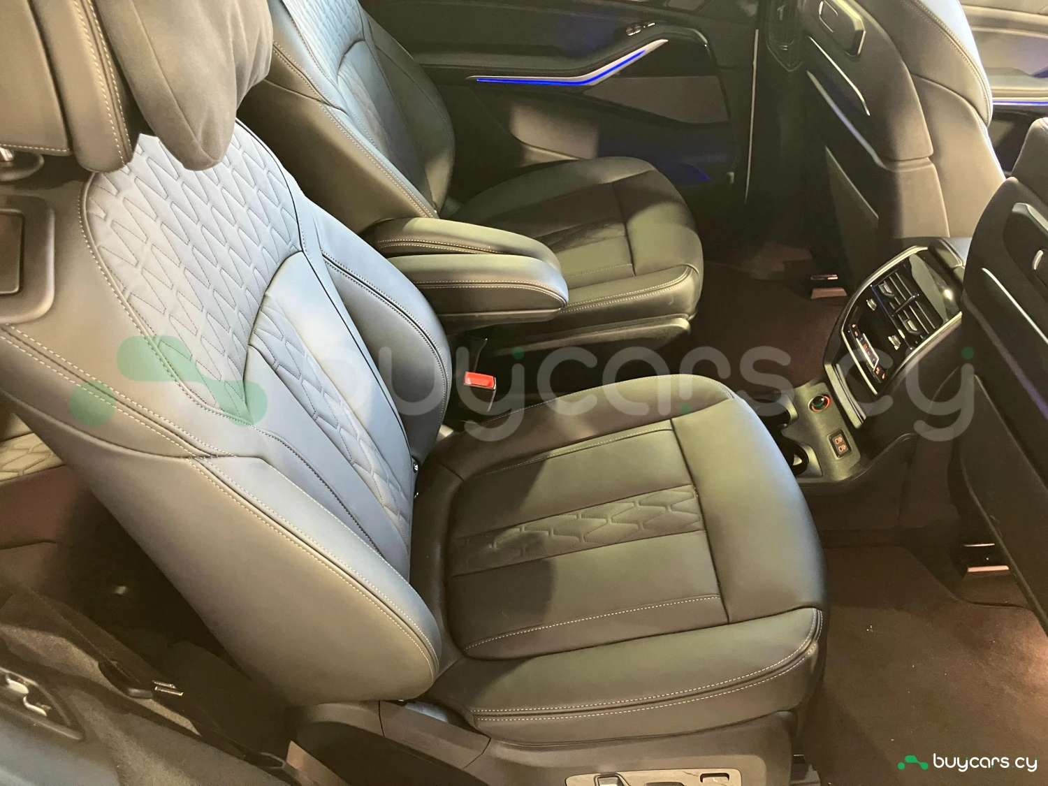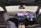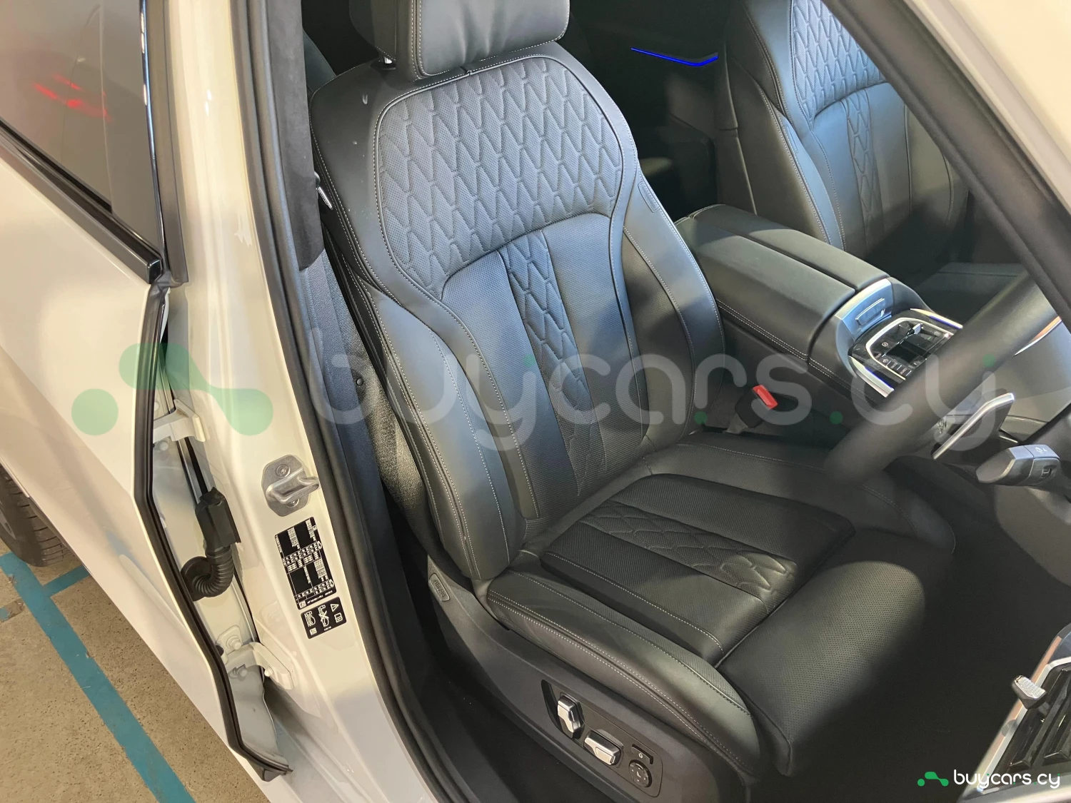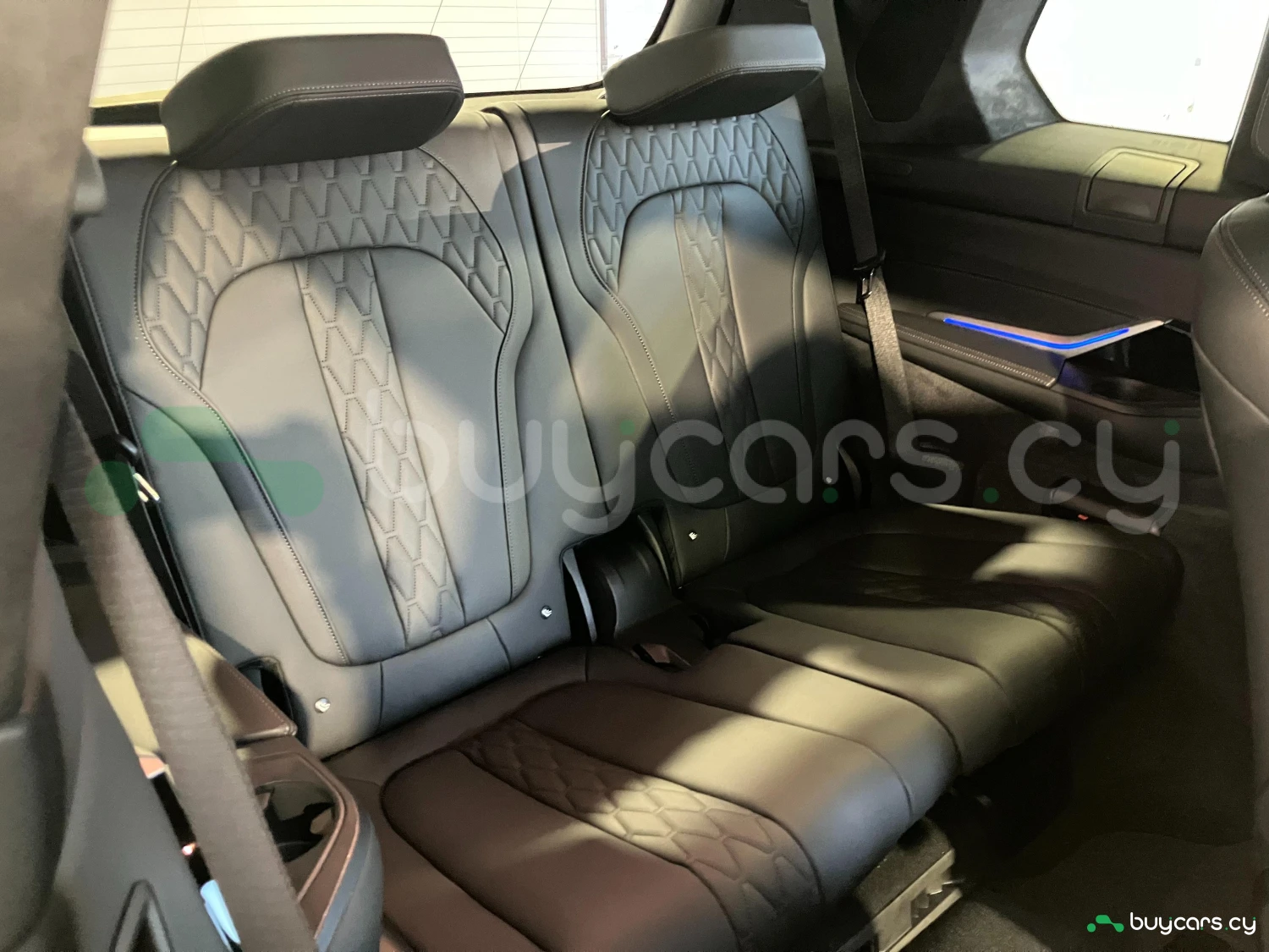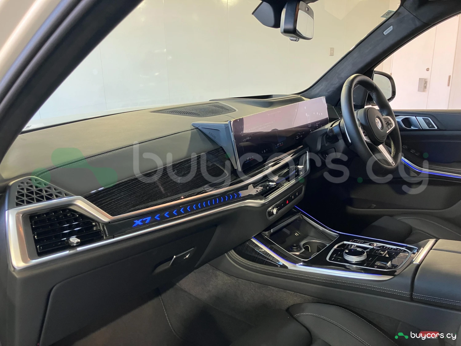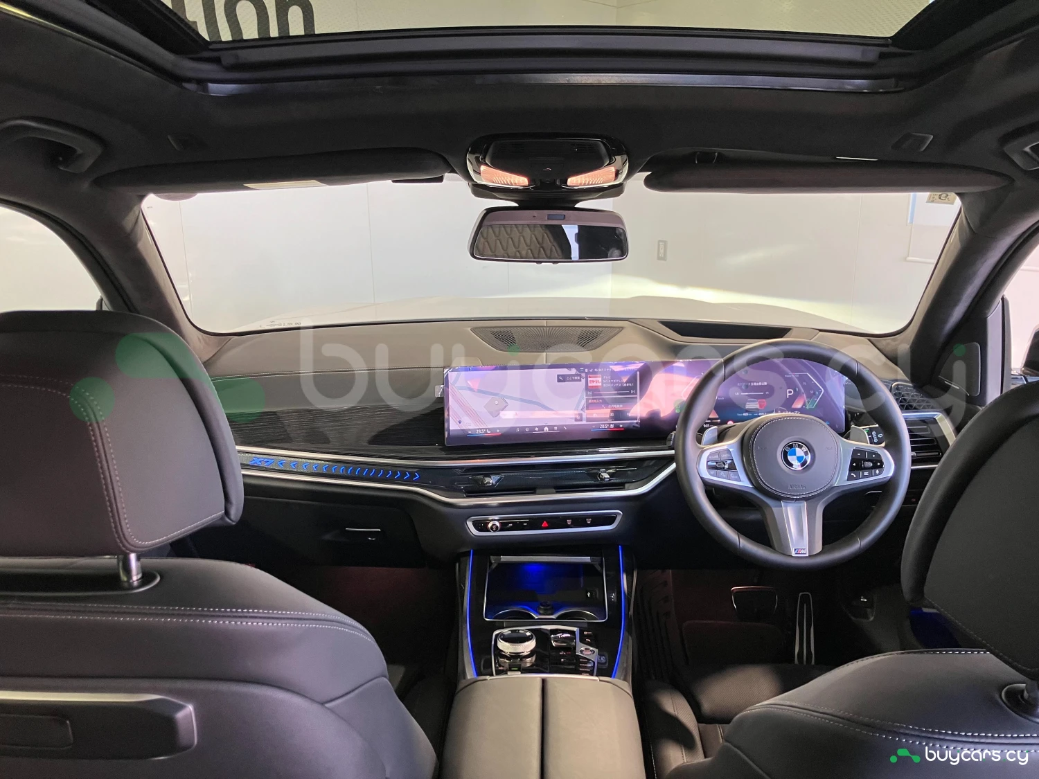 The cabin of the X7 xDrive40d M Sport offers 7-seat configuration with luxurious touches and sporty accents. Upholstery in Merino leather, M-specific details, ambient lighting, and premium materials create a refined environment. The BMW Curved Display merges a 12.3-inch instrument cluster and a 14.9-inch infotainment screen running iDrive 8.5, supporting wireless Apple CarPlay and Android Auto. Features also include a panoramic sunroof, four-zone climate control, heated and ventilated front seats, and a Harman Kardon premium sound system.
