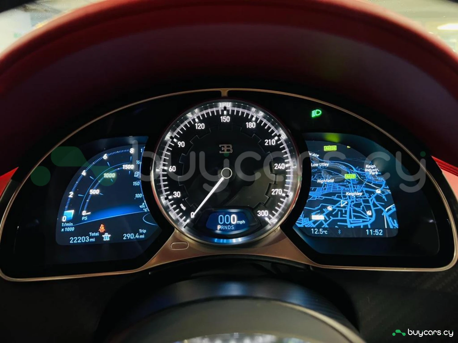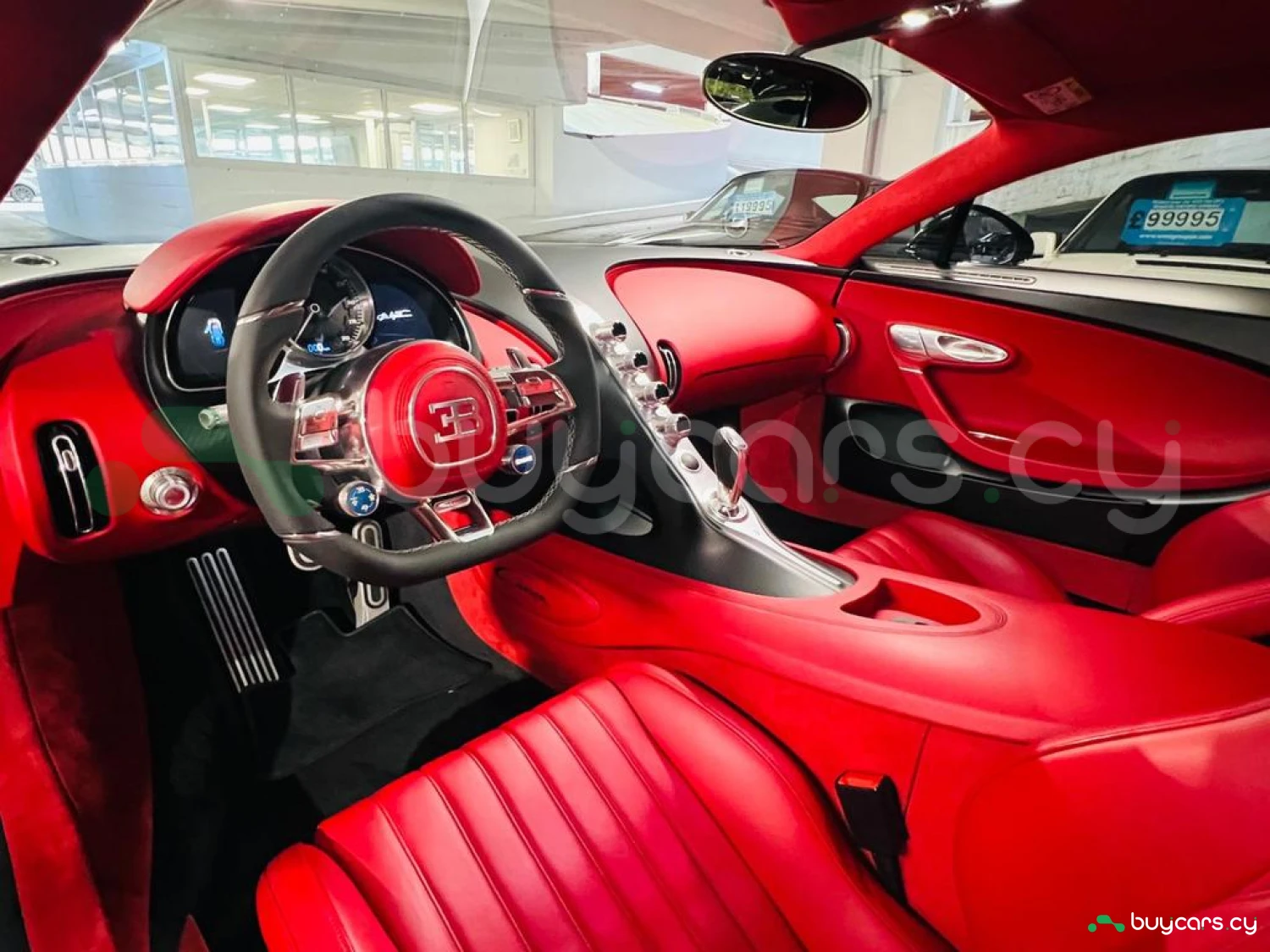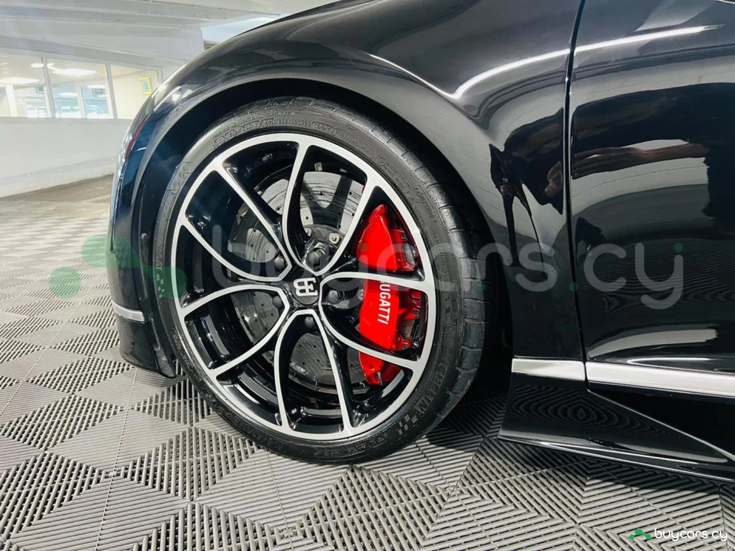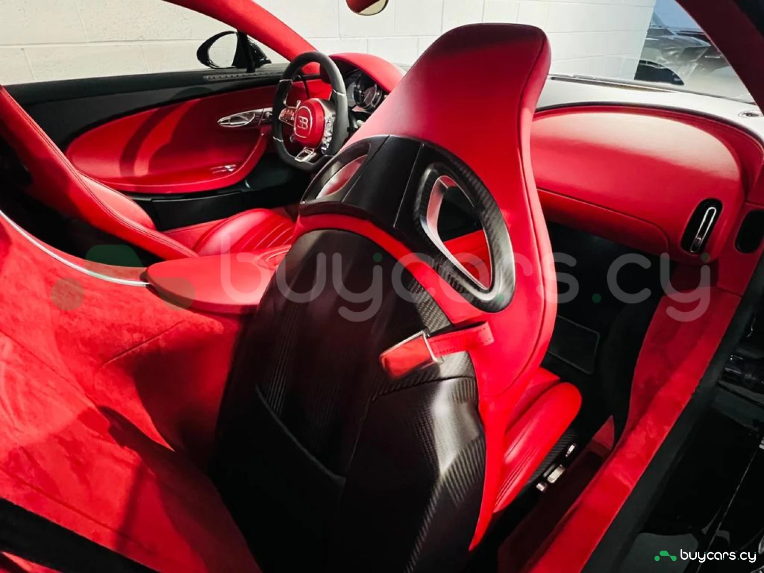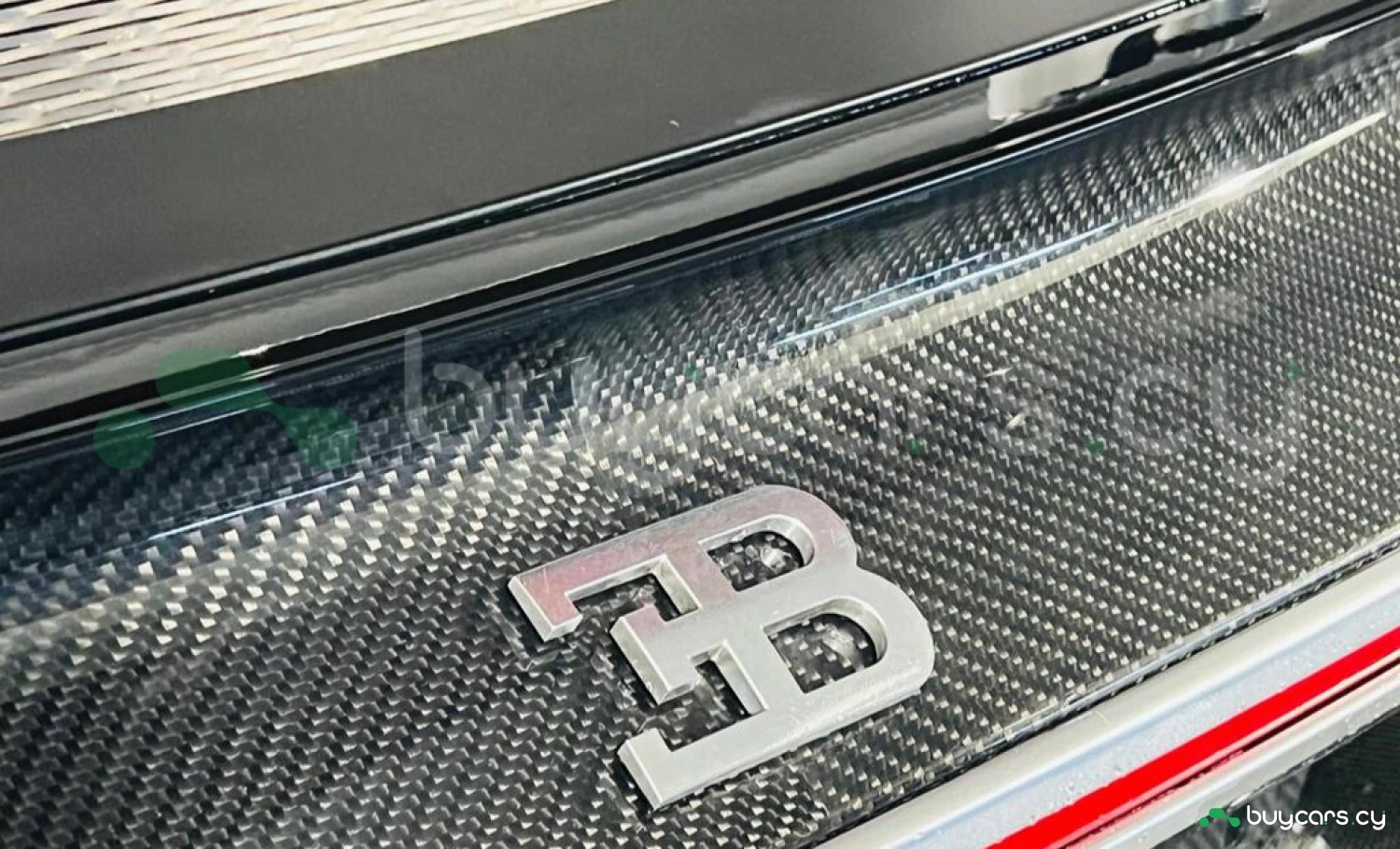 Performance & Handling: Iconic Bugatti engineering, powerful W16 engine (details not specified), diamond-cut alloy wheels, red brake calipers, two-tone rear wing.