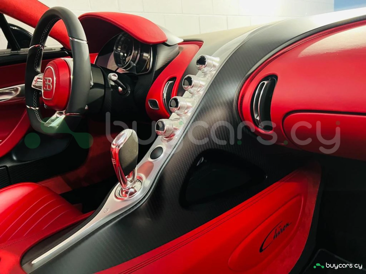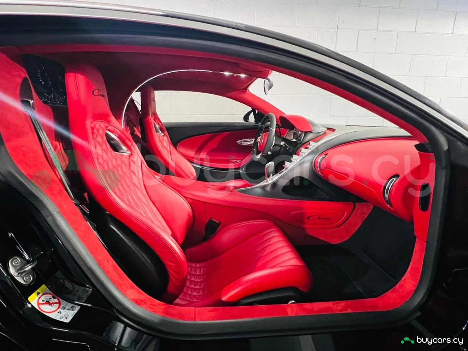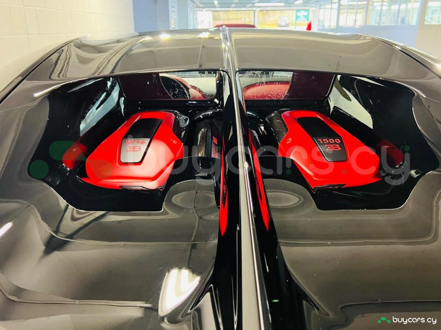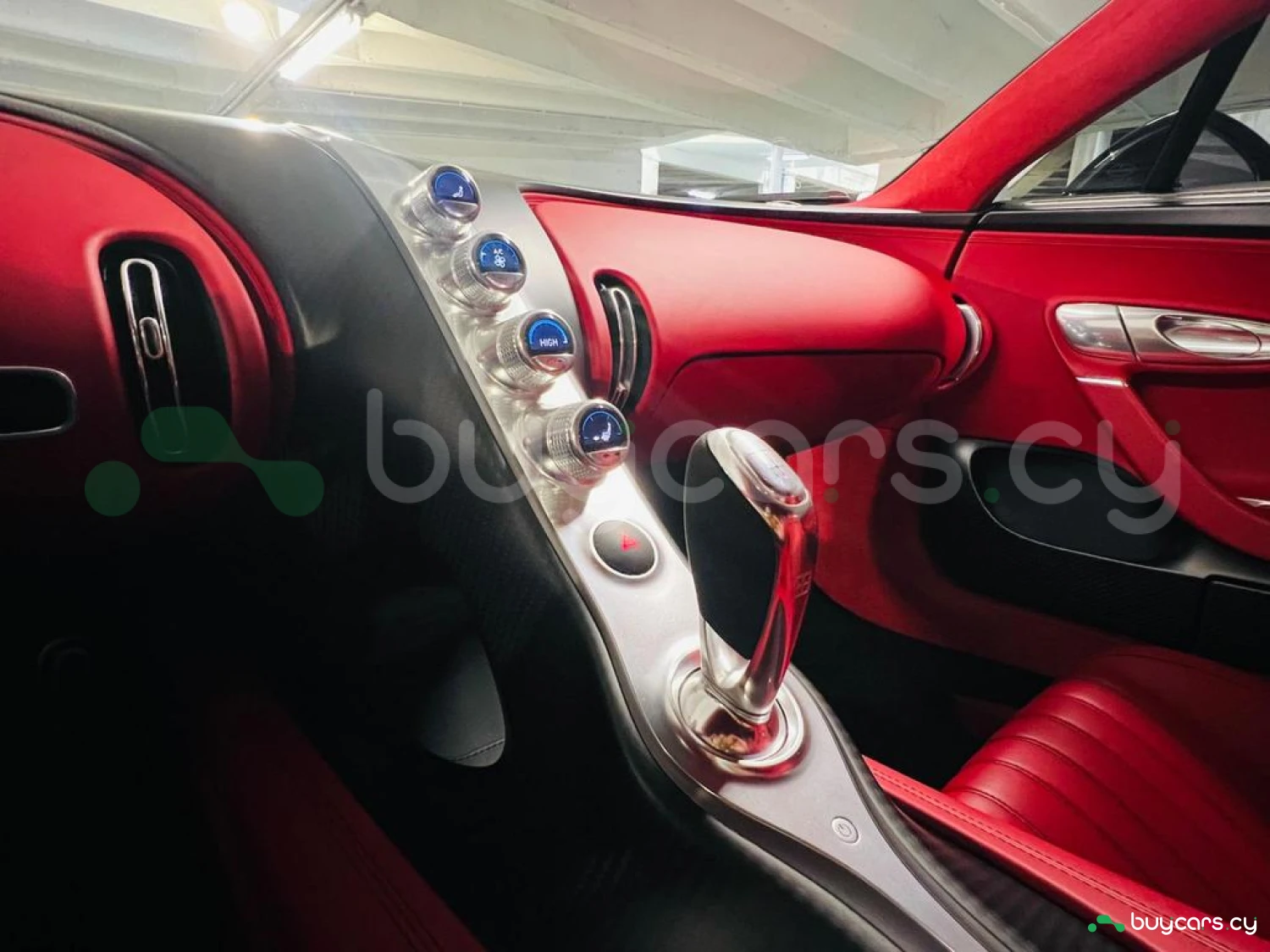 Performance & Handling: Iconic Bugatti engineering, powerful W16 engine (details not specified), diamond-cut alloy wheels, red brake calipers, two-tone rear wing.
