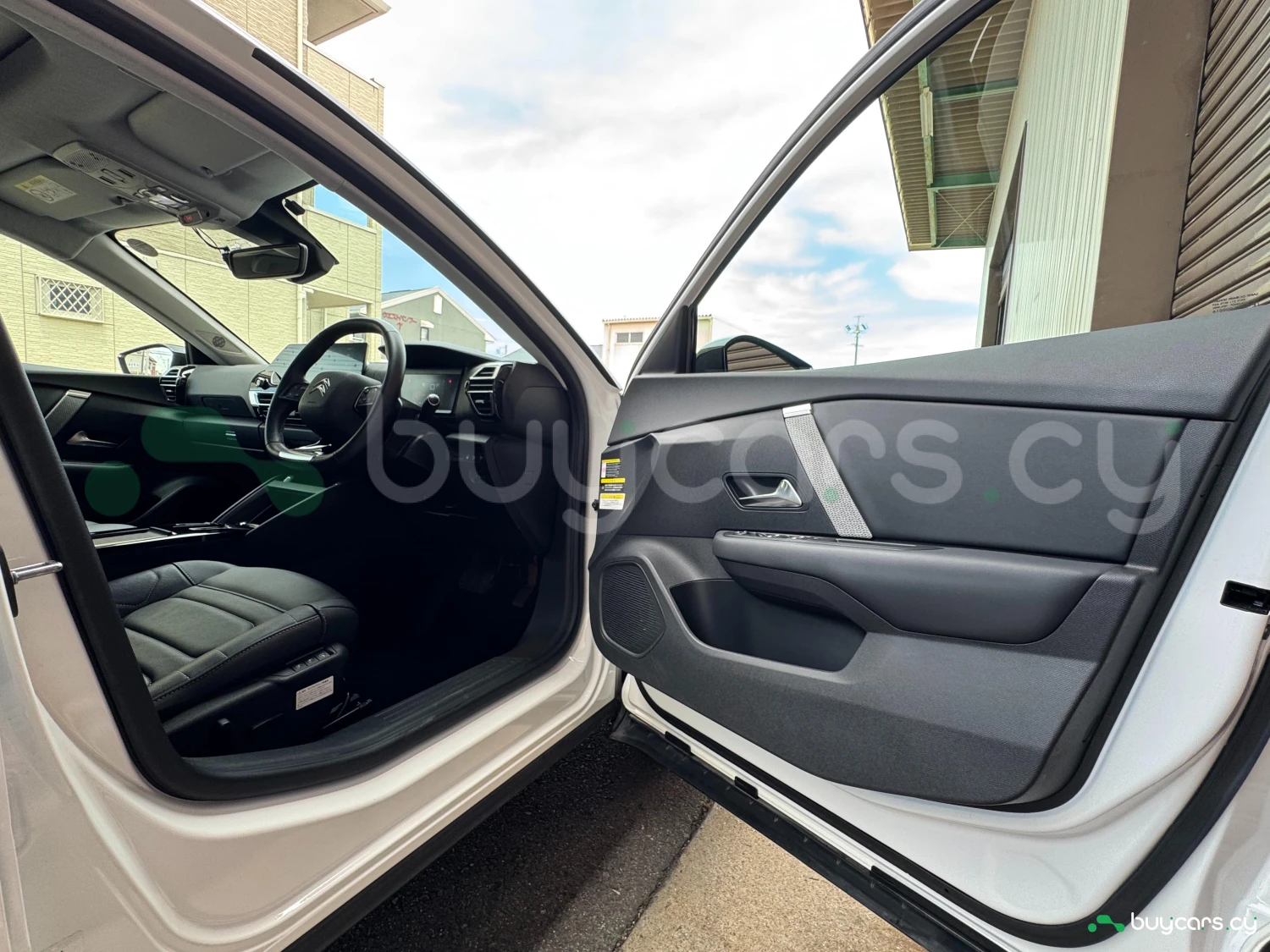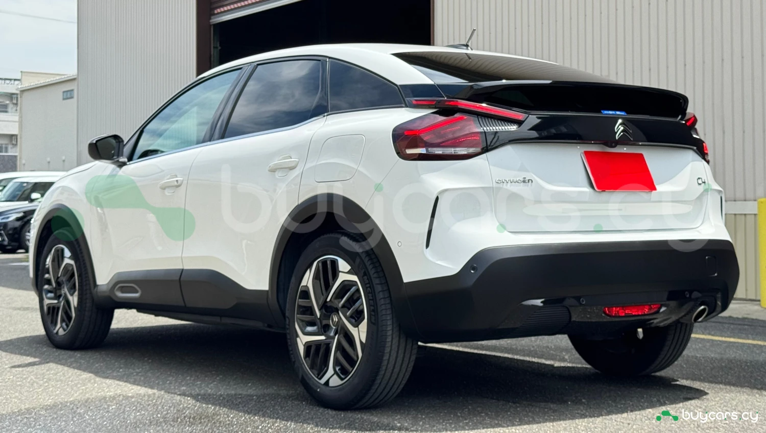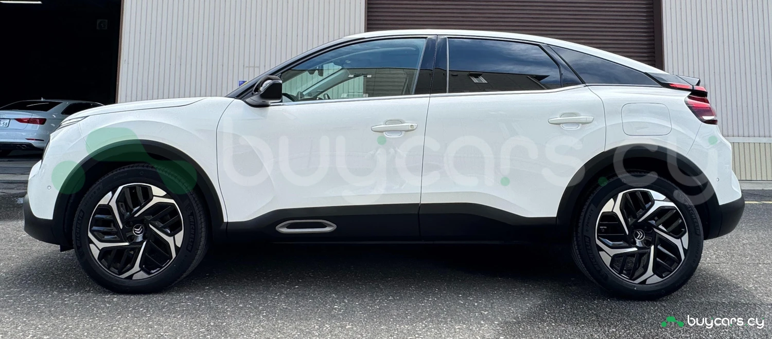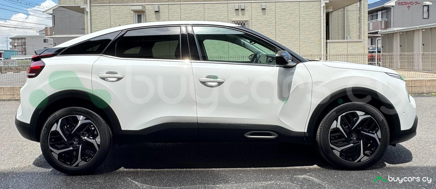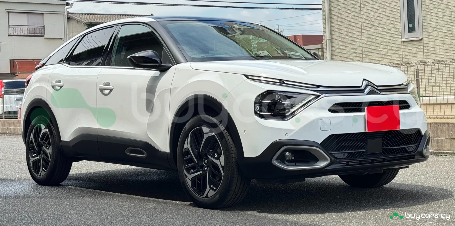 The 2023 Citroën C4 Shine in white presents a modern and sleek design, featuring signature LED lighting and a distinctive front grille. The vehicle is equipped with 18-inch alloy wheels, enhancing its dynamic appearance.