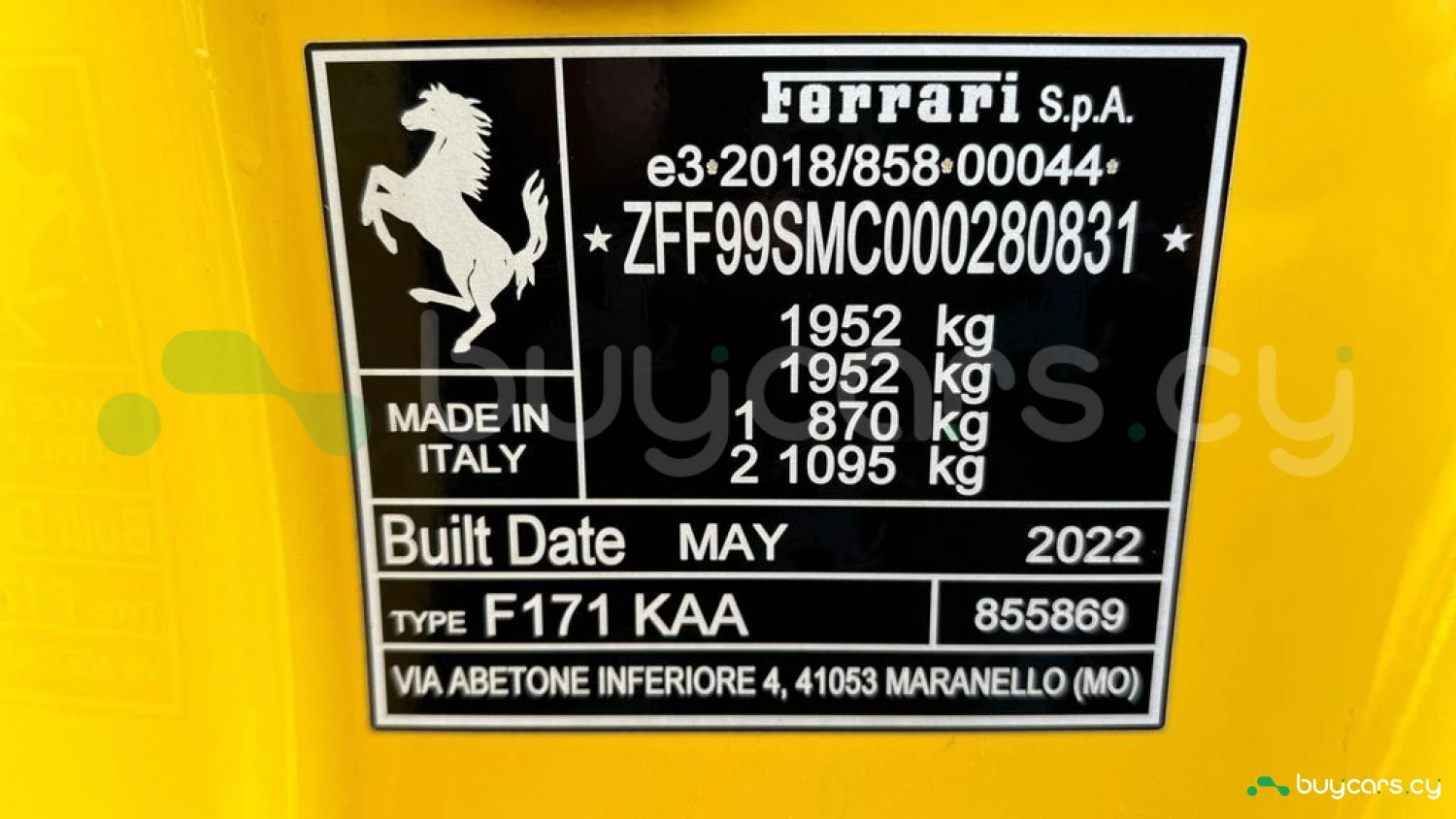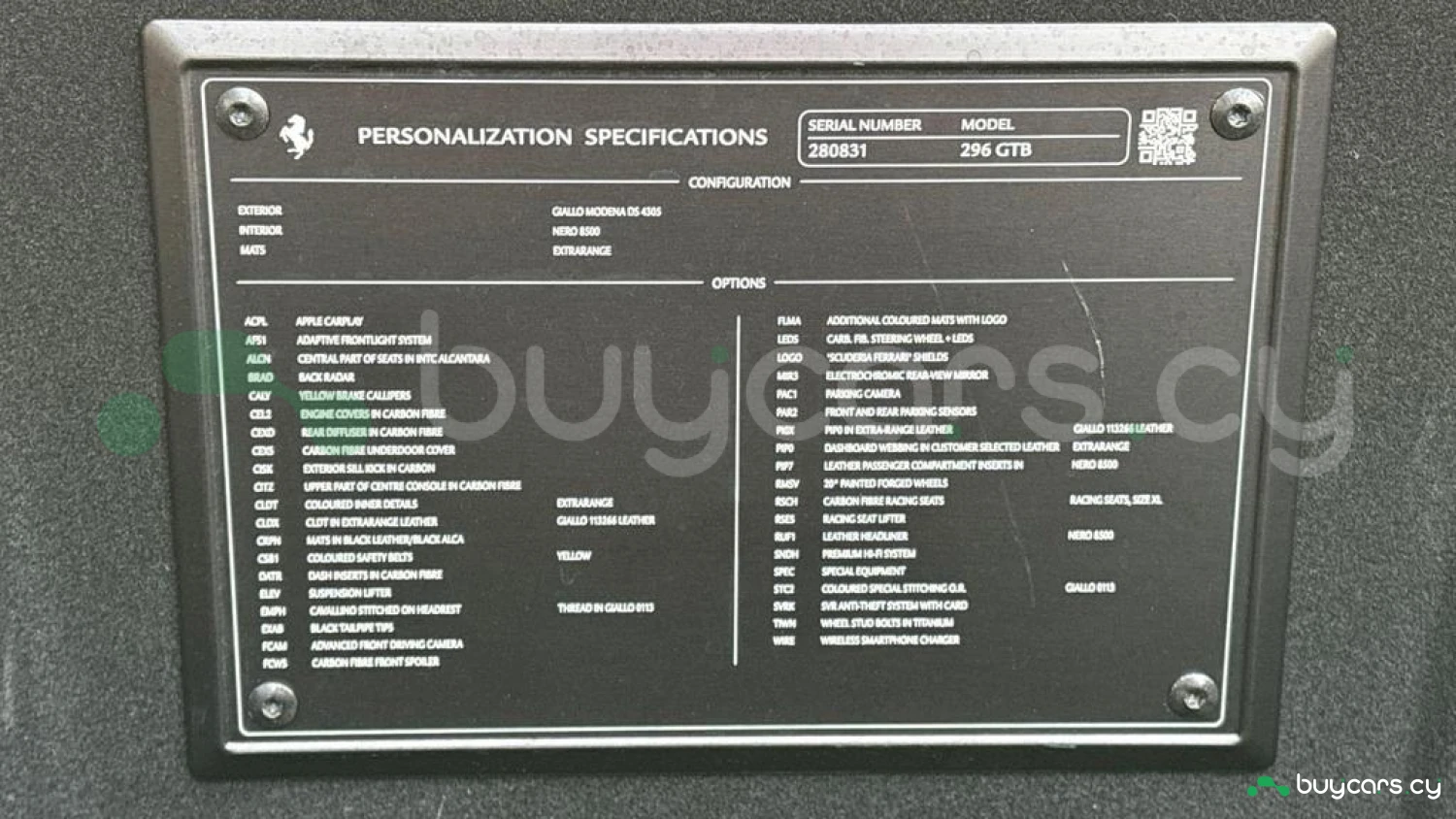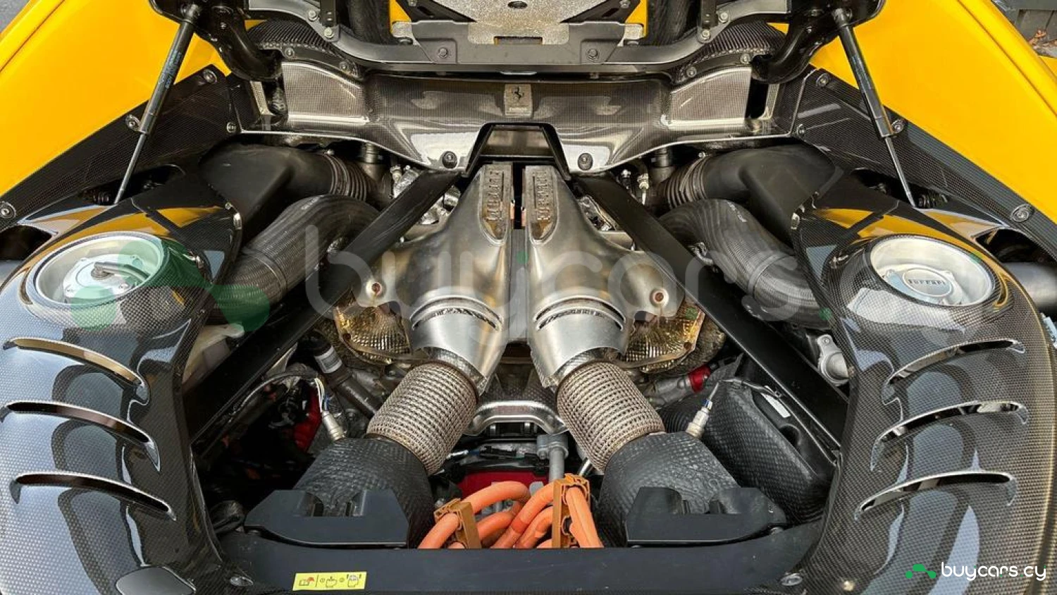 Exterior & Wheels: Giallo Modena Exterior, 20in Die-Cast Alloy Wheels, Titanium Wheel Bolts, Yellow Brake Calipers, Front Bumper Insert in Carbon Fibre, Rear Diffuser in Carbon Fibre, Engine Covers in Carbon Fibre, Scuderia Ferrari Shields.