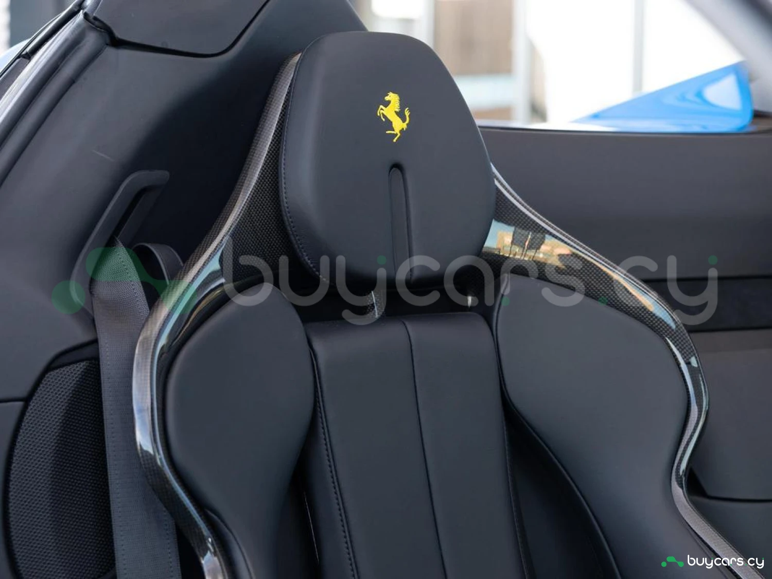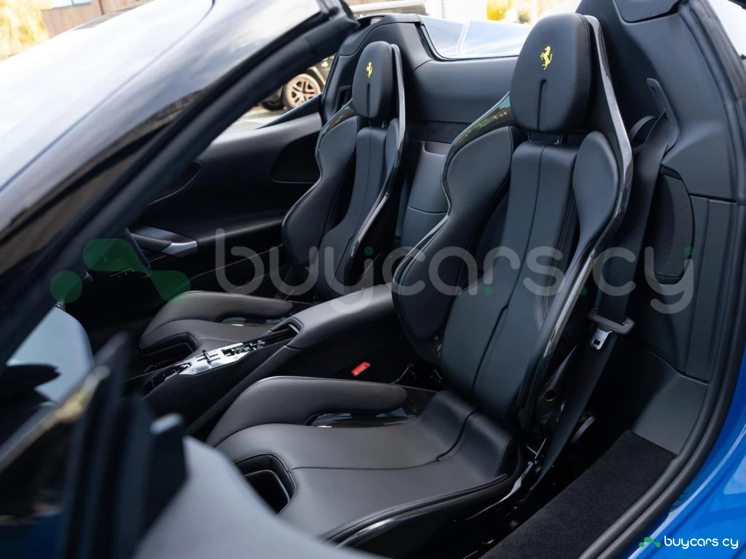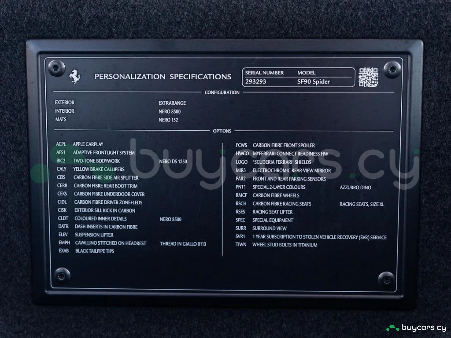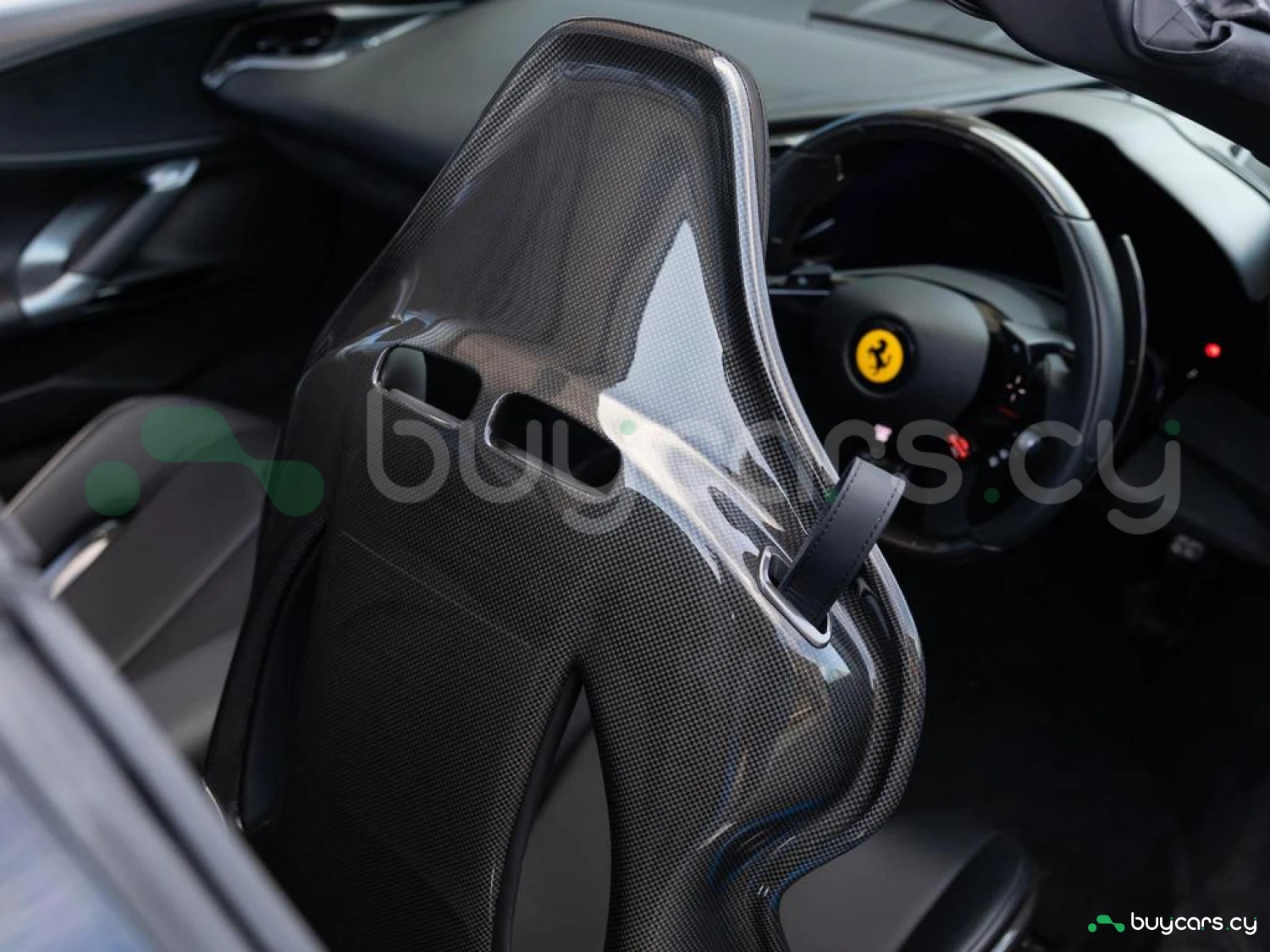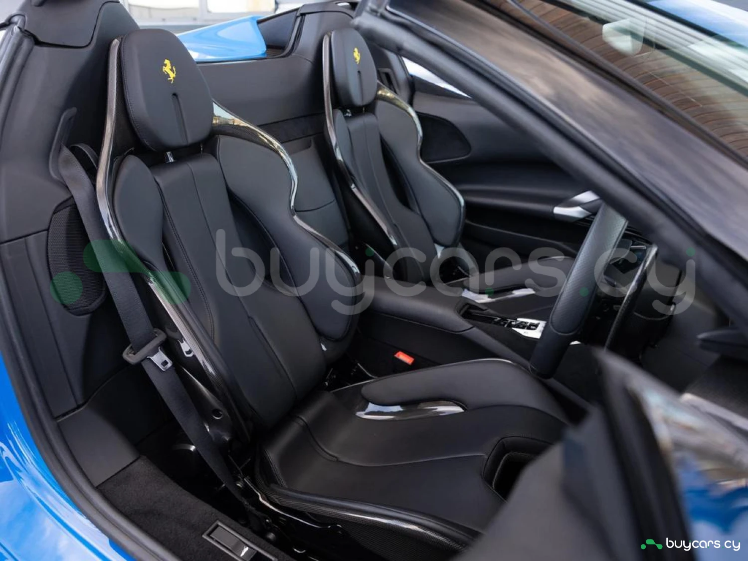 Interior & Comfort: XL Carbon Fibre Racing Seats with Lifter, Cavallino Stitched on Headrests in Giallo (Yellow), Carbon Fibre Driver Zone + LEDs, Carbon Fibre Dash Inserts, Carbon Fibre Door Sills, Black Leather Interior, Dual-Zone Climate Control, Engine Start Button on Steering Wheel, Keyless Start.