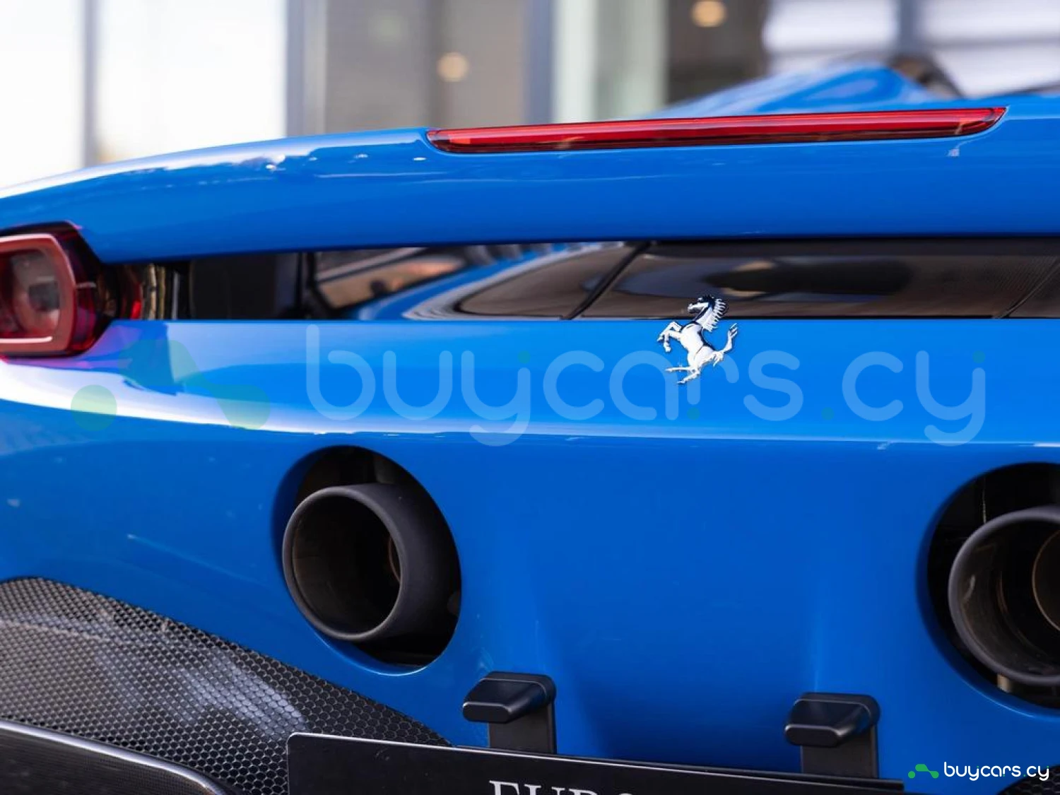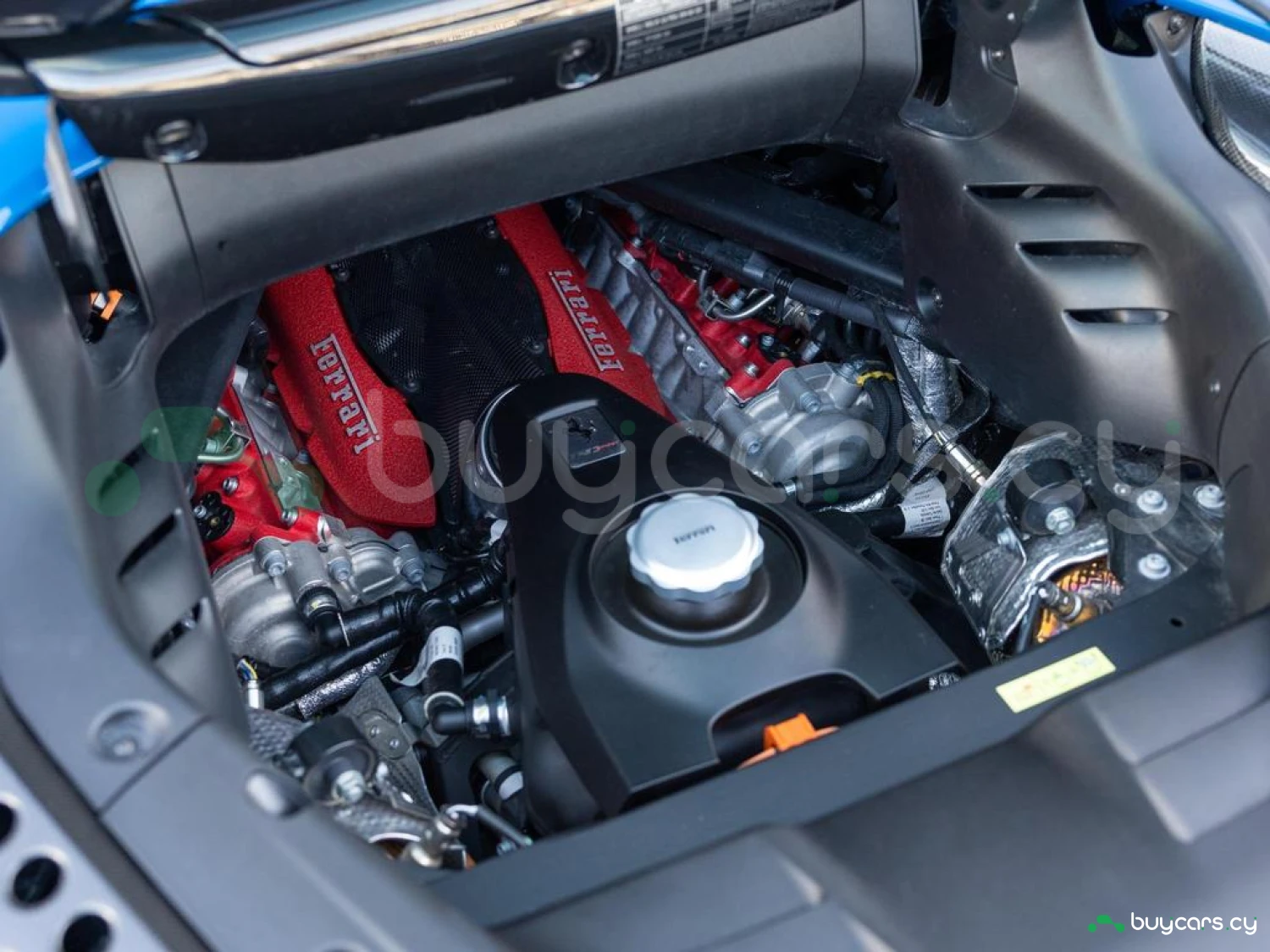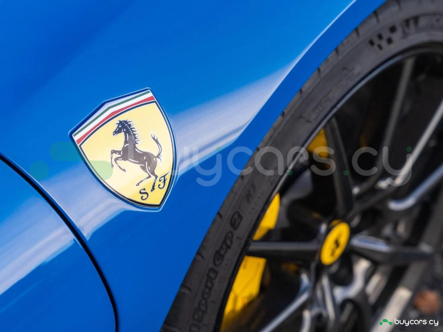Exterior & Wheels: 20" Carbon Fibre Wheels, Carbon Fibre Front Spoiler, Carbon Fibre Side Air Splitter, Carbon Fibre Exterior Sill Kick, Carbon Fibre Rear Boot Trim, Two-Tone Bodywork with Nero DS Painted Roof, Full Paint Protection Film (PPF) Applied, 'Scuderia Ferrari' Shields, Black Tailpipe Tips, Azzurro Dino Exterior Paint, Car Protection Cover.