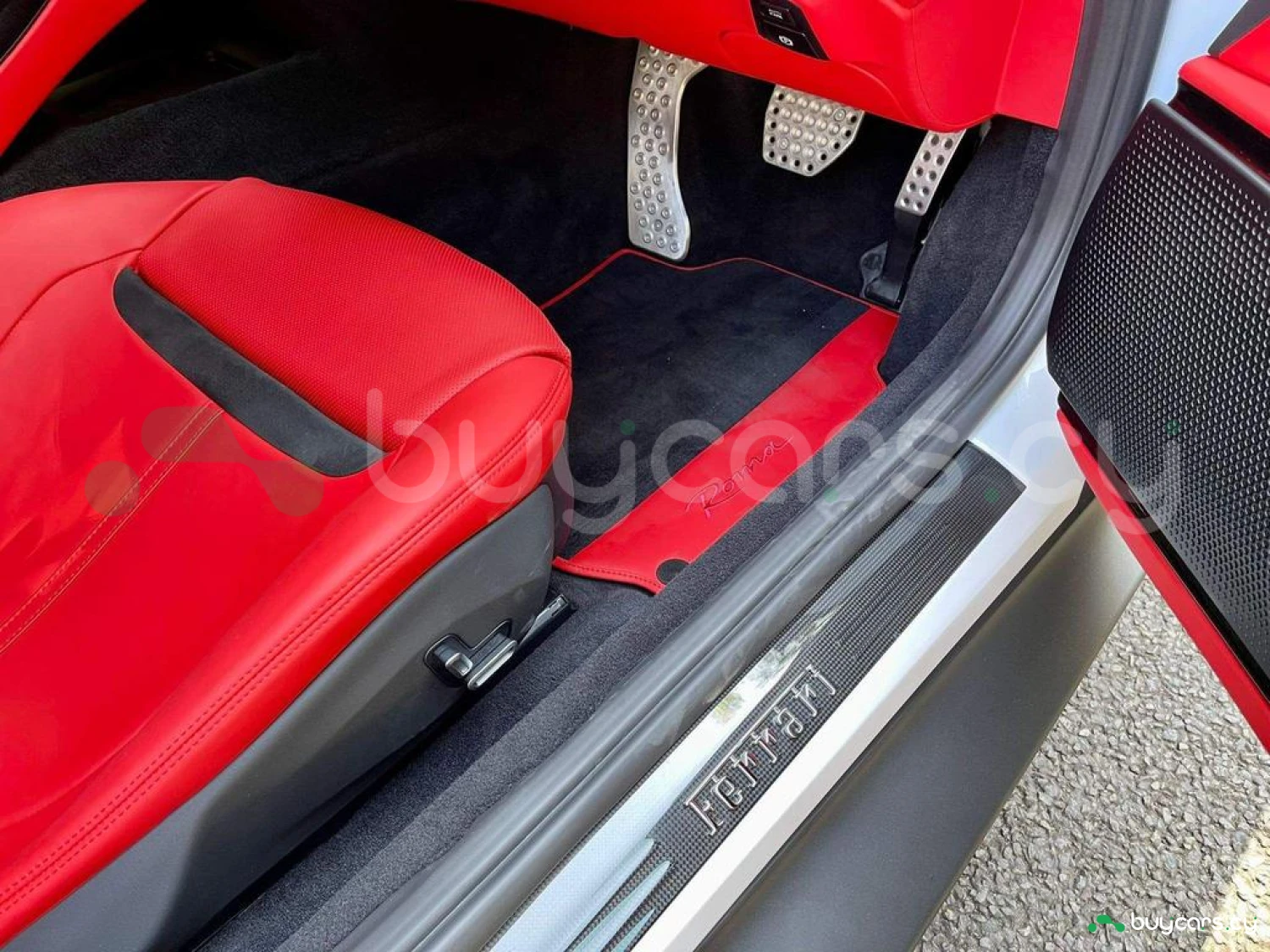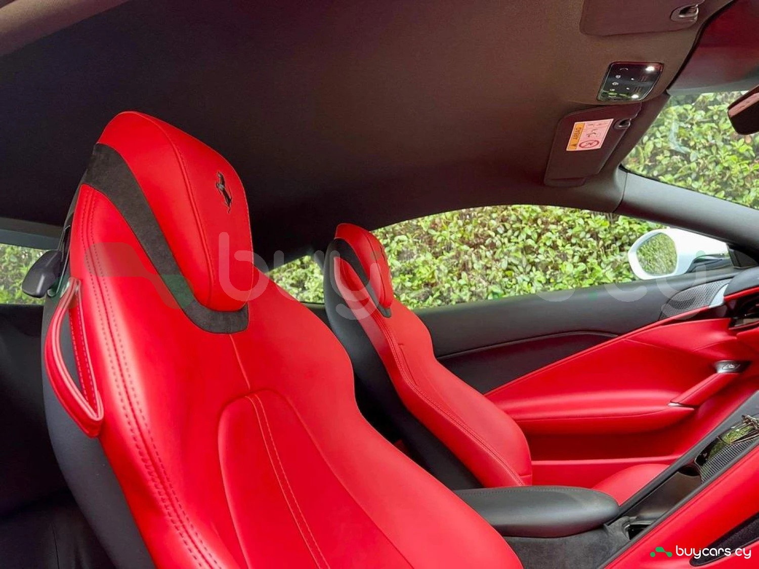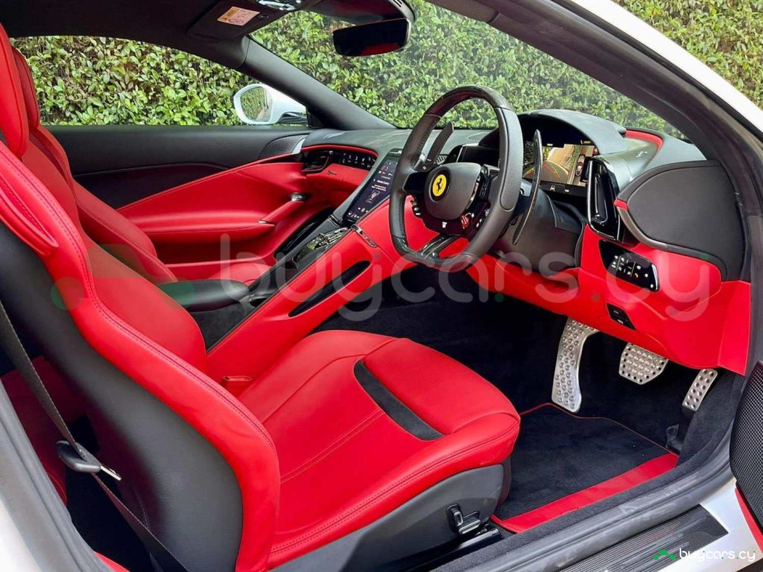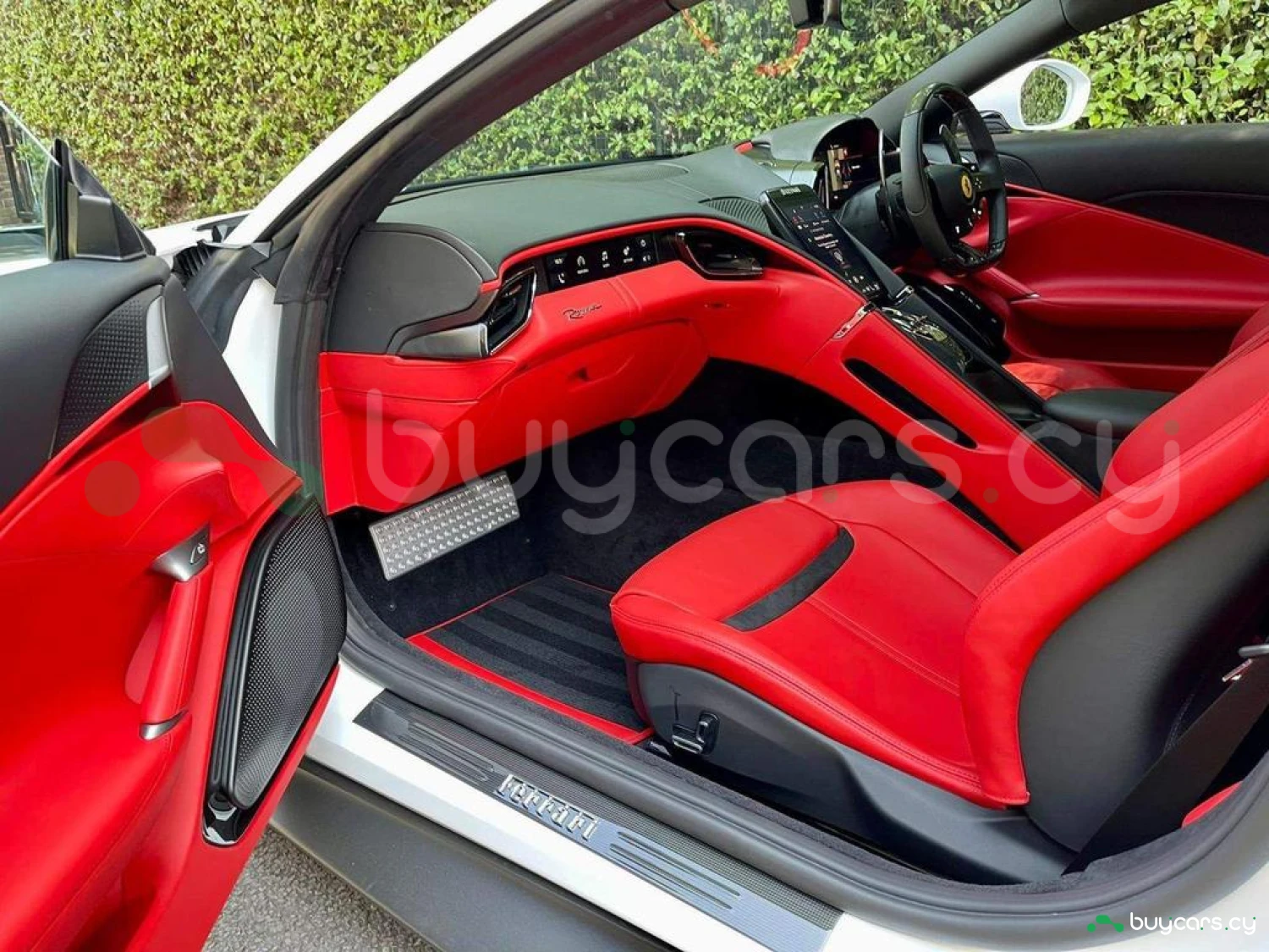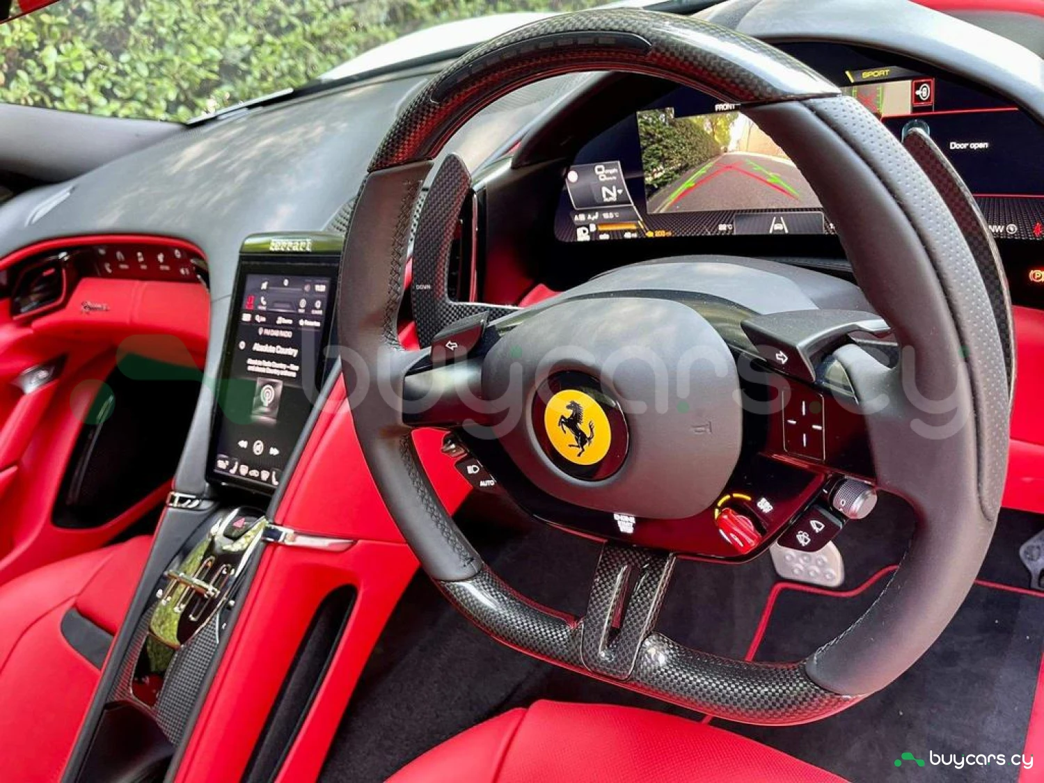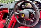 Interior & Comfort: Rosso Ferrari Full Leather Interior, Carbon Fibre Steering Wheel with LEDs, Passenger Display, Carbon Fibre Upper Tunnel, Colour Upon Request for Interior Leather Inserts, Electrochromic Frameless Interior Mirror, Dual-Zone Air Conditioning System, Keyless Engine Start System, Embroidered Prancing Horse on Headrests, Foot Rest in Aluminium, Foldable Rear Seat Backrest, Floor Mats with Embroidered Logo, 16-inch Full Digital Instrument Cluster, Full Electric Seats.