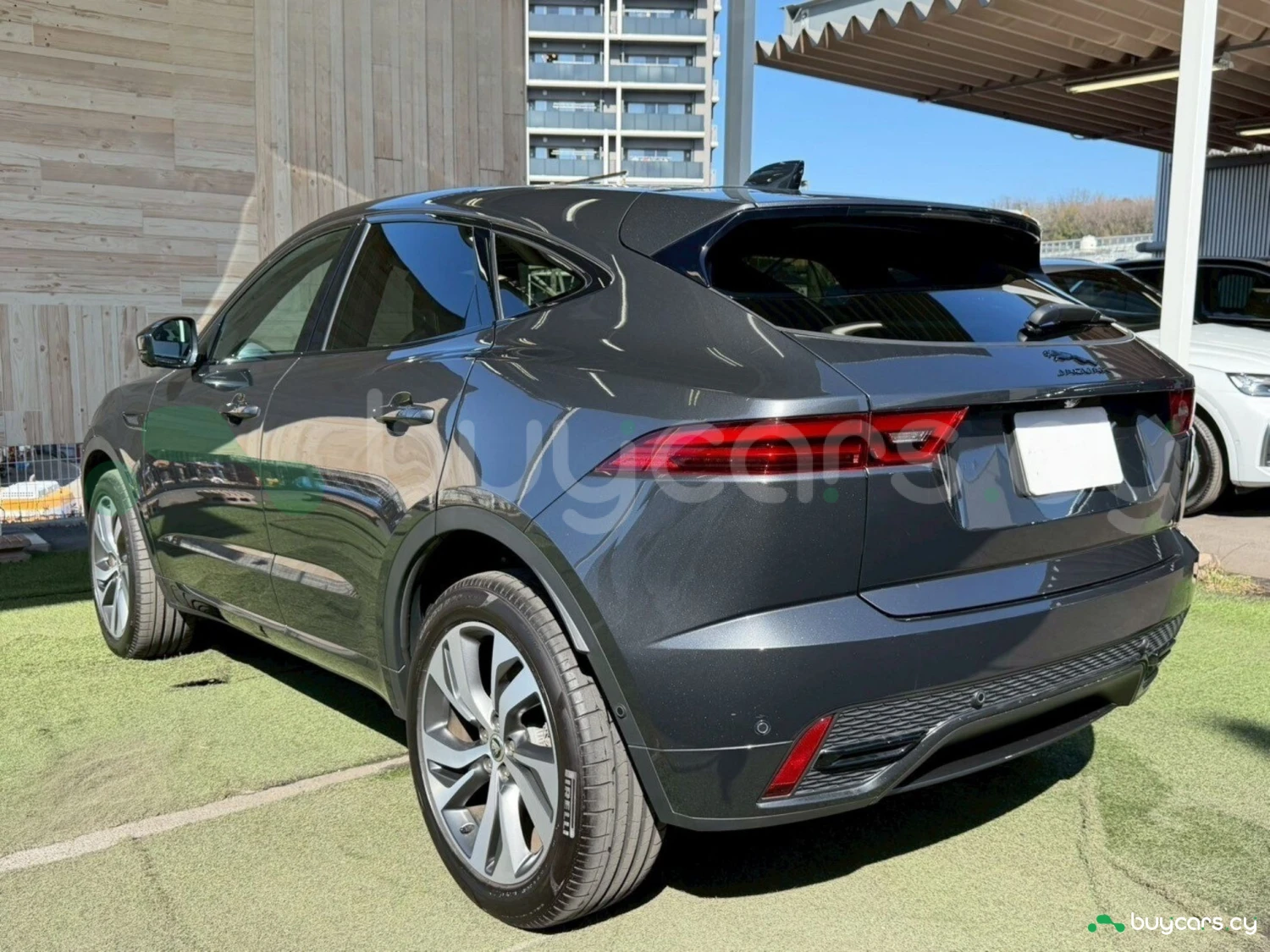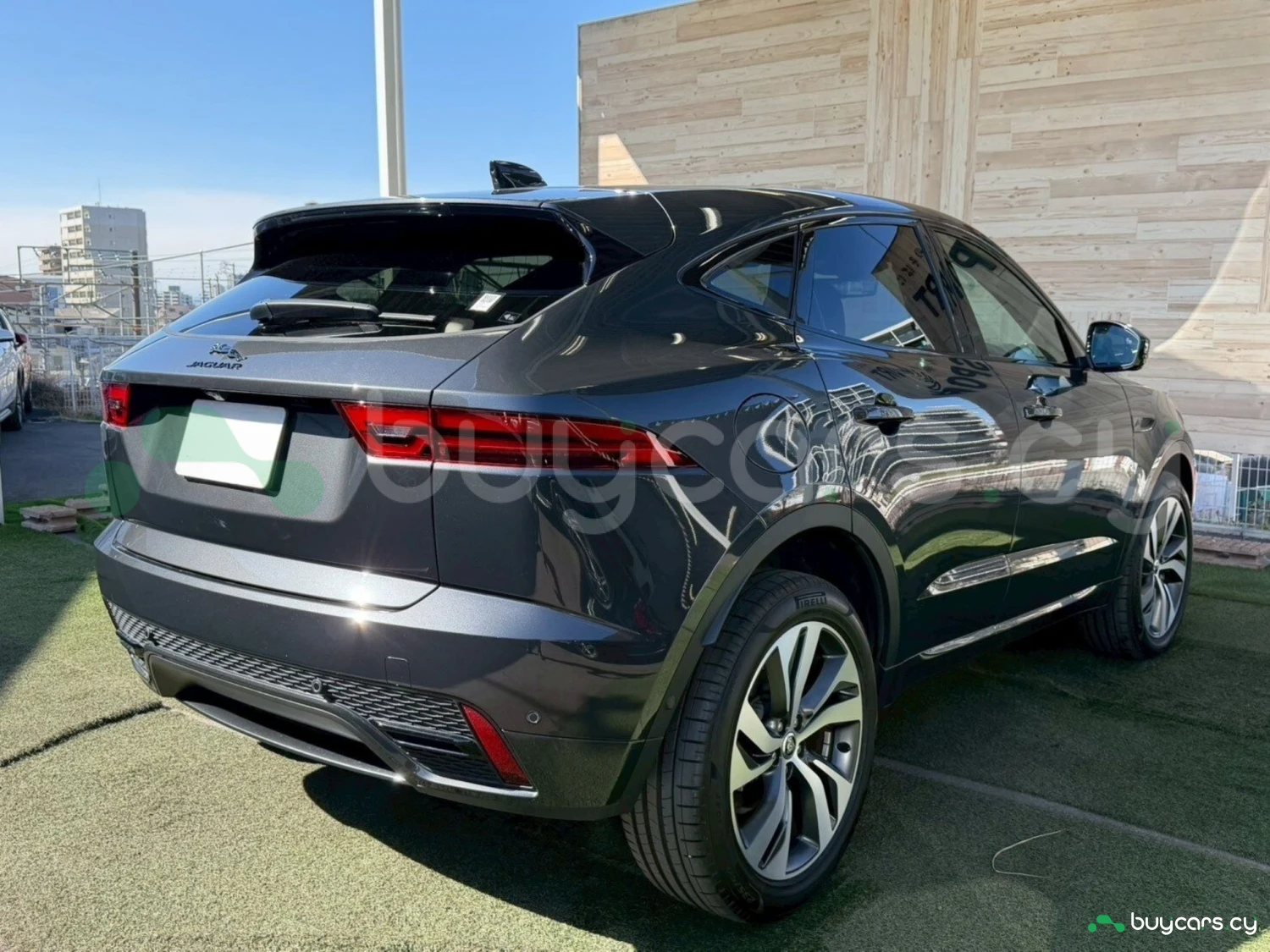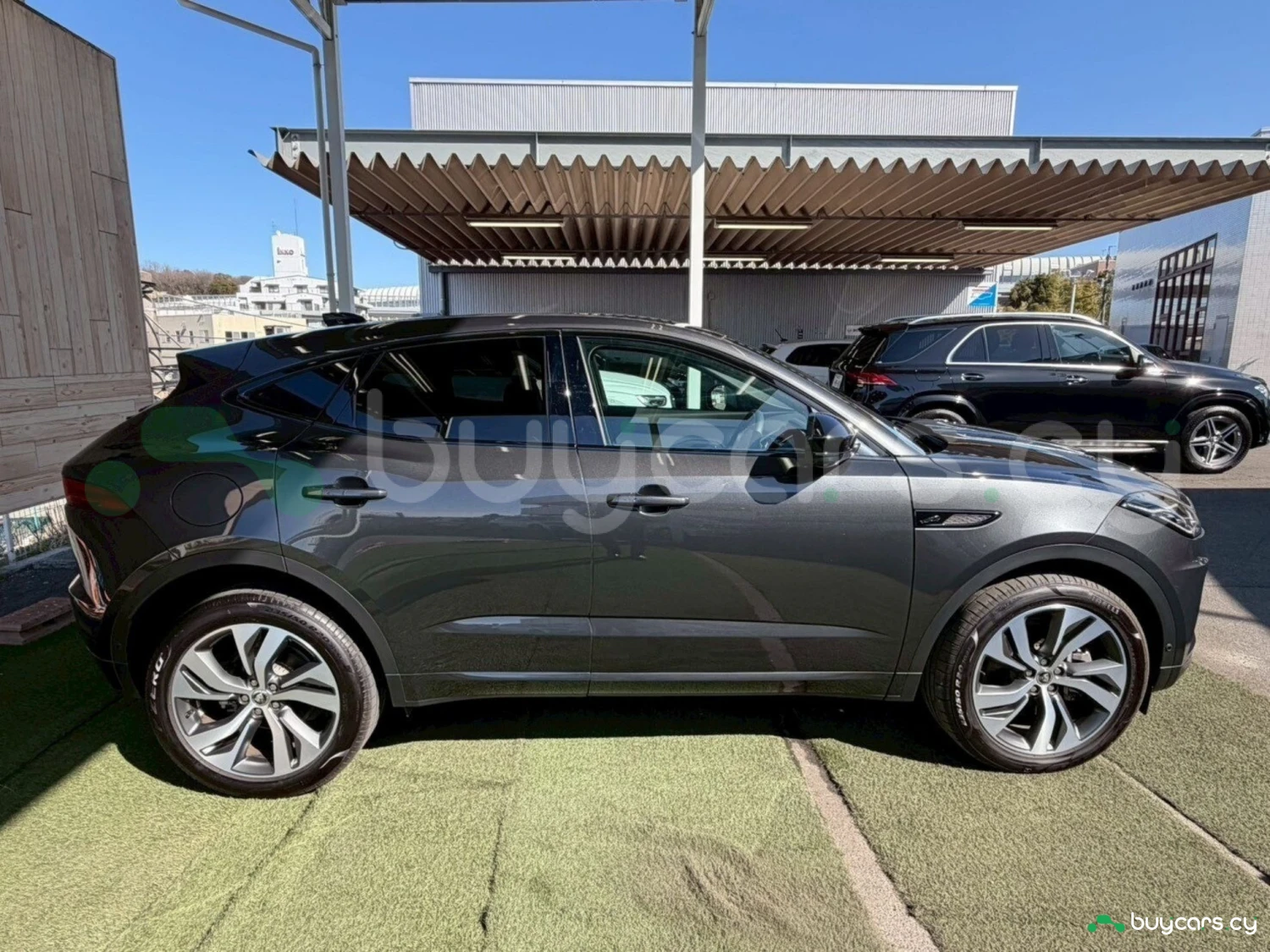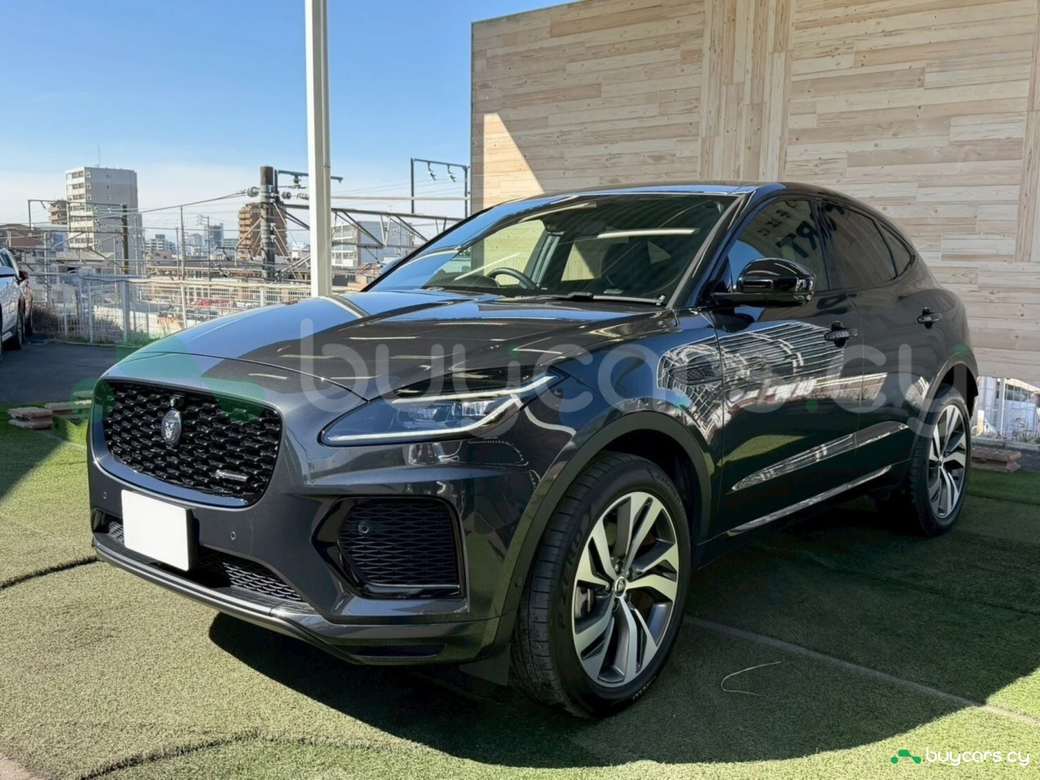This Jaguar E-Pace in Cyprus is presented as an off-road SUV in Carpathian Grey Premium Metallic. The exterior keeps a clean and upright body profile.