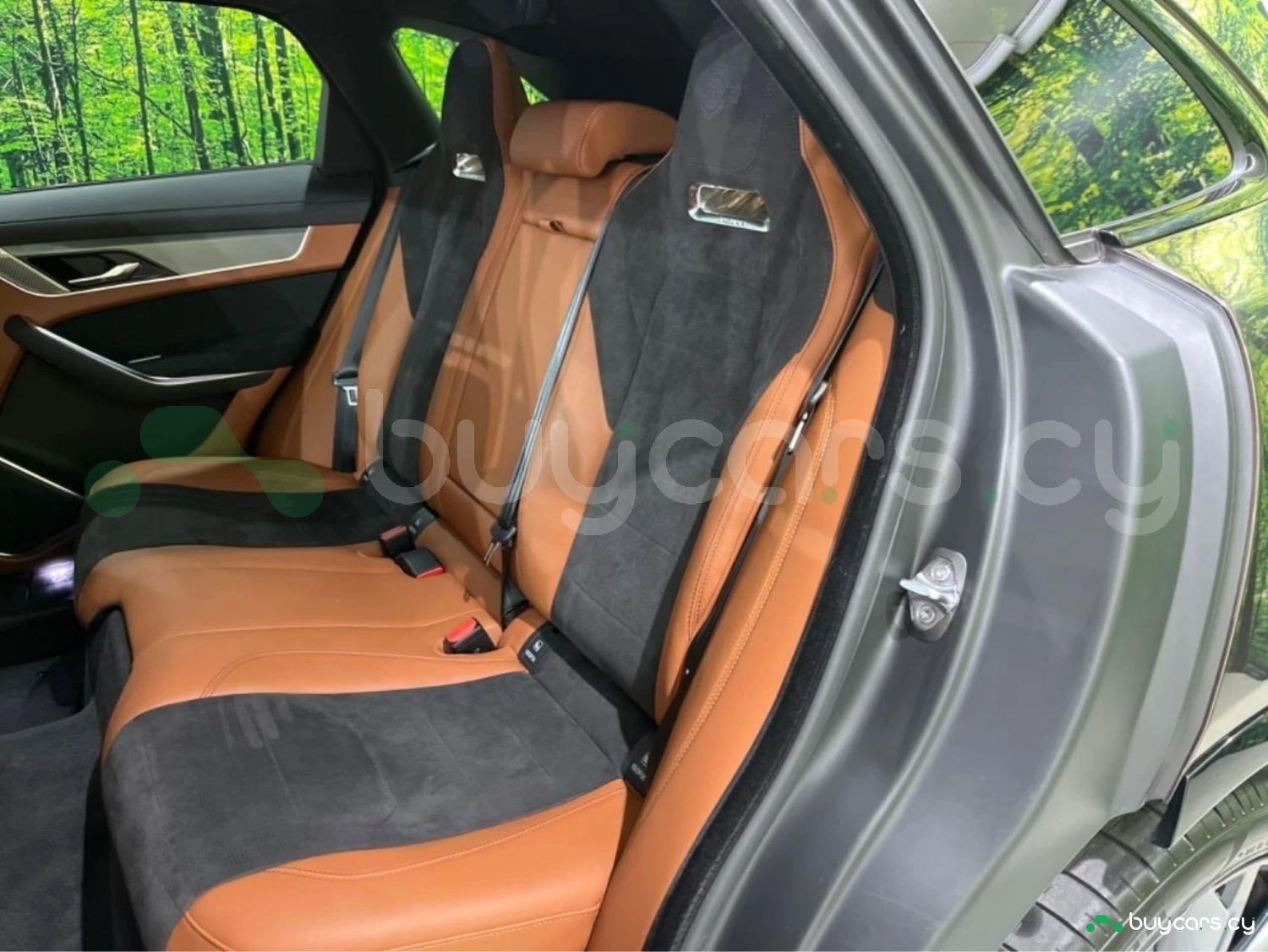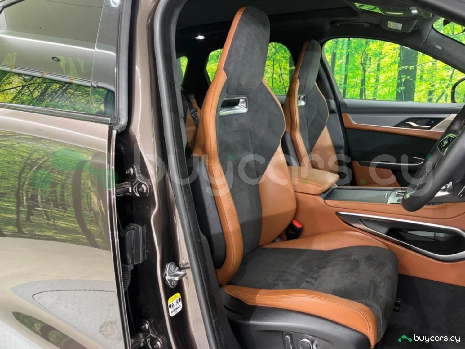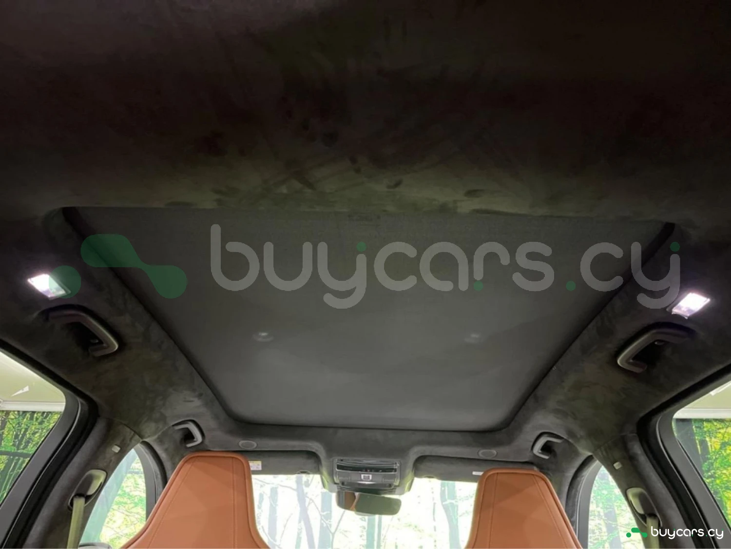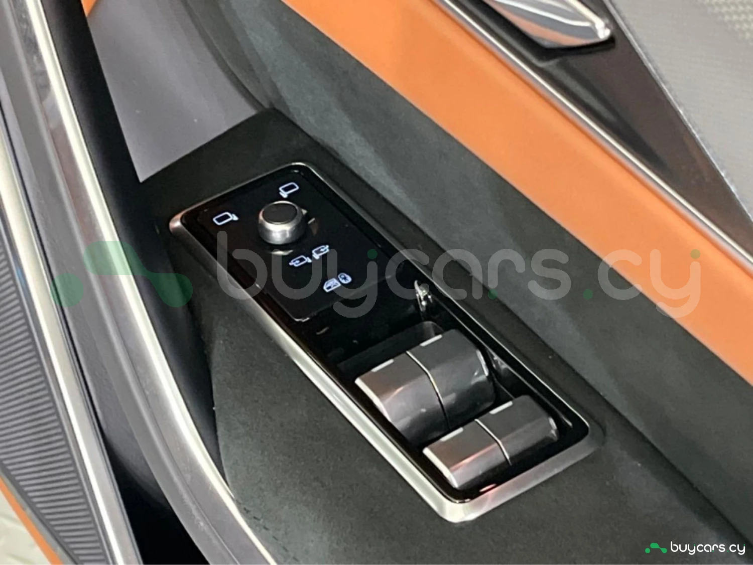 The cabin accommodates 5 passengers, featuring leather sports seats with heating and a panoramic glass roof. Comfort functions include a smart key system, navigation, and ergonomic seating.