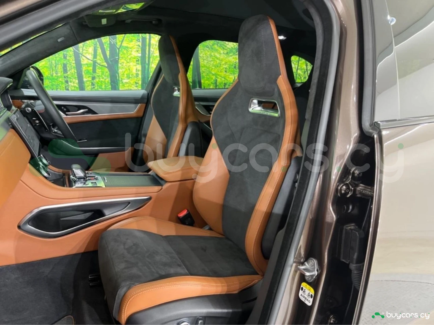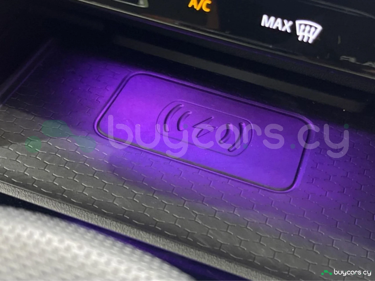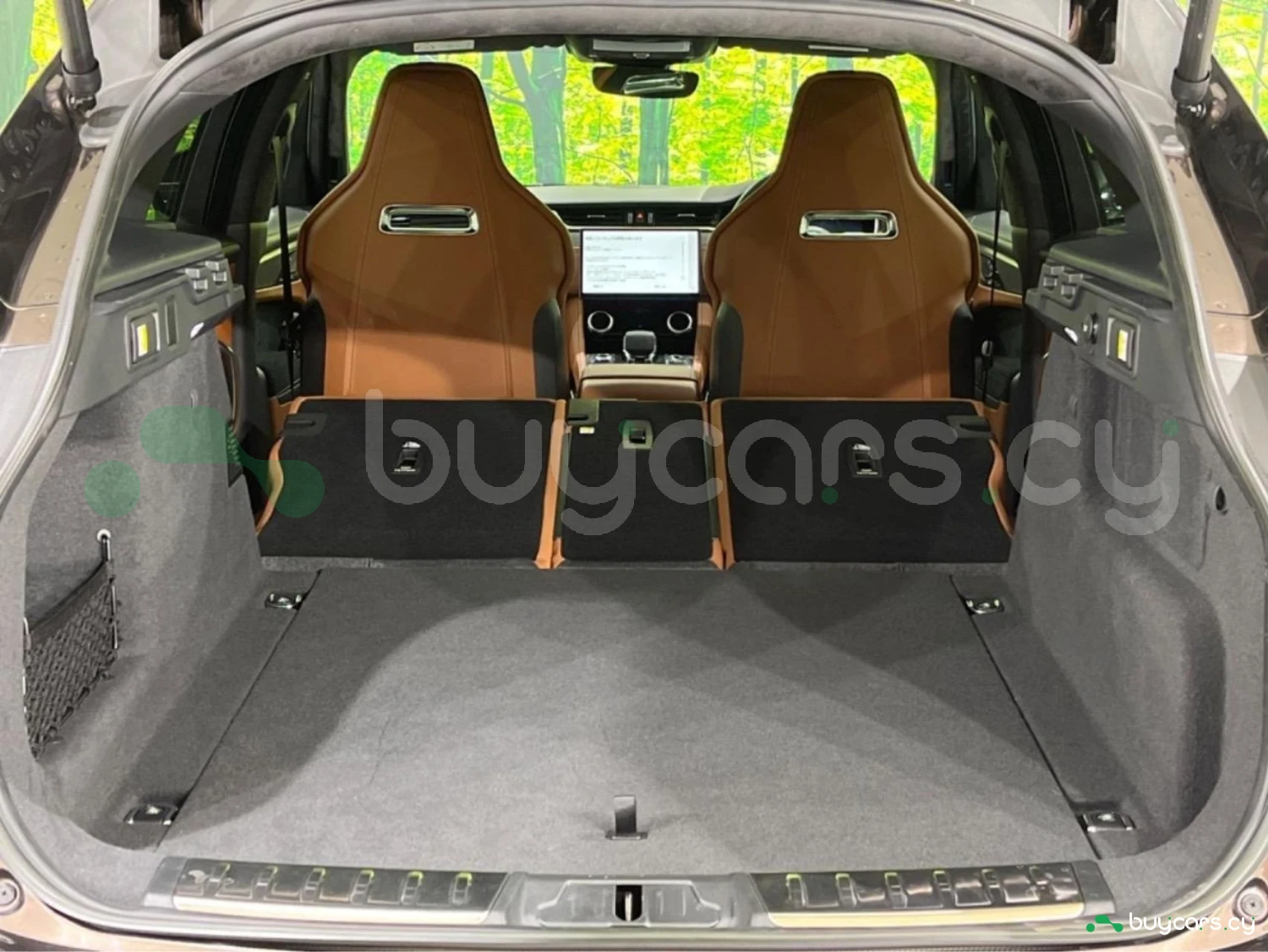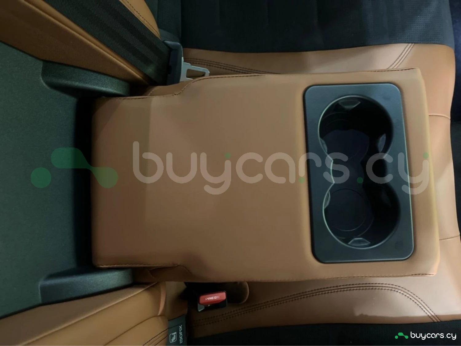 The cabin accommodates 5 passengers, featuring leather sports seats with heating and a panoramic glass roof. Comfort functions include a smart key system, navigation, and ergonomic seating.