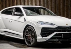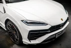 The 2025 Lamborghini Urus in white features a bold and elegant design, highlighted by 21-inch alloy wheels in Nivale shiny silver and brushed steel exhaust tailpipes. The vehicle also includes electric windows with one-touch operation, ensuring convenience and ease. The Matrix LED headlights provide superior illumination for a stylish yet functional look.