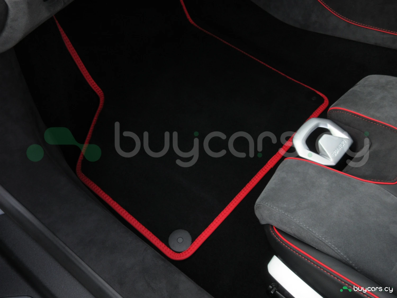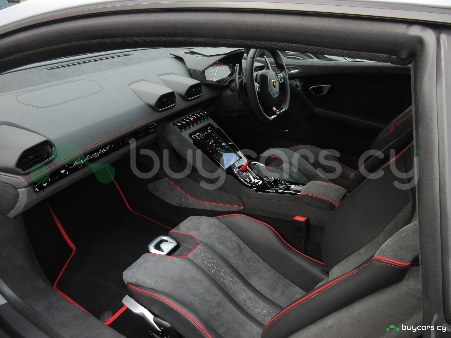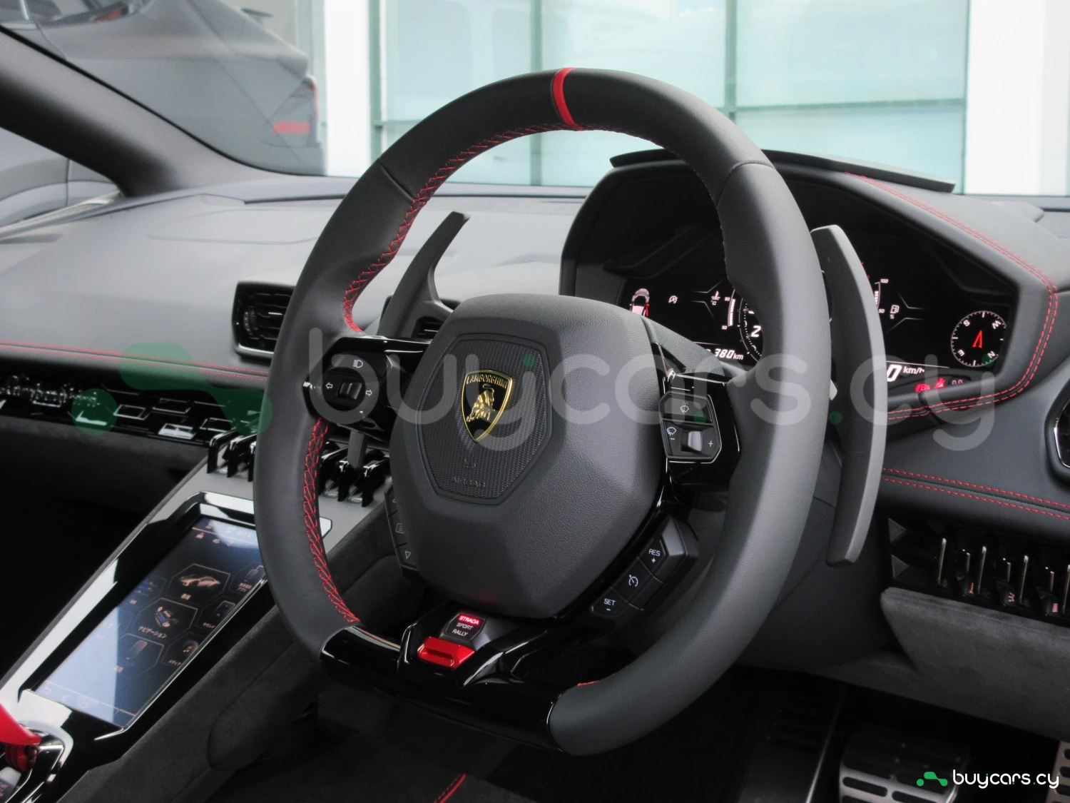 The exterior of the Huracán Sterrato is immediately striking with its raised stance, widened track, robust cladding, roof-mounted air intake, and front LED auxiliary lights. The bold Grigio Acheso finish underlines its off-road ambitions while maintaining unmistakable Lamborghini lines. 19-inch wheels wrapped in bespoke Bridgestone Dueler tires complete the aggressive and functional styling, ensuring it looks as potent as it drives.