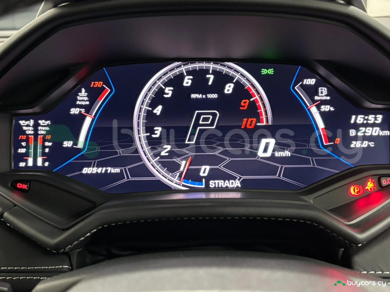 The cockpit is designed to place the driver at the center of the experience. Premium materials such as Alcantara and leather are combined with Lamborghini’s signature hexagonal motifs and Y-themed design elements. The 8.4-inch touchscreen integrates navigation, media, and vehicle settings, while Apple CarPlay ensures smartphone connectivity. Lightweight sport seats, a fully digital instrument cluster, and optional carbon-fiber interior accents enhance the Huracán’s focused yet luxurious atmosphere.