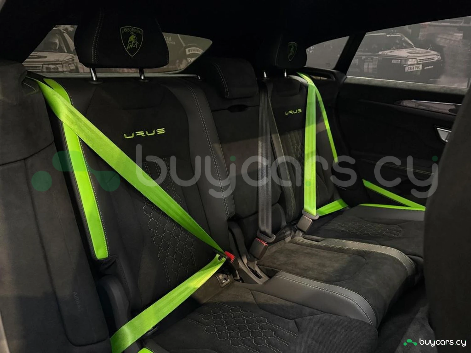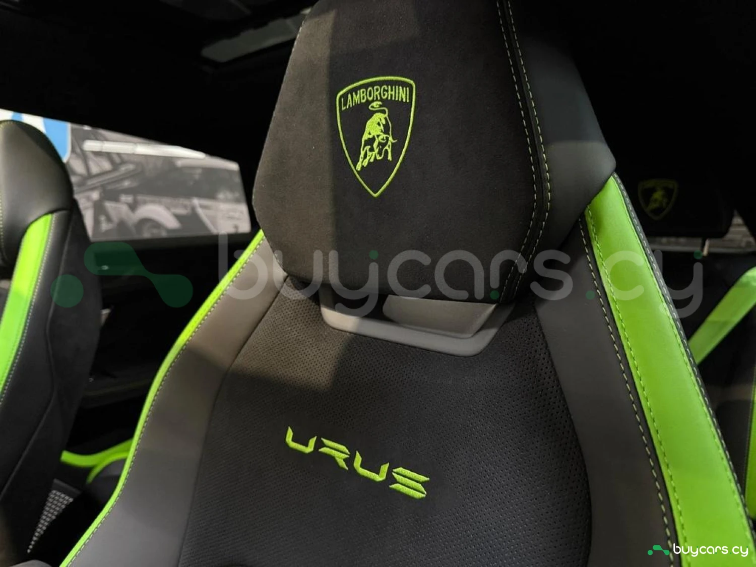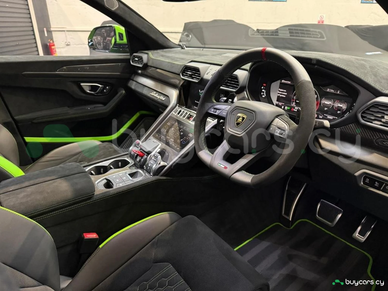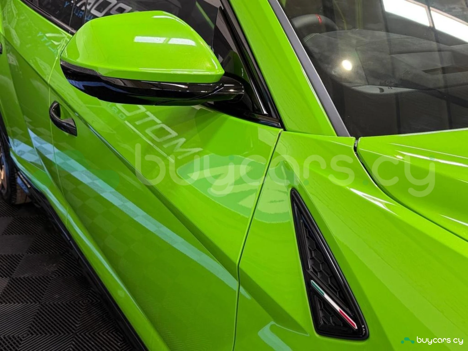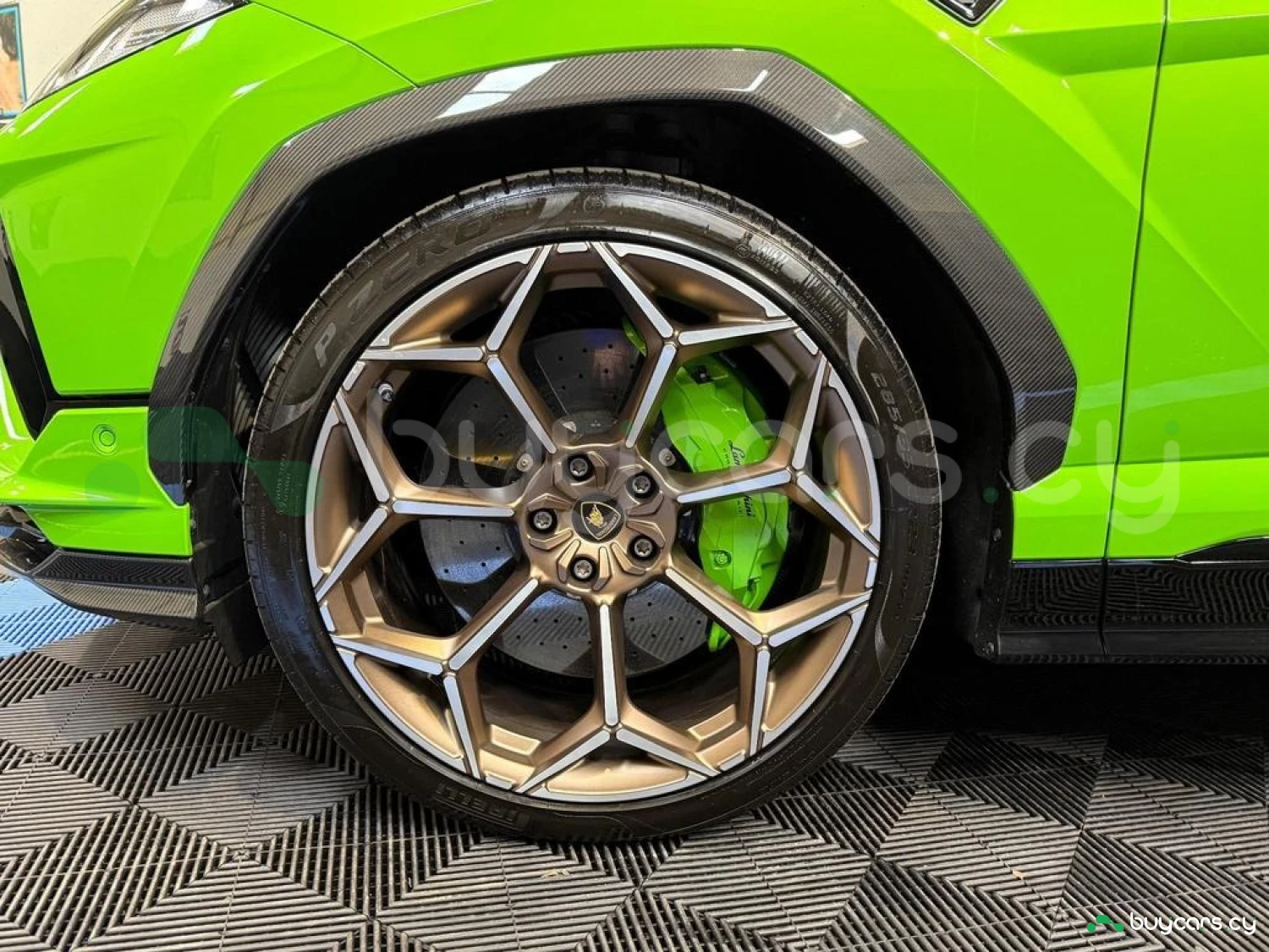 Exterior: Finished in Green, this Urus boasts an aggressive yet elegant look. It rides on 23-inch Pelope rims with titanium bolts, diamond-finished in shiny black for a striking presence. The front and rear bumpers, wheel arches, and upper spoiler are crafted from carbon fibre, as is the Lamborghini frame (Matt, Ad Personam). Privacy glass with acoustic and double glazing enhances cabin comfort, while the rear Lamborghini logo in high-gloss black (Ad Personam) adds a finishing touch.