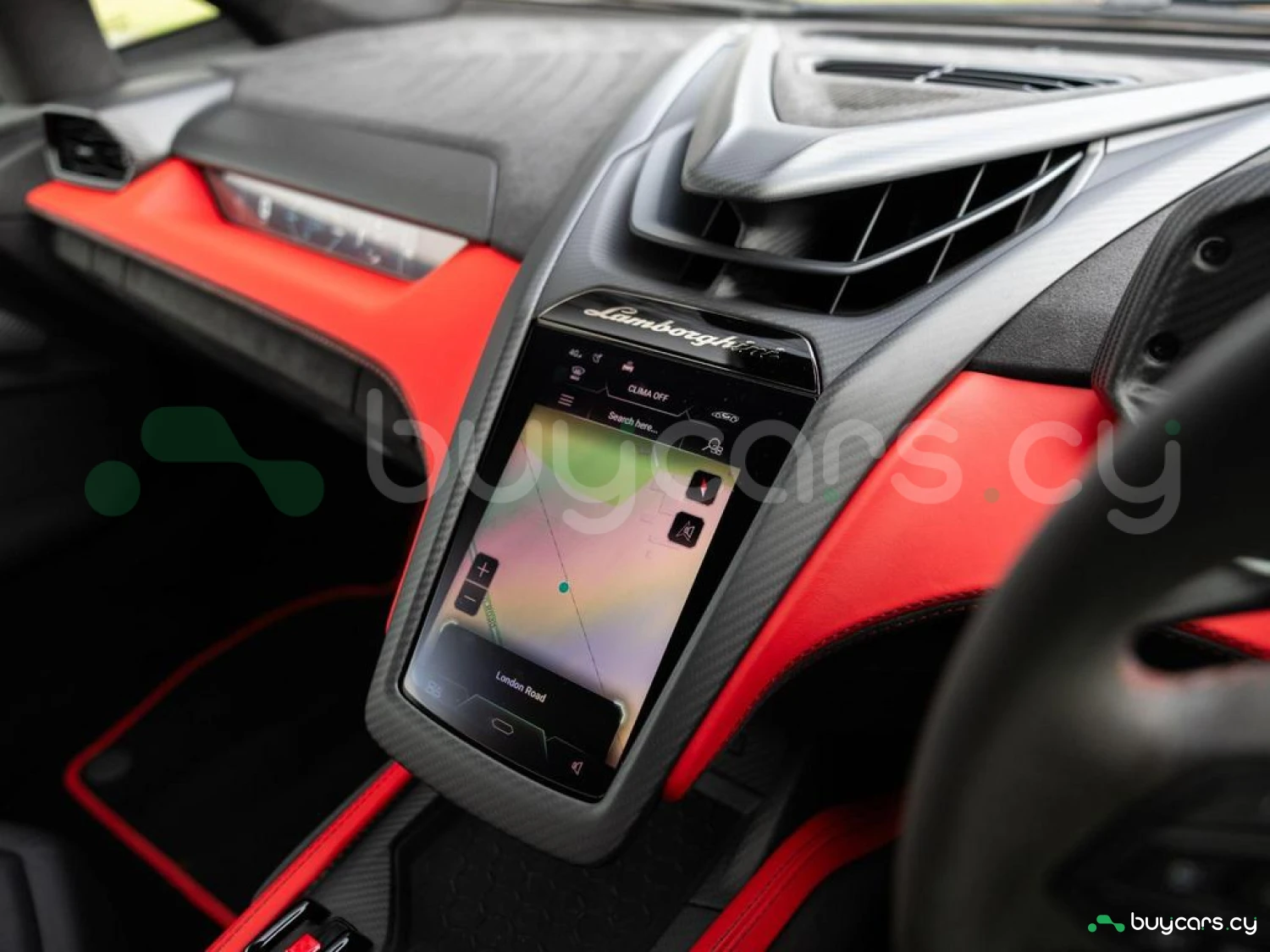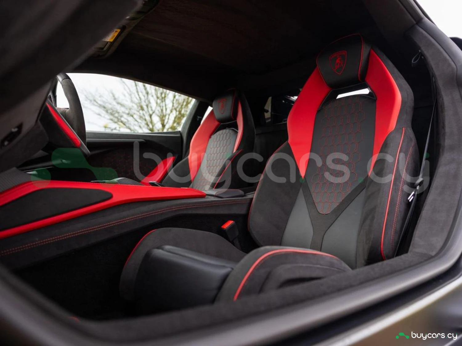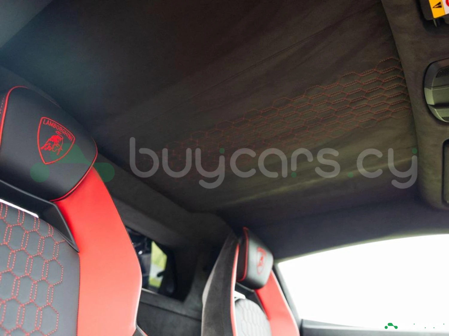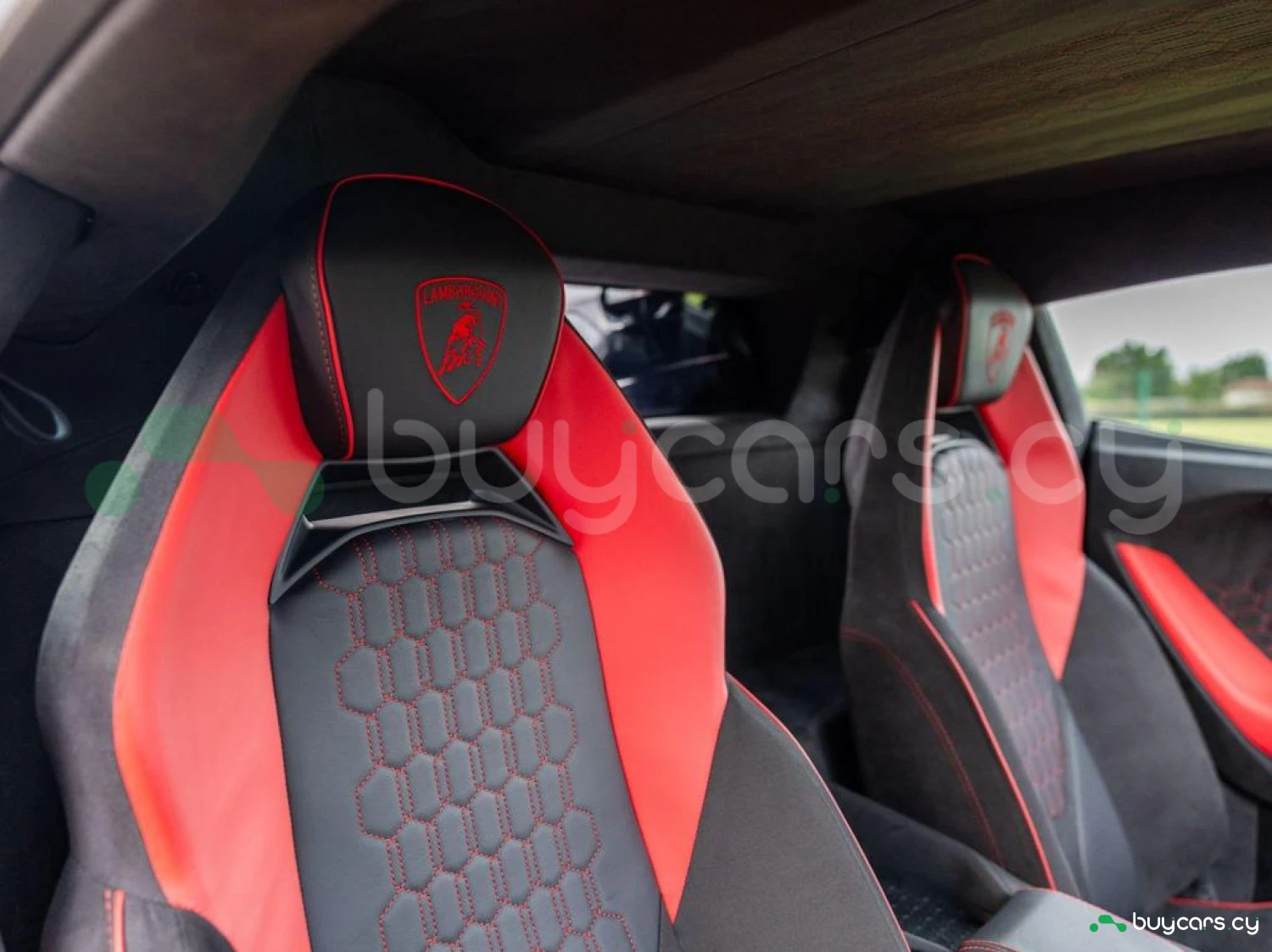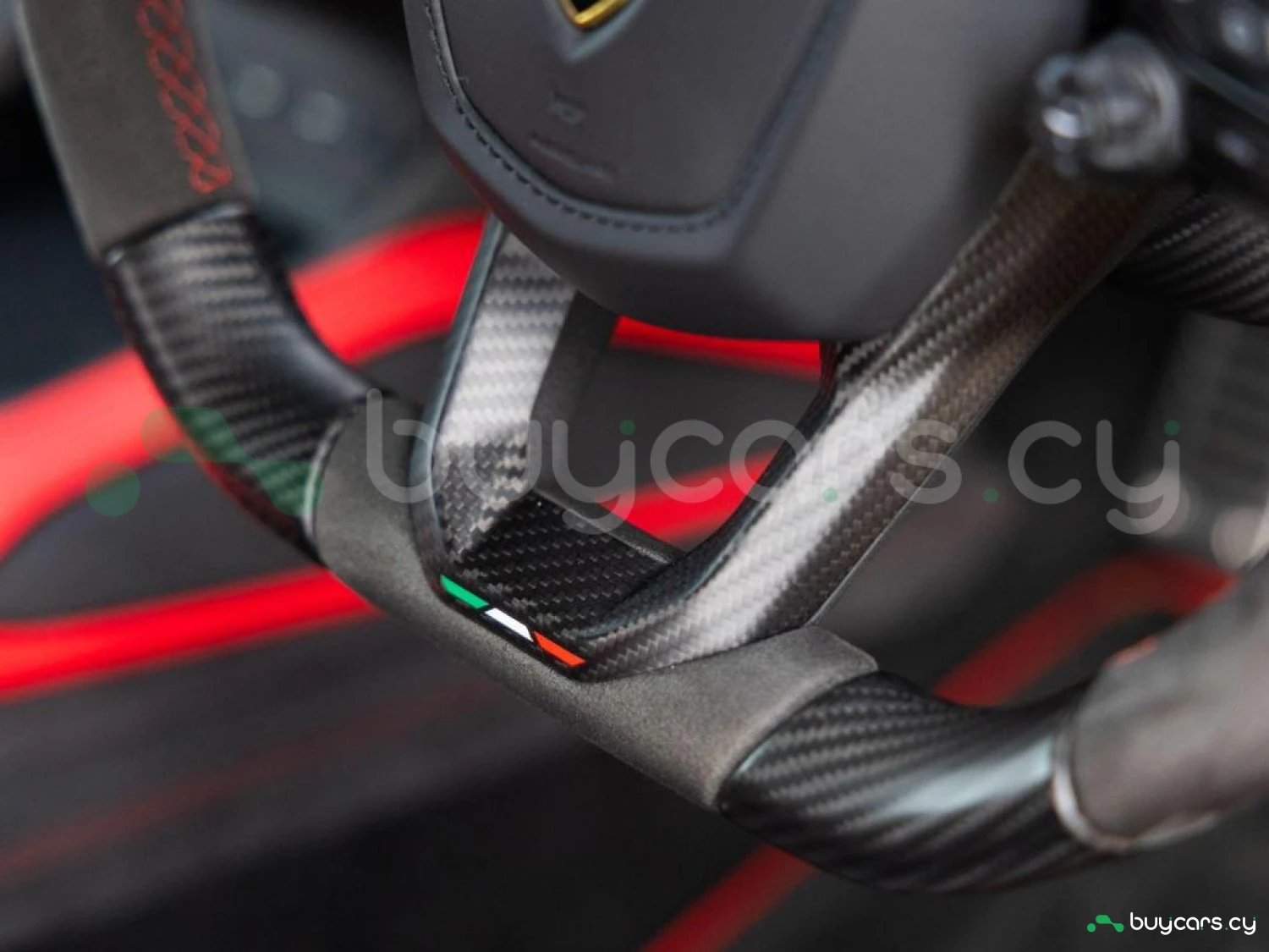 Comfort & Features: Electric & Heated Seats, Passenger Display, Smartphone Interface & Connected Services, carbon fiber steering wheel package, carbon fiber interior details package, embroidered Lamborghini logo on headrests, Q-Citura stitching on door & roof panels, dashboard cup holders, floor mats with leather piping & double stitching, Corsa Tex Package in Rosso Alala.