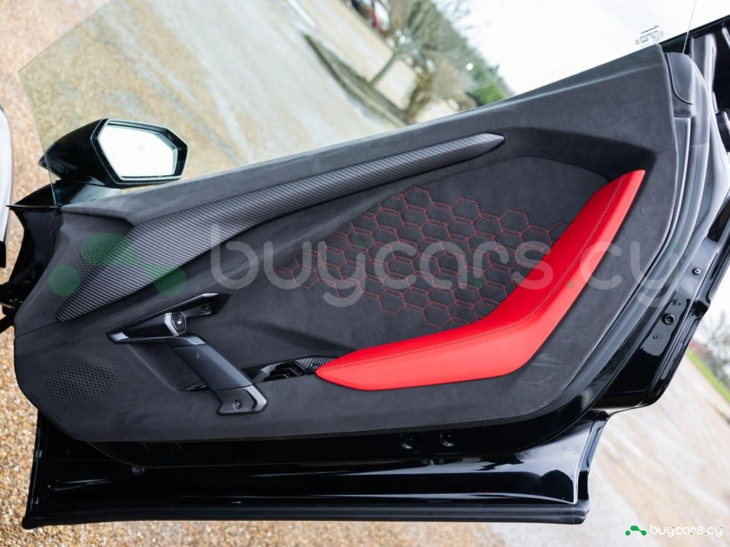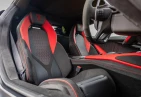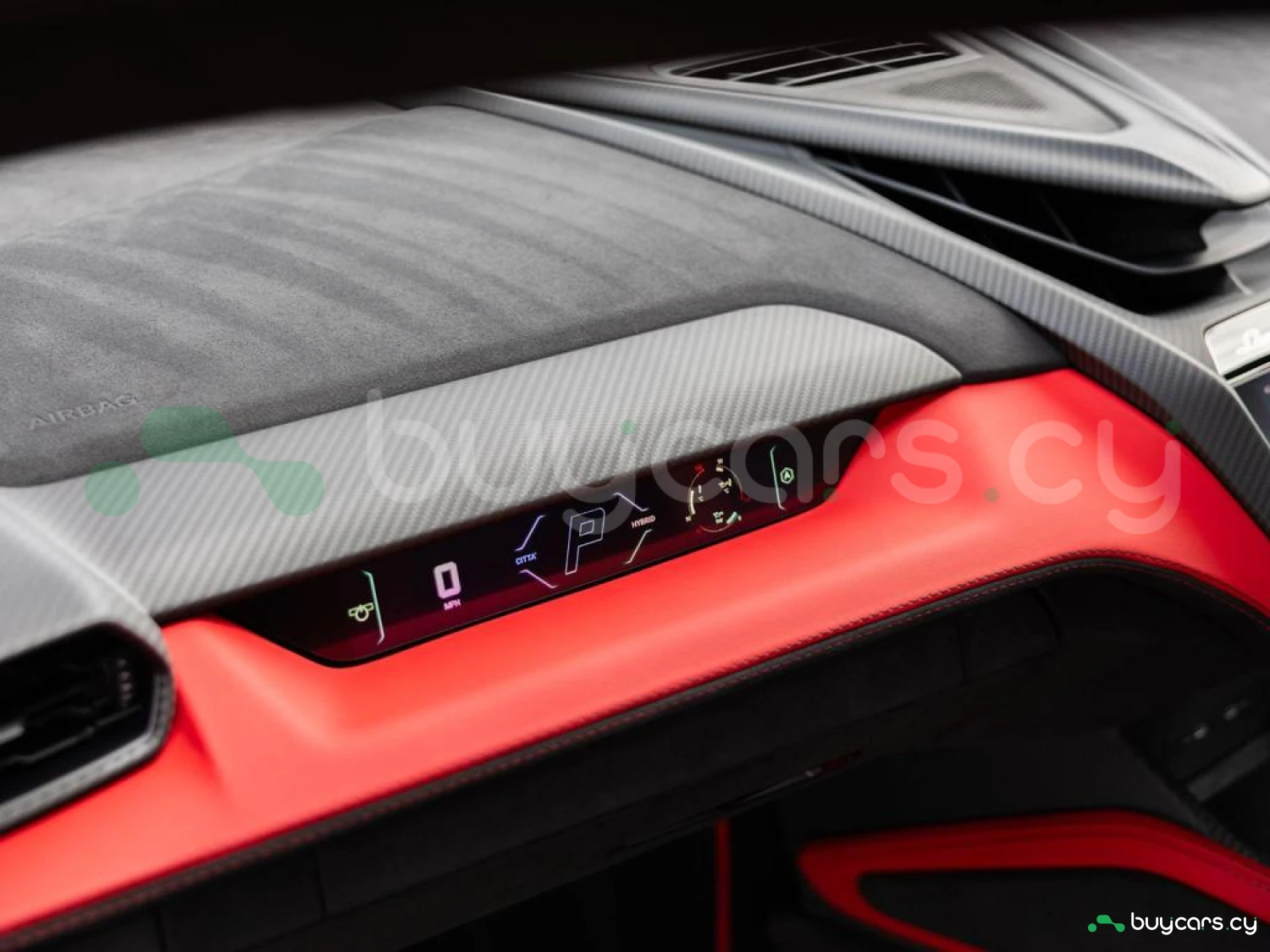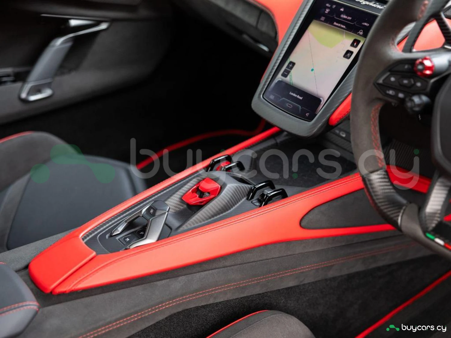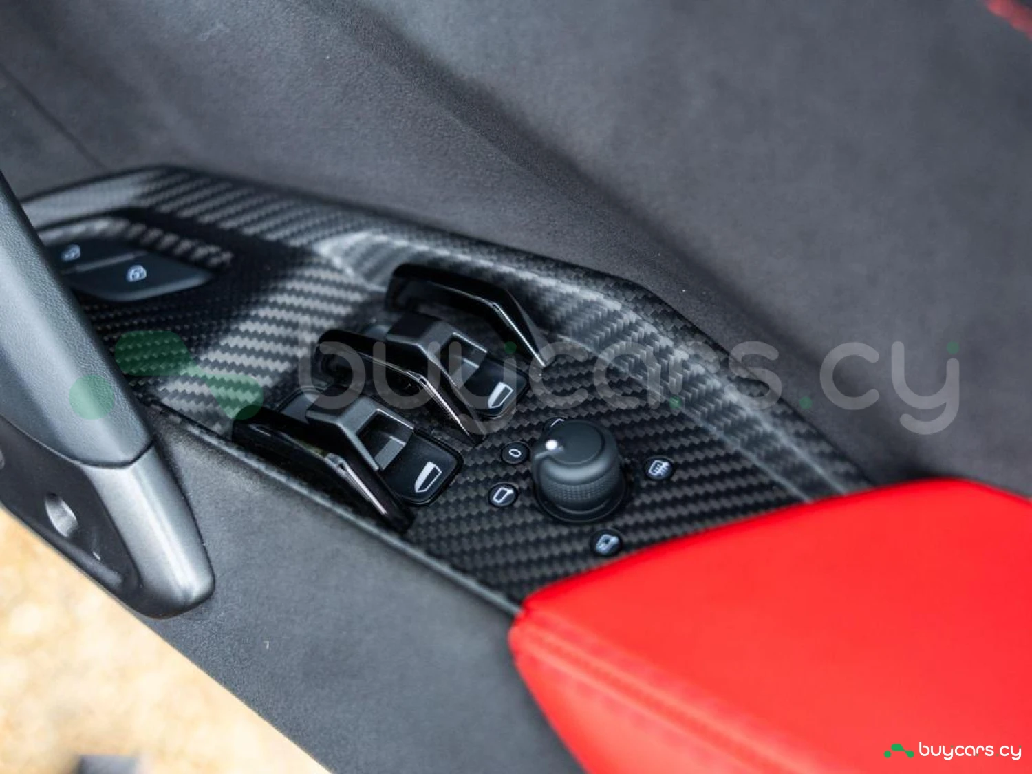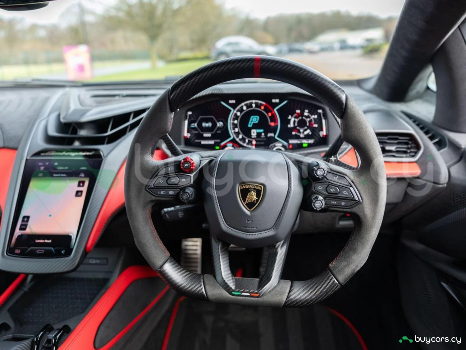 Comfort & Features: Electric & Heated Seats, Passenger Display, Smartphone Interface & Connected Services, carbon fiber steering wheel package, carbon fiber interior details package, embroidered Lamborghini logo on headrests, Q-Citura stitching on door & roof panels, dashboard cup holders, floor mats with leather piping & double stitching, Corsa Tex Package in Rosso Alala.