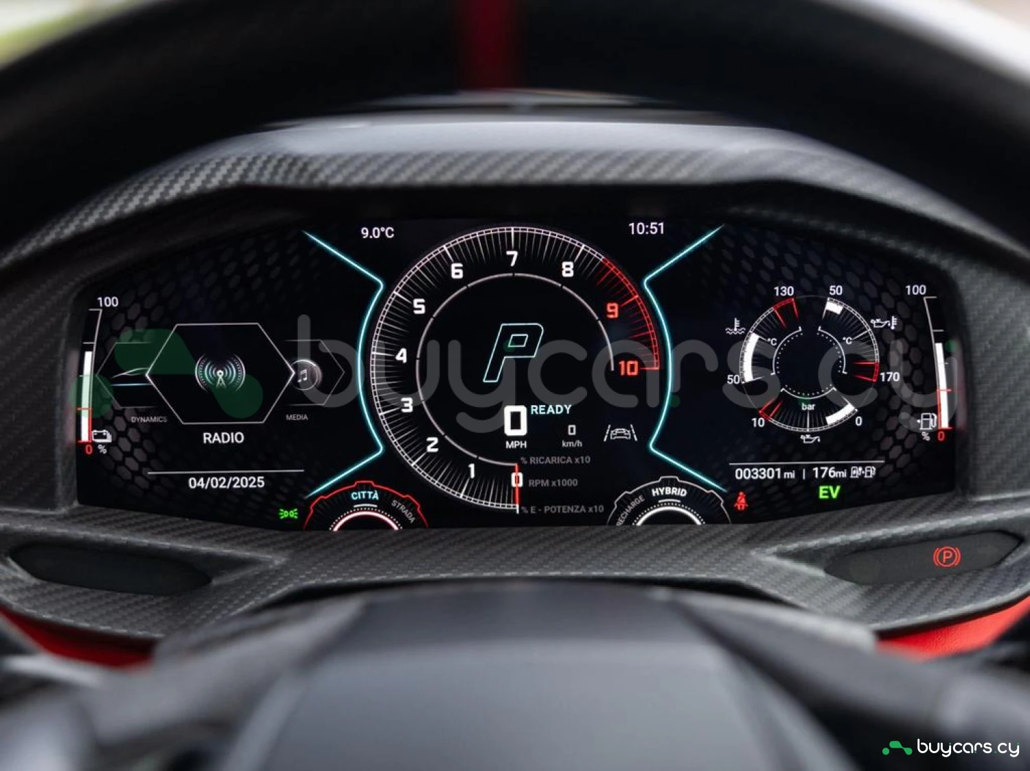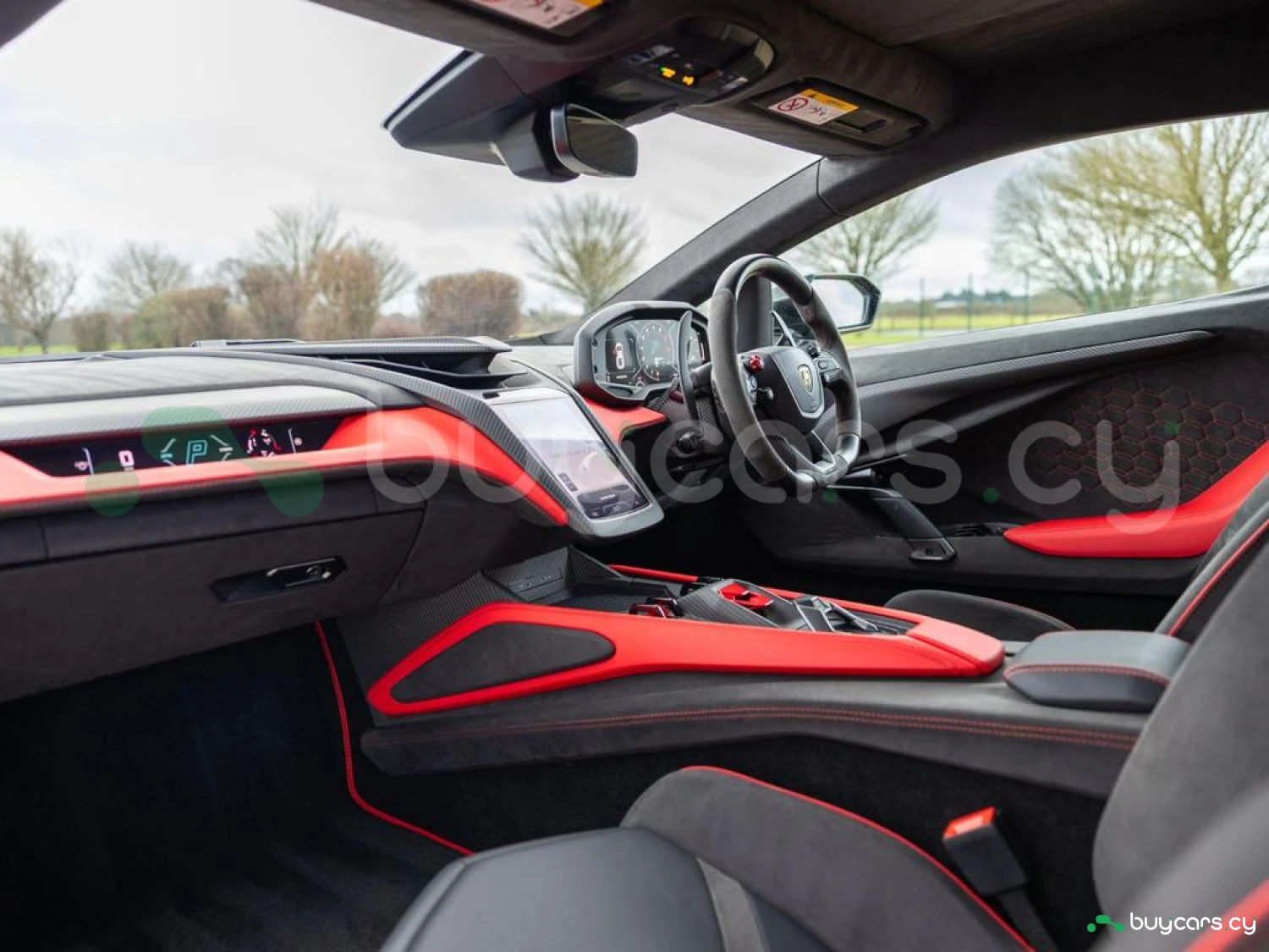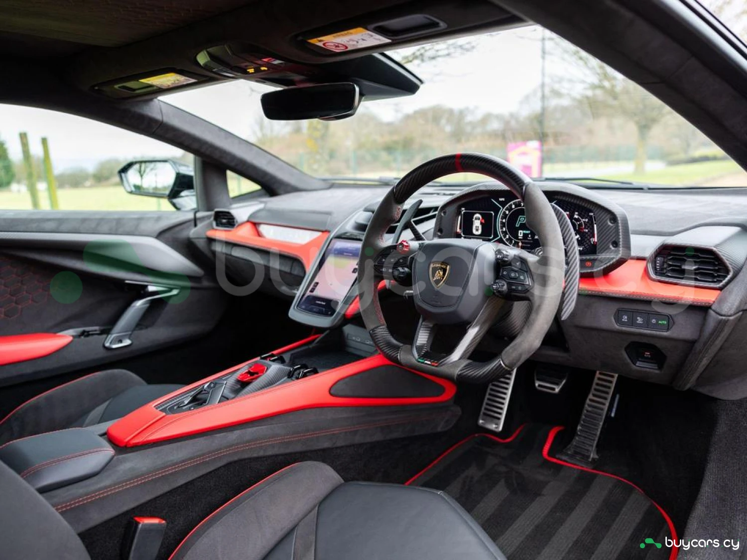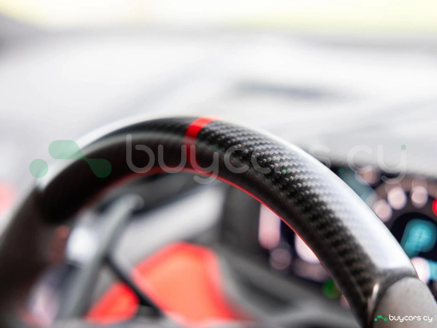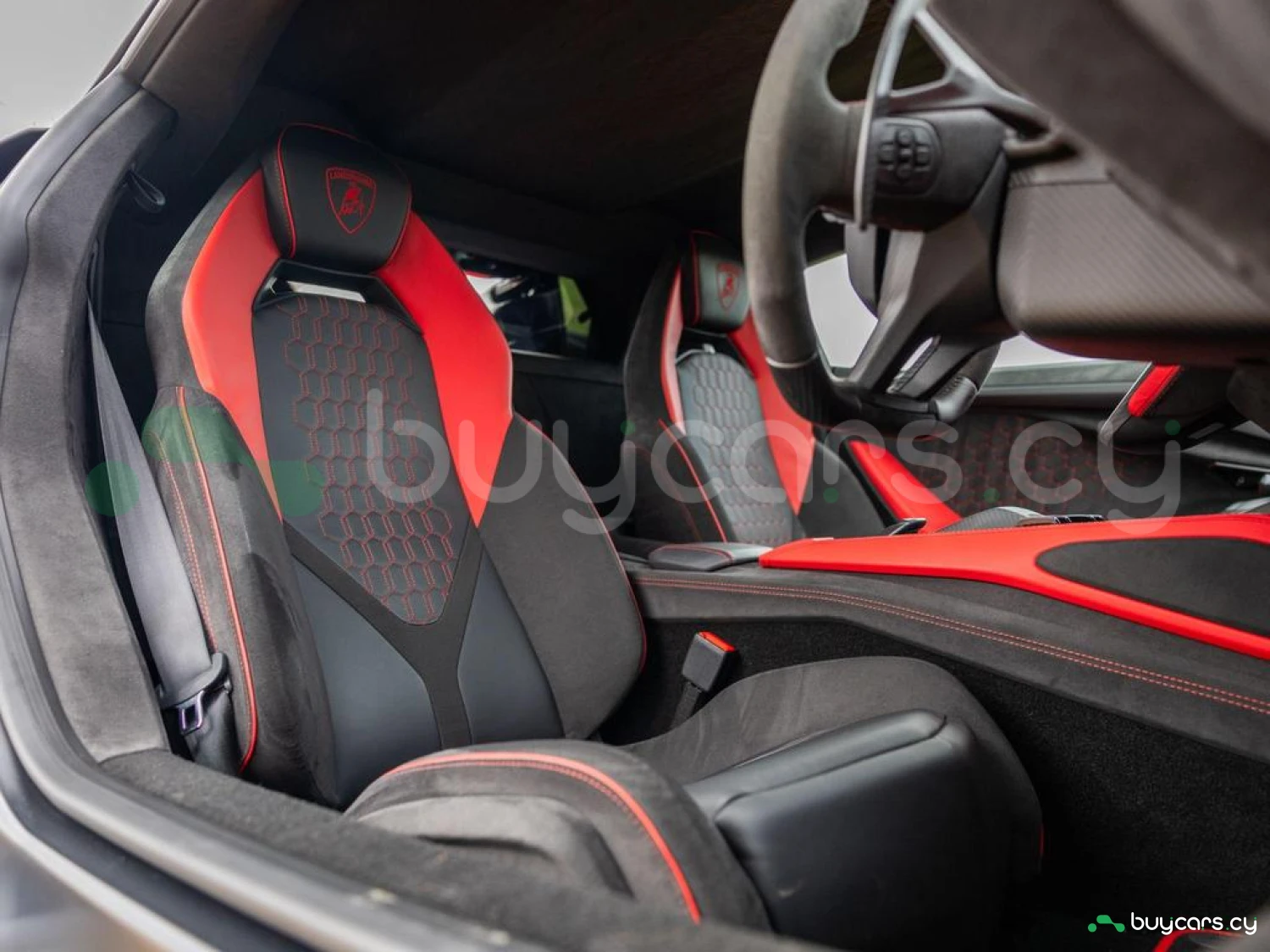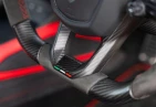 Comfort & Features: Electric & Heated Seats, Passenger Display, Smartphone Interface & Connected Services, carbon fiber steering wheel package, carbon fiber interior details package, embroidered Lamborghini logo on headrests, Q-Citura stitching on door & roof panels, dashboard cup holders, floor mats with leather piping & double stitching, Corsa Tex Package in Rosso Alala.