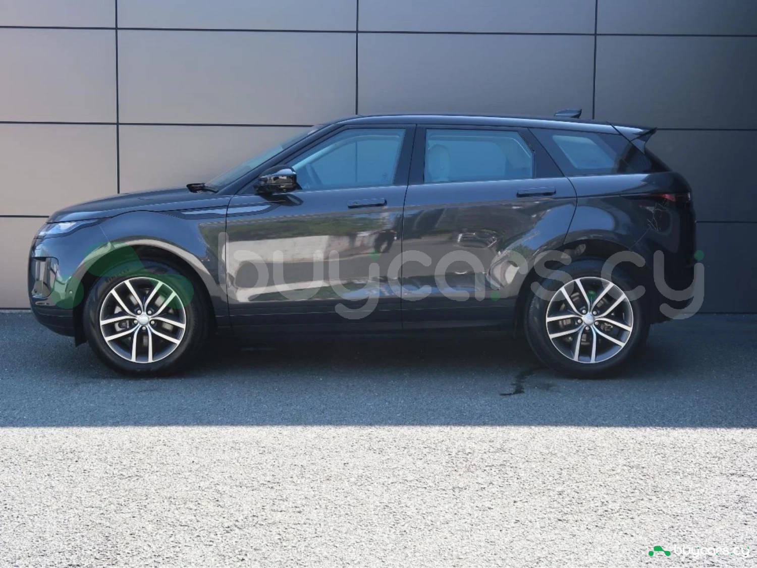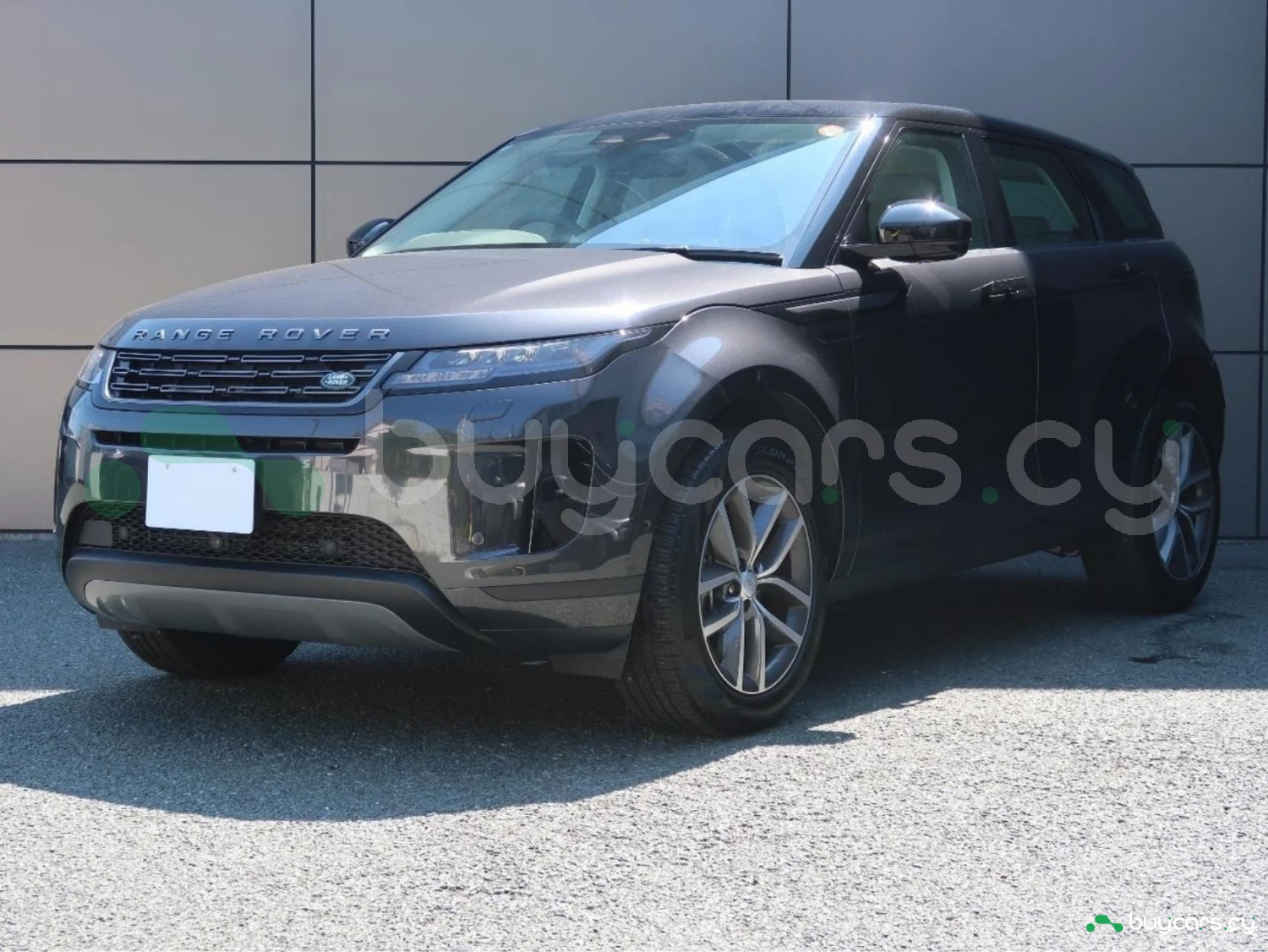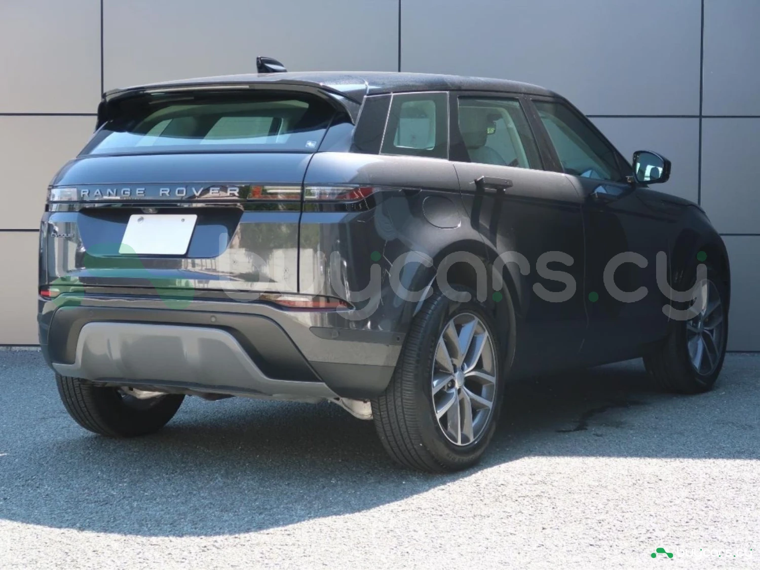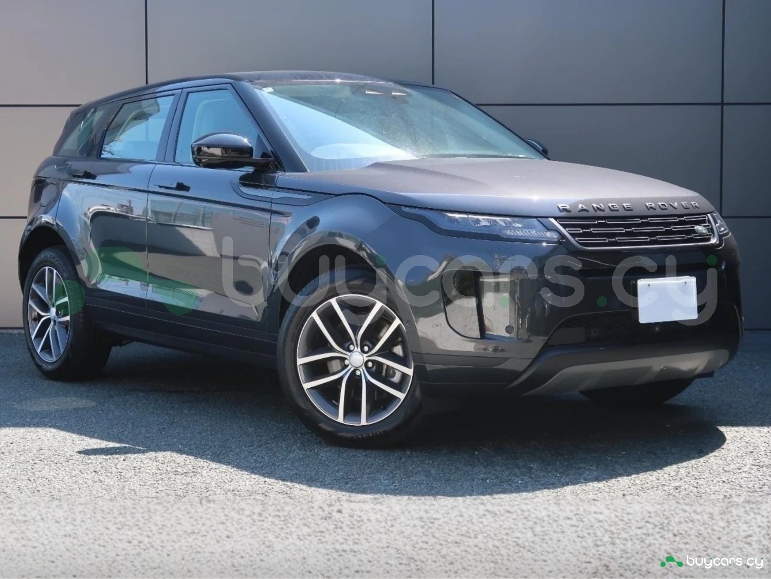 The vehicle is finished in Santorini Black, equipped with alloy wheels, LED lighting elements, and aerodynamic SUV proportions. Distinctive Evoque styling emphasizes its premium character.
