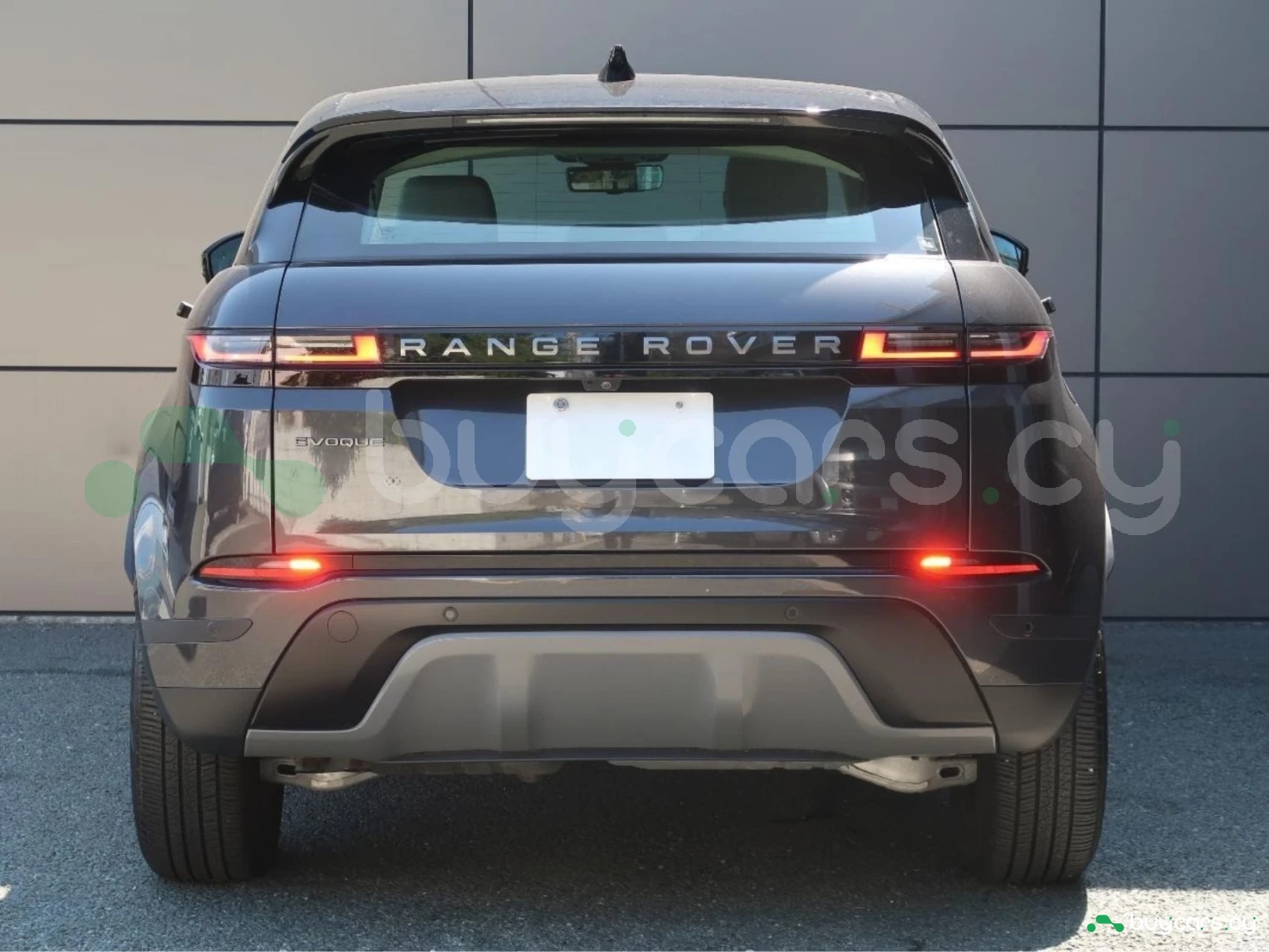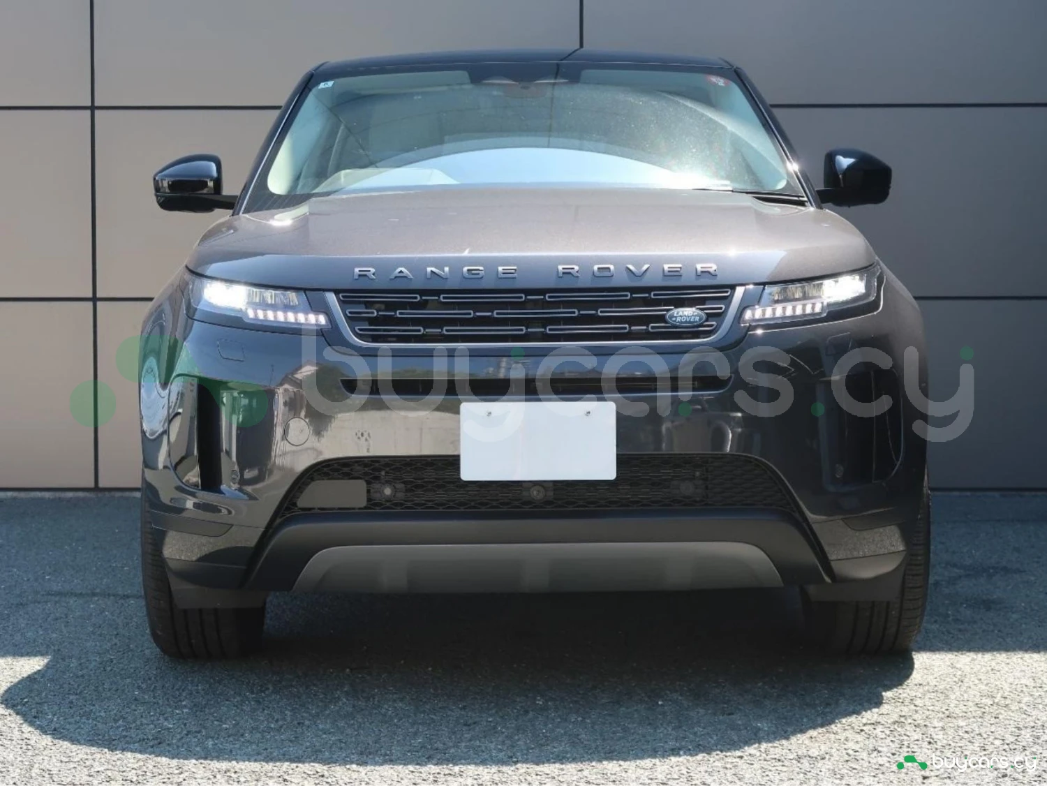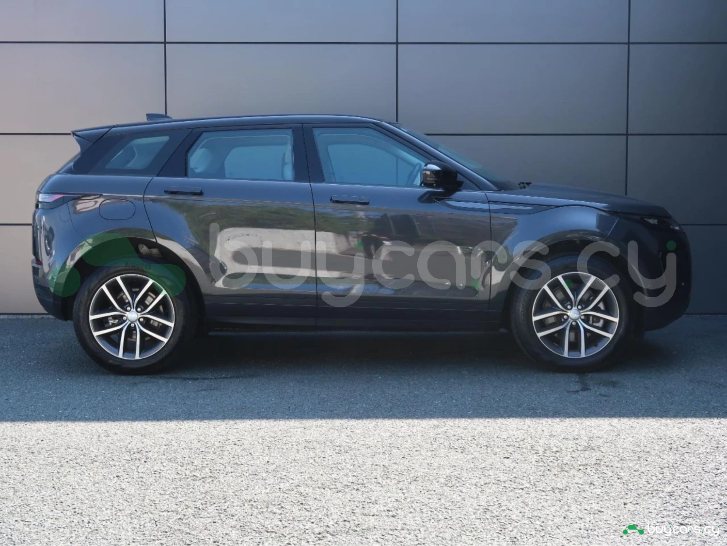 The vehicle is finished in Santorini Black, equipped with alloy wheels, LED lighting elements, and aerodynamic SUV proportions. Distinctive Evoque styling emphasizes its premium character.