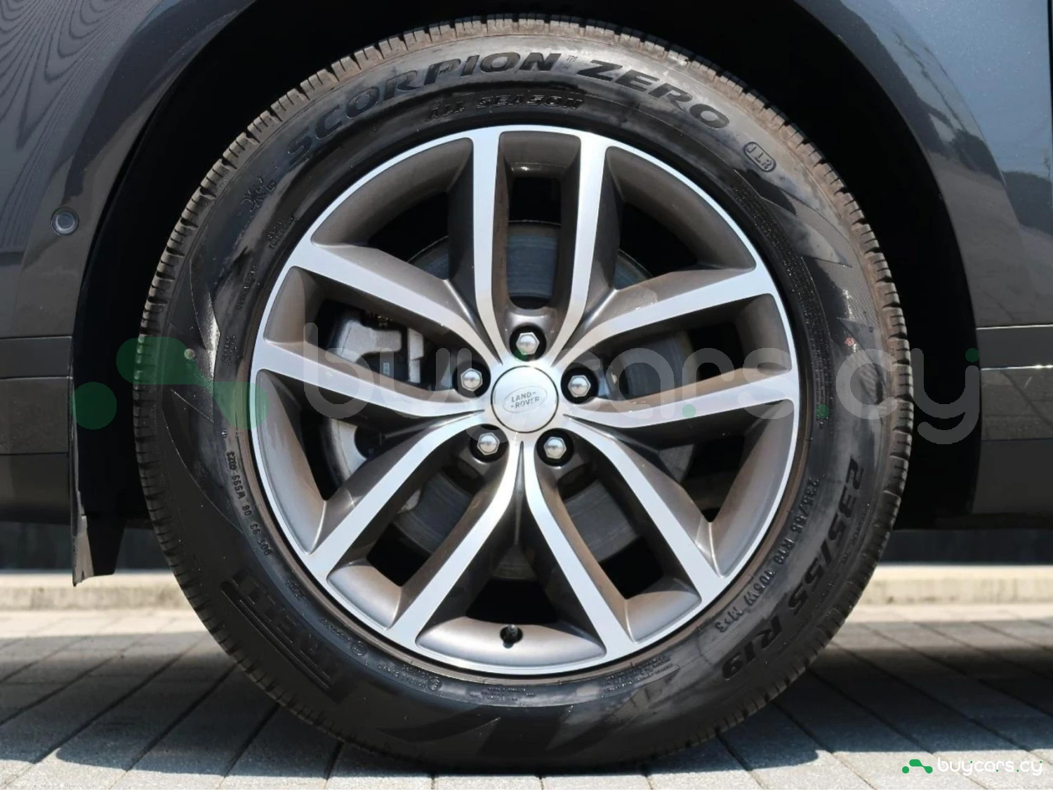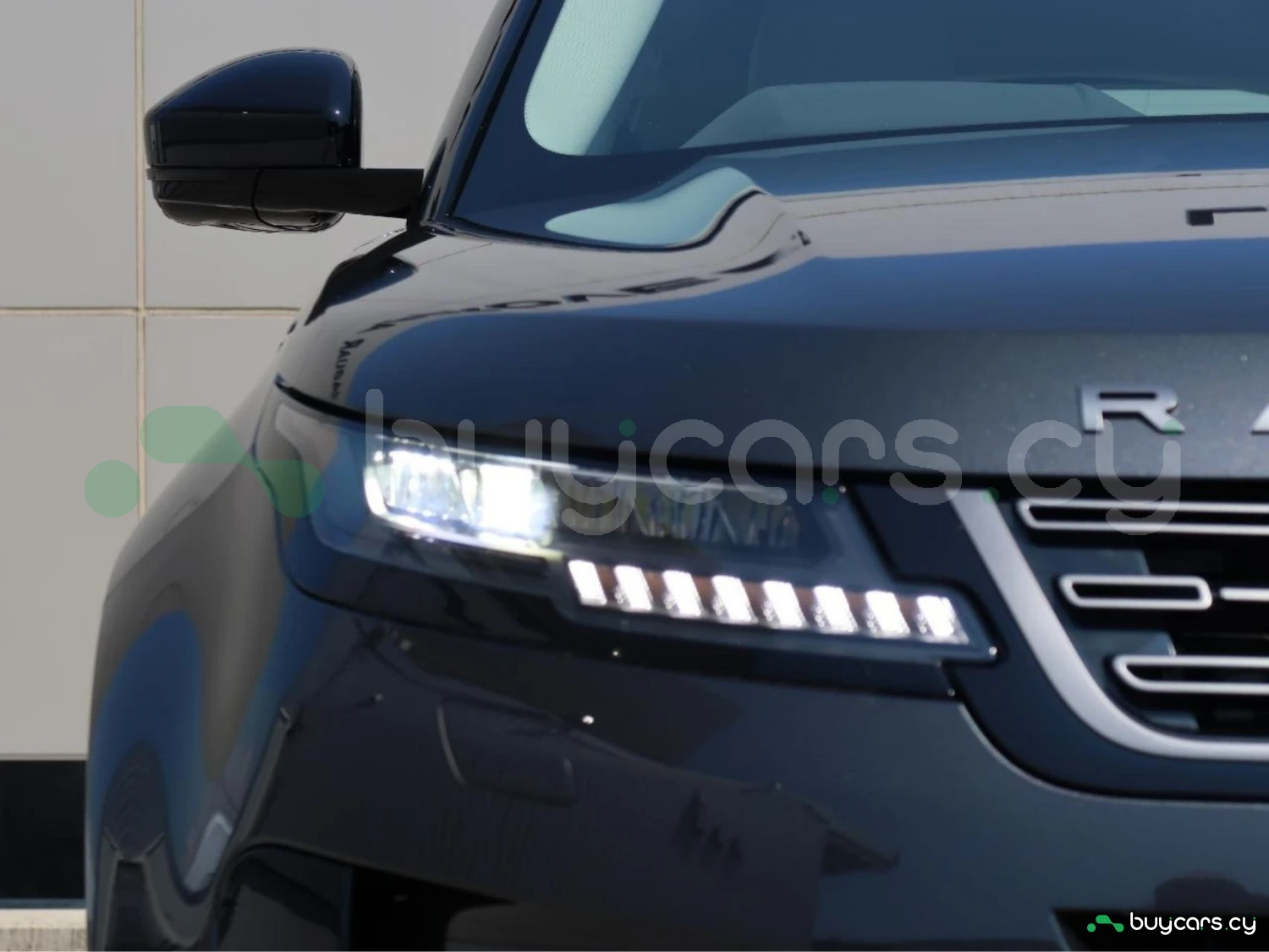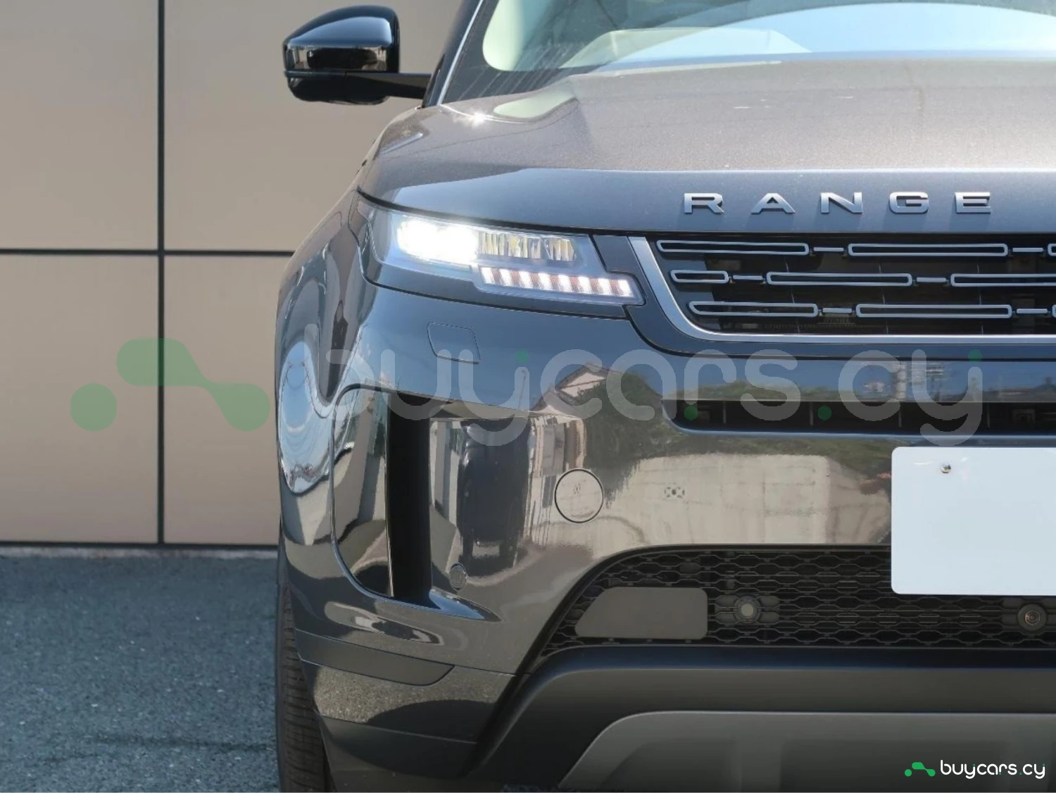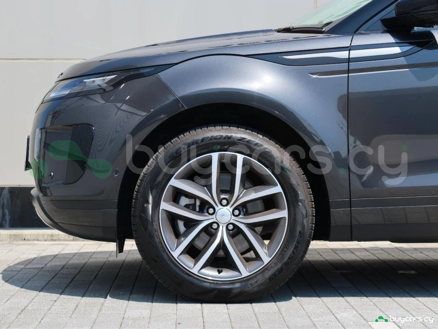 The vehicle is finished in Santorini Black, equipped with alloy wheels, LED lighting elements, and aerodynamic SUV proportions. Distinctive Evoque styling emphasizes its premium character.