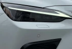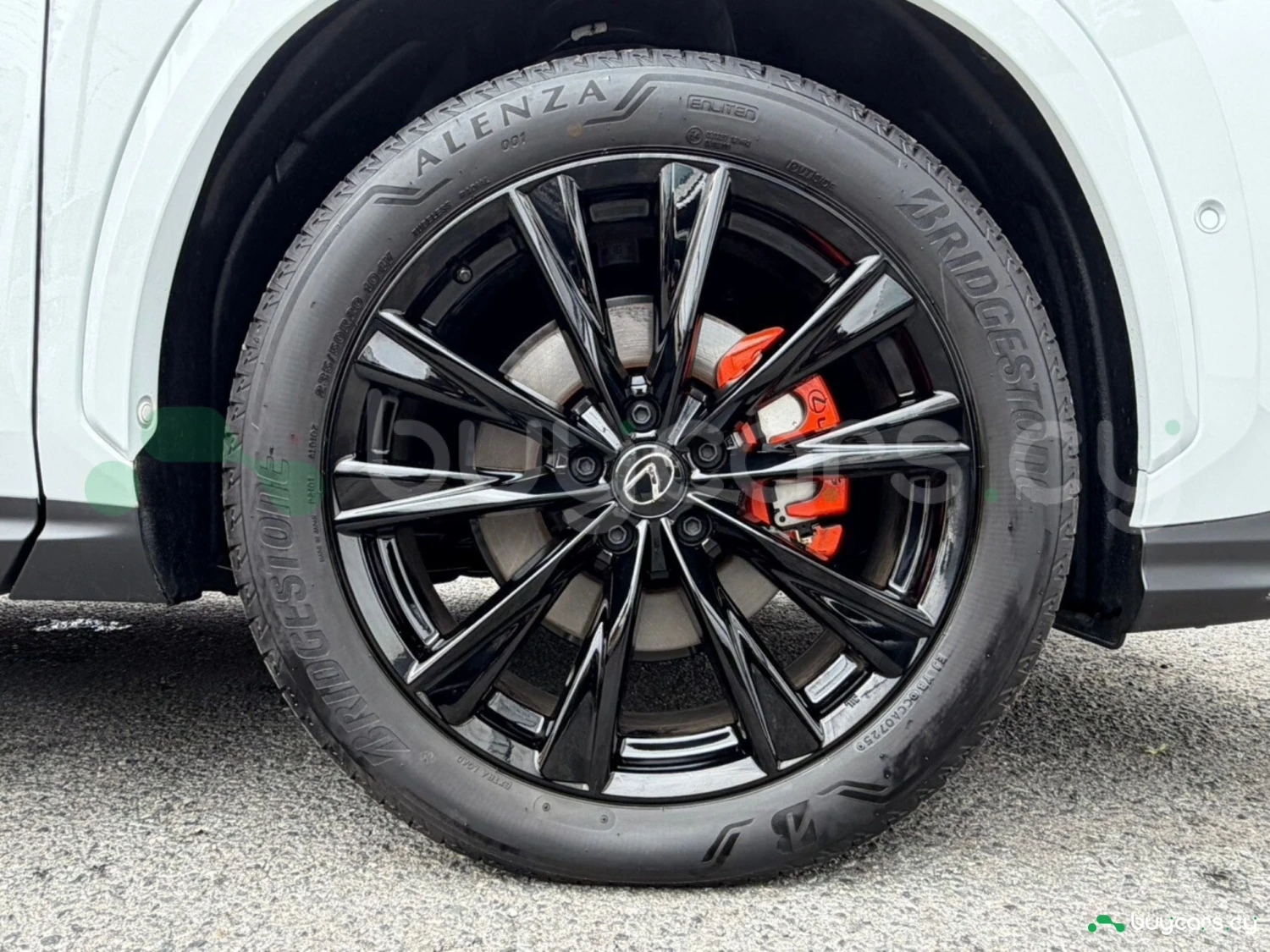 The F SPORT design emphasizes athletic styling with an aggressive spindle grille, genuine 20-inch alloy wheels, and distinctive orange brake calipers. The White Nova Glass Flake finish highlights the sculpted body lines, while adaptive LED headlights and sporty accents enhance its premium and dynamic presence.