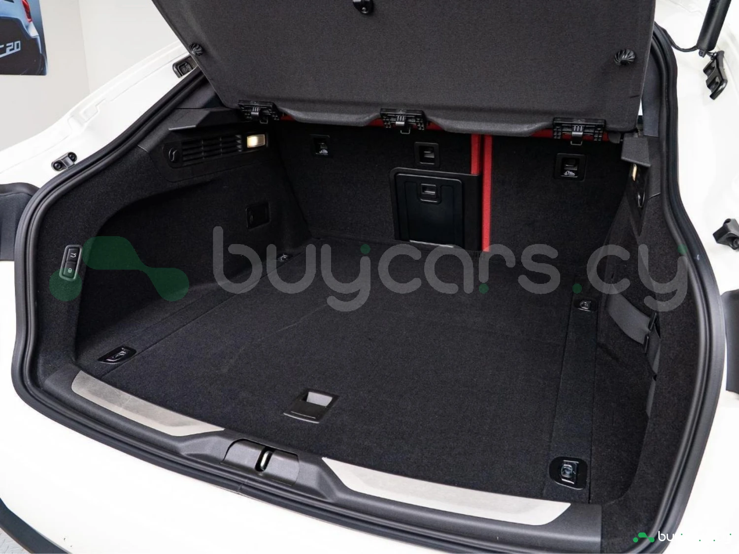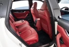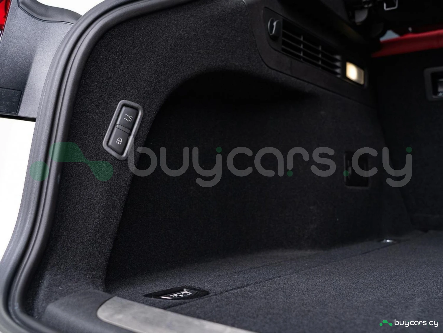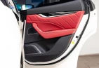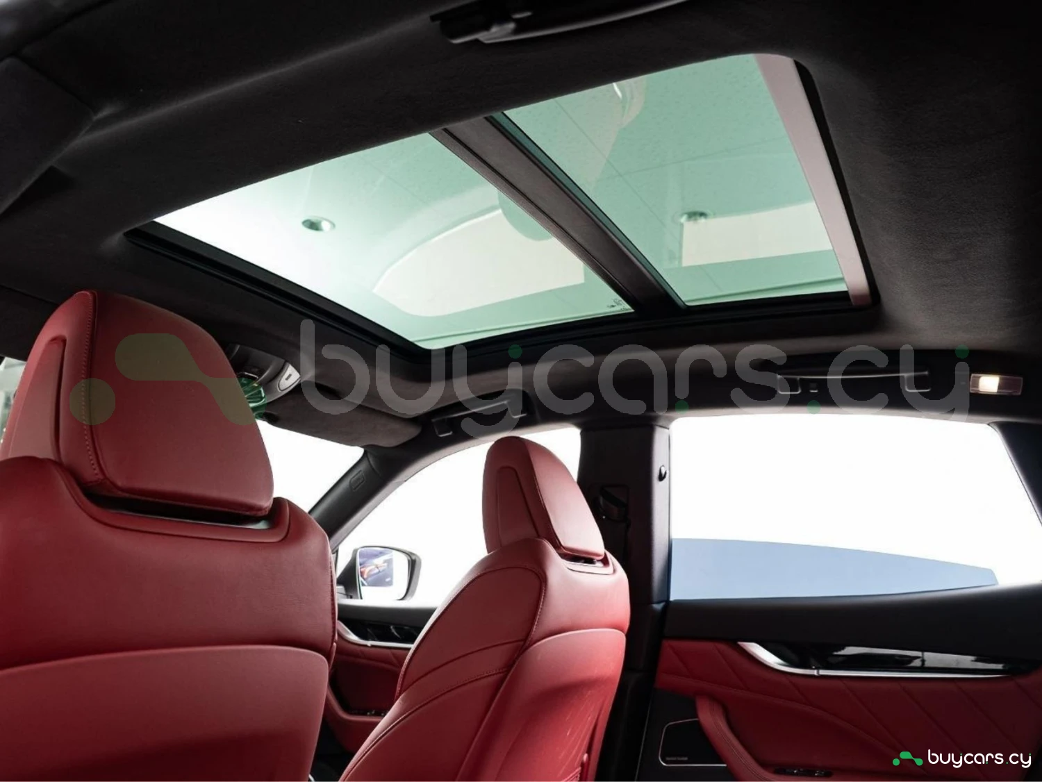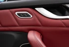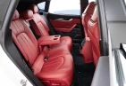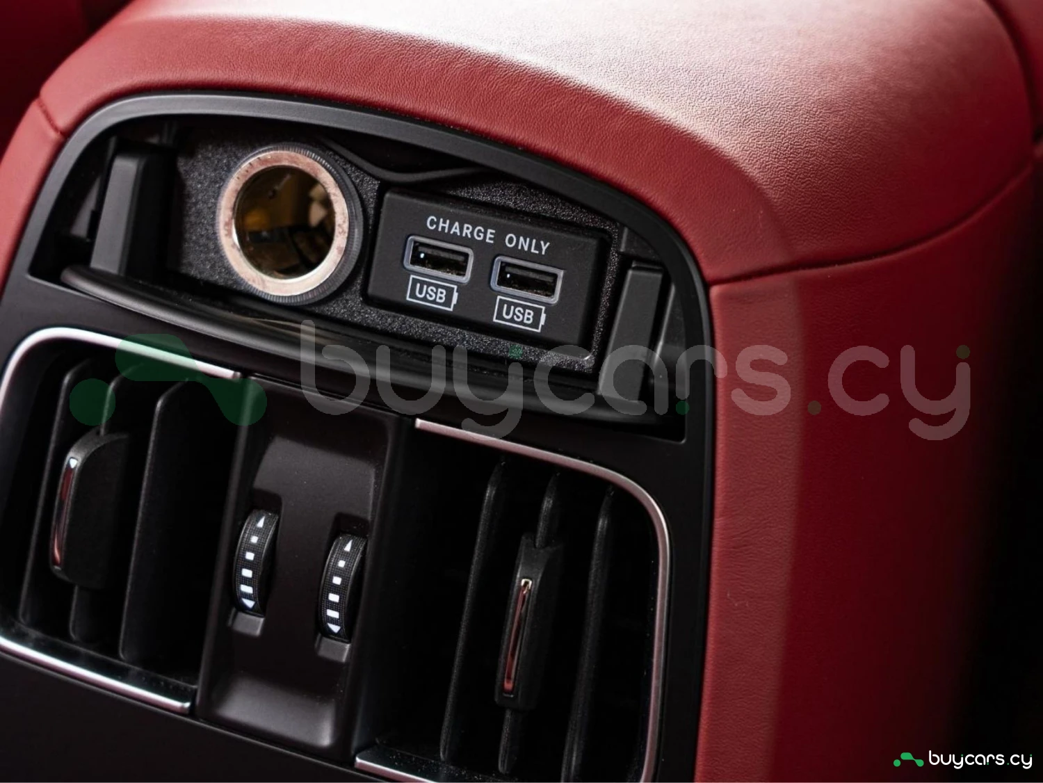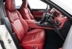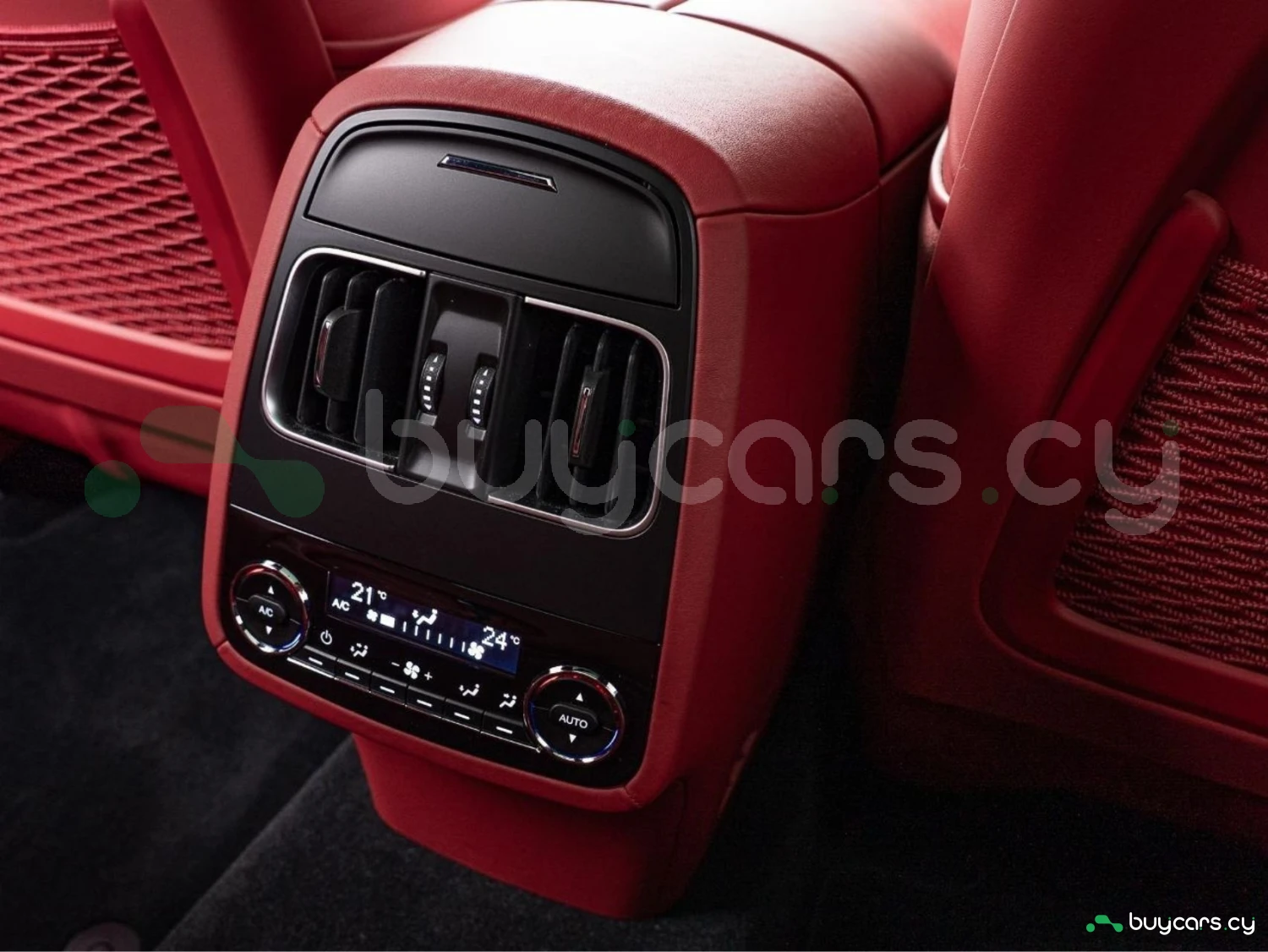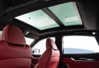 The cabin accommodates 5 passengers, featuring red genuine leather seats and a panoramic sunroof. Comfort functions include smart key access, ergonomic seating, and premium finishes.