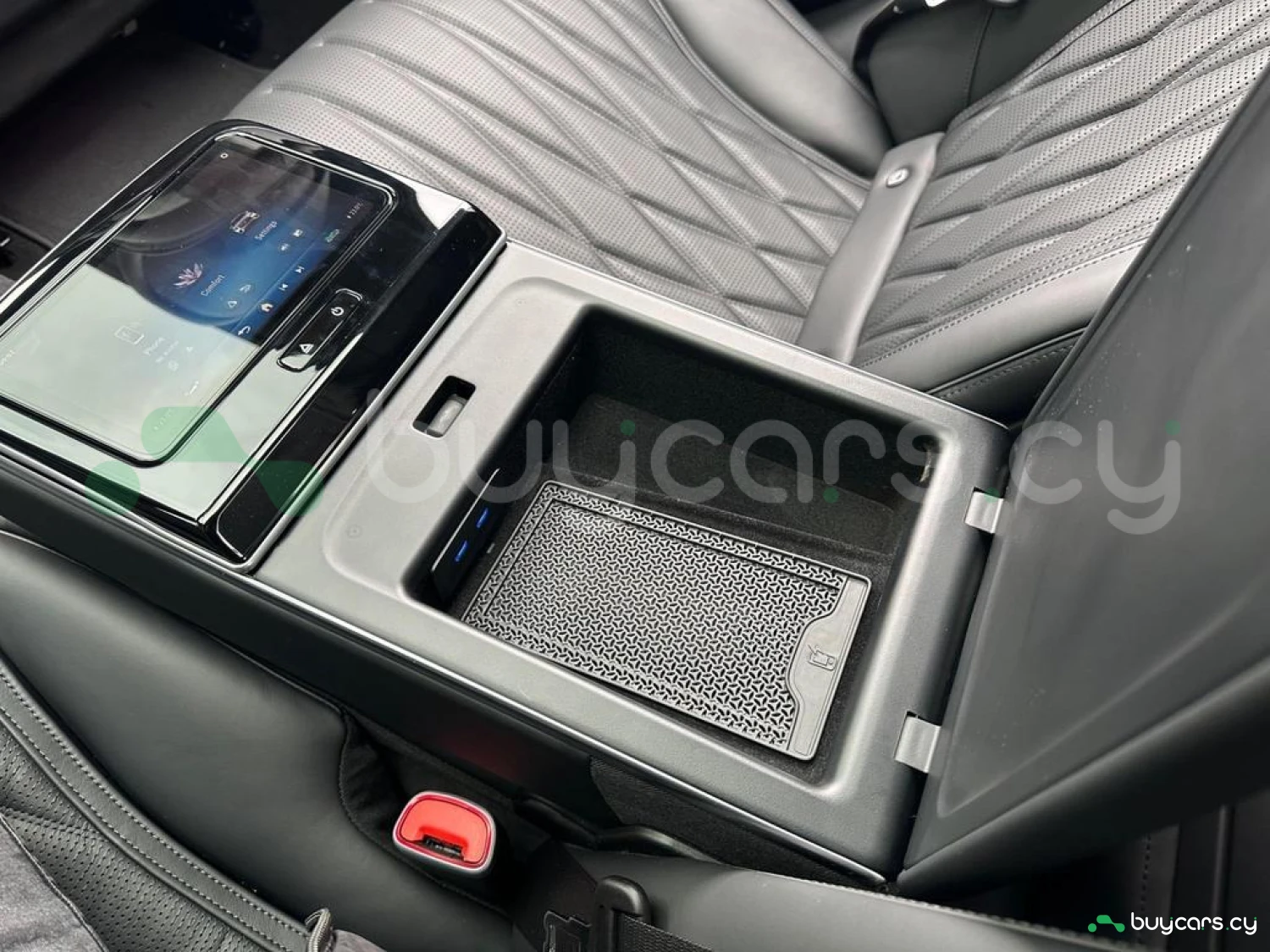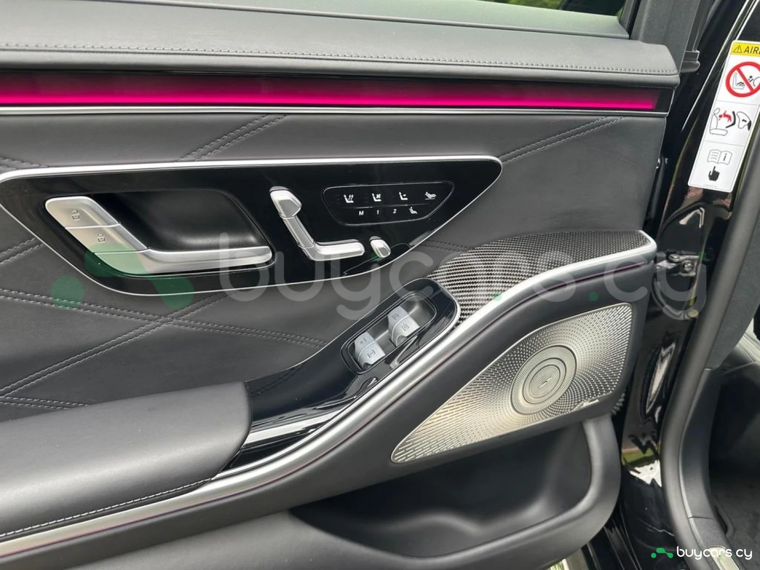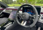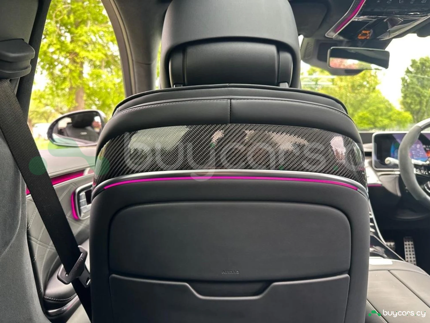 Inside, the S 63 E Performance offers a luxurious cabin with AMG-specific touches. Standard features include Nappa leather upholstery, heated and ventilated front and rear seats, the MBUX infotainment system with dual displays, and a Burmester® 3D surround sound system. The rear seats provide ample legroom, and optional executive packages enhance passenger comfort with features like reclining seats and massage functions.