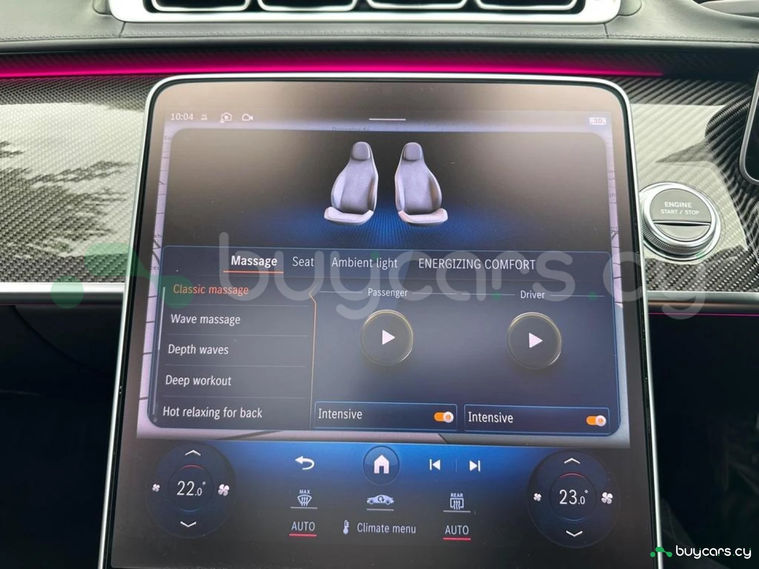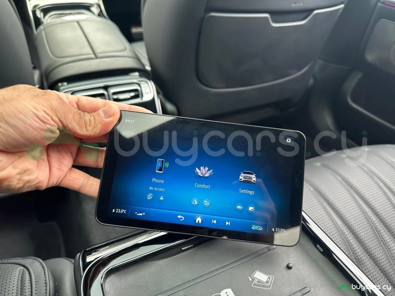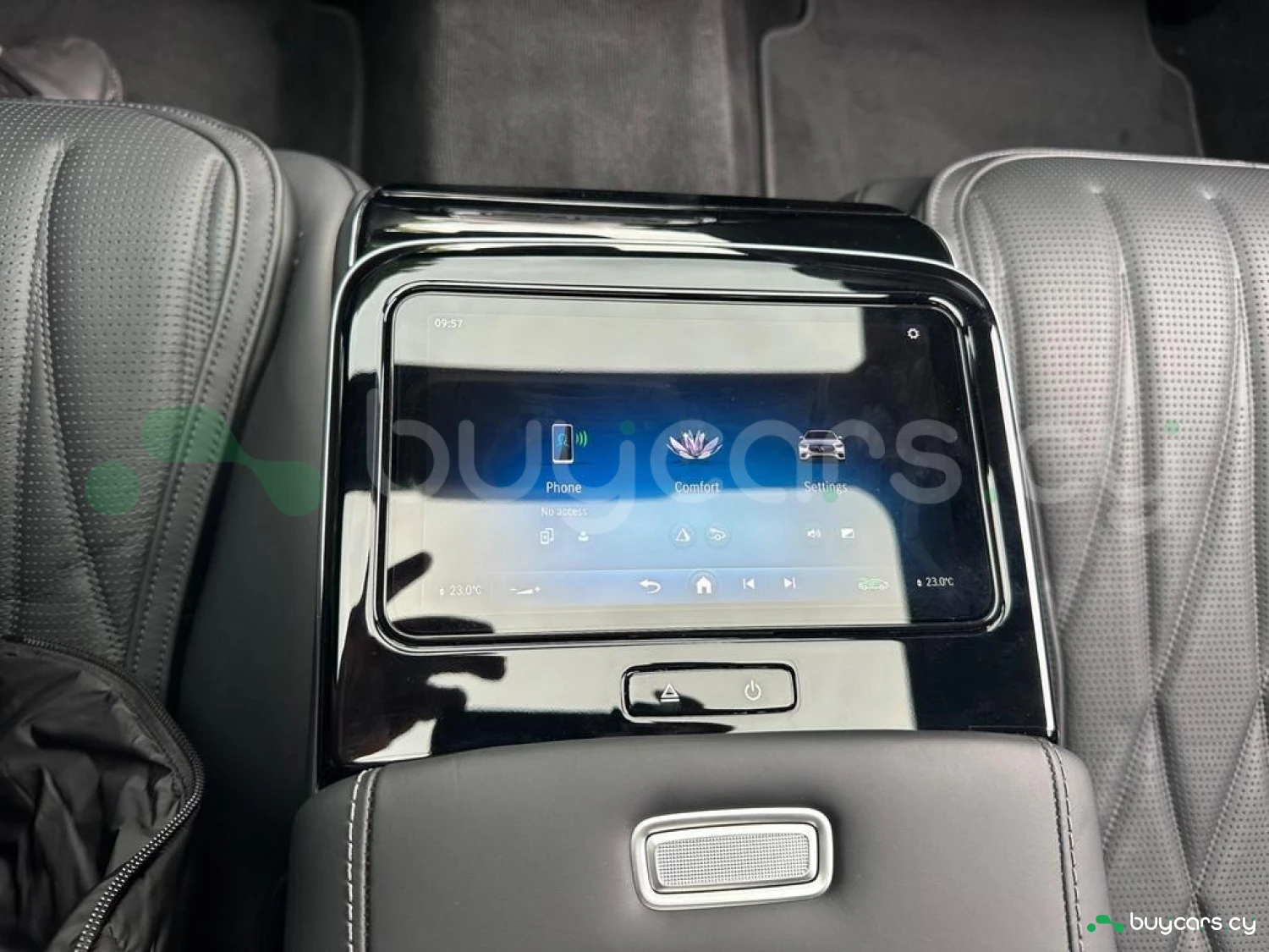 Inside, the S 63 E Performance offers a luxurious cabin with AMG-specific touches. Standard features include Nappa leather upholstery, heated and ventilated front and rear seats, the MBUX infotainment system with dual displays, and a Burmester® 3D surround sound system. The rear seats provide ample legroom, and optional executive packages enhance passenger comfort with features like reclining seats and massage functions.
