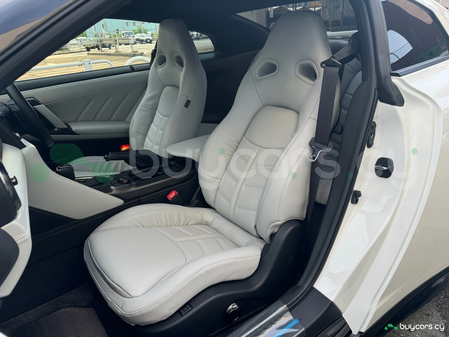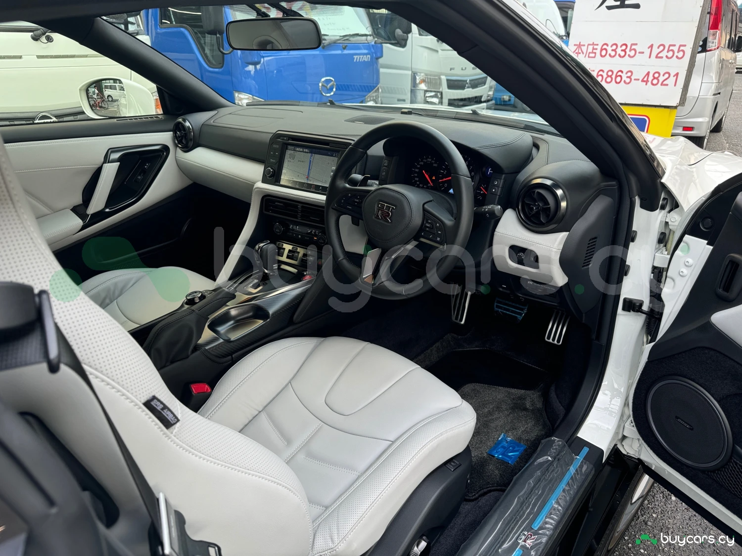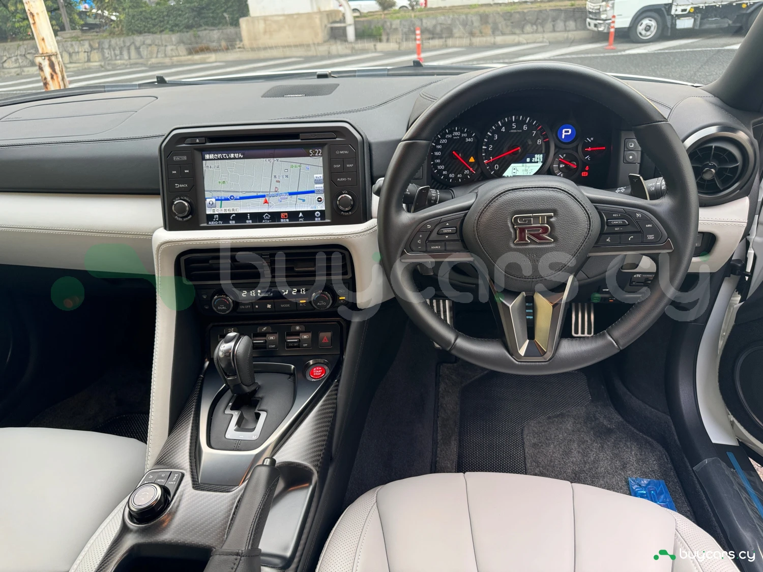 The interior combines modern luxury with a racing spirit. The cabin features light gray genuine leather power seats, smart key access, push-button start, and a multifunction steering wheel. With a focus on driver engagement and refined comfort, the GT-R provides a premium atmosphere for both daily drives and spirited runs.