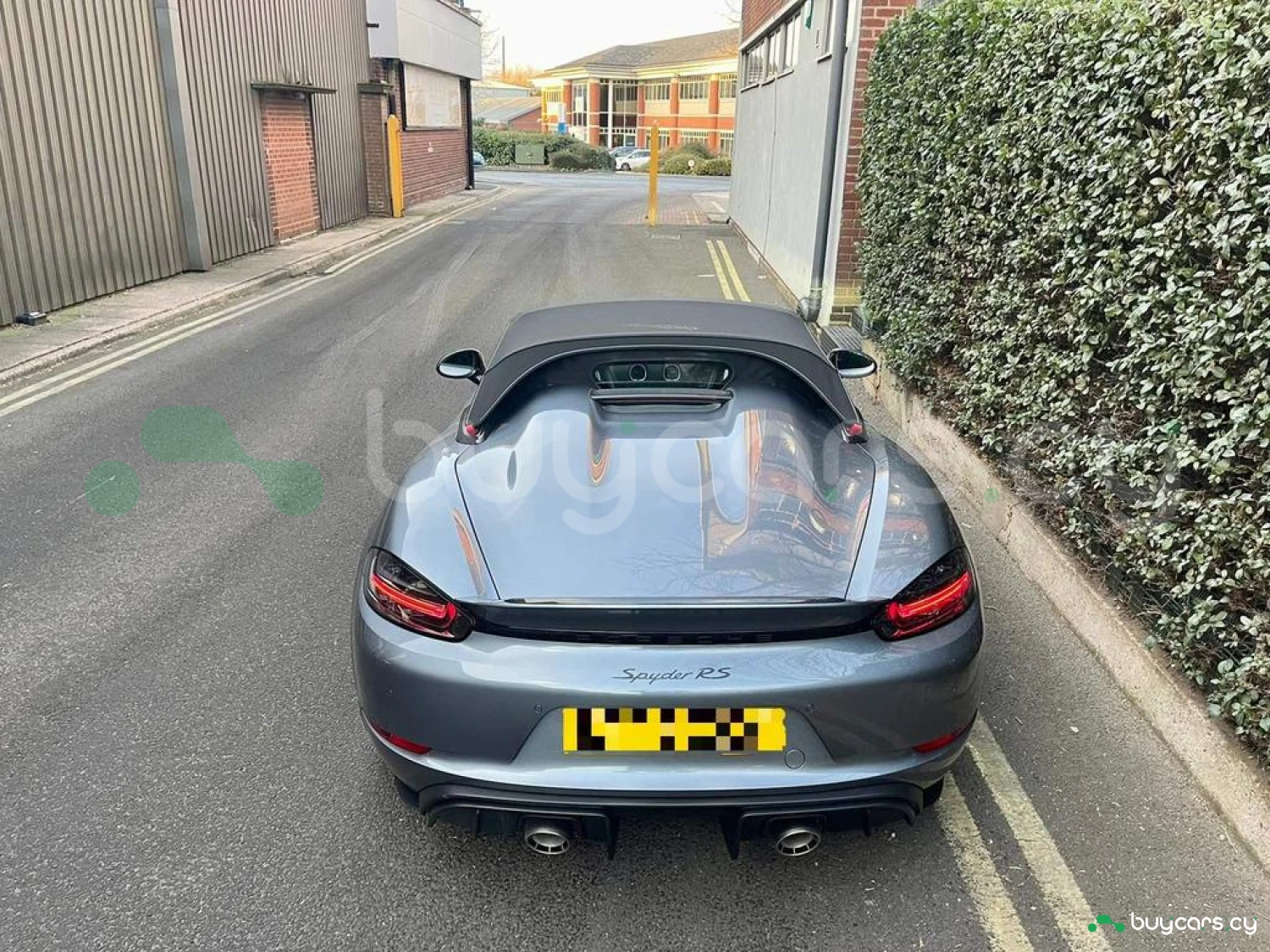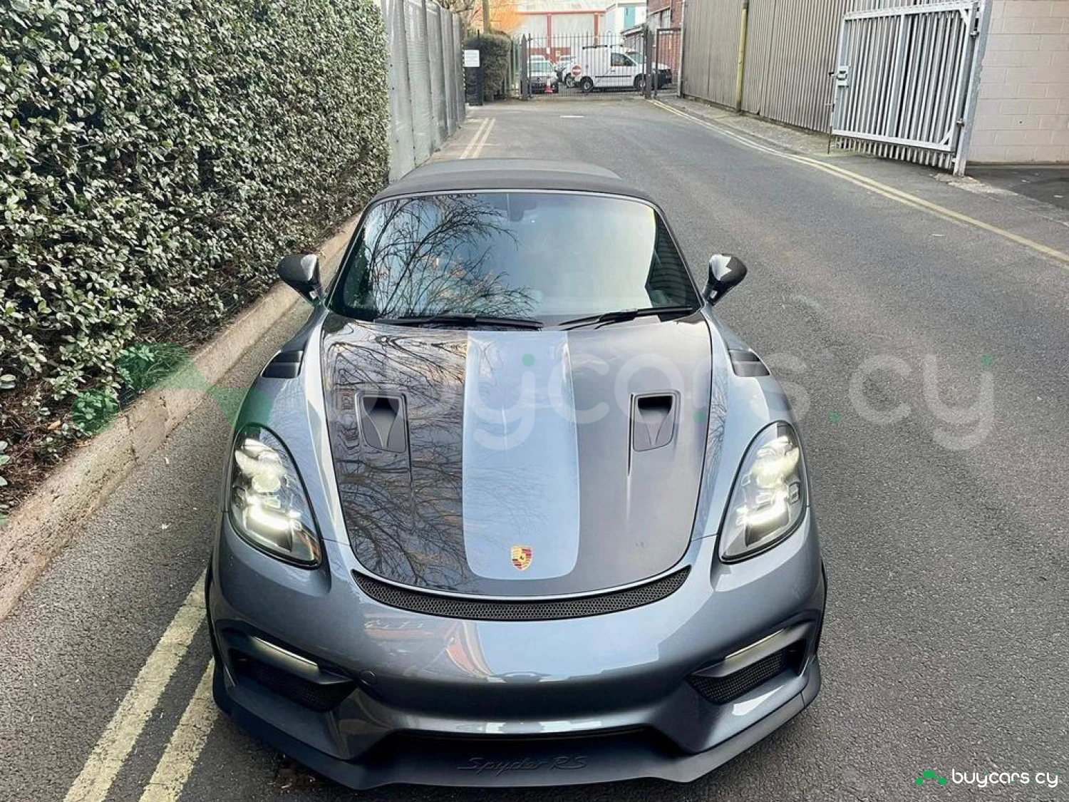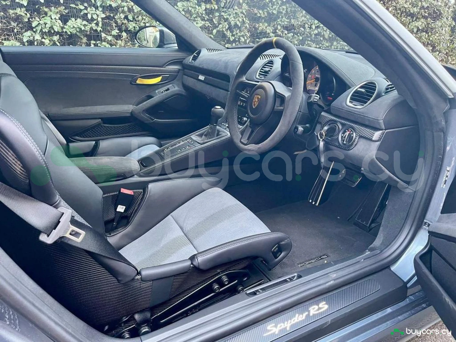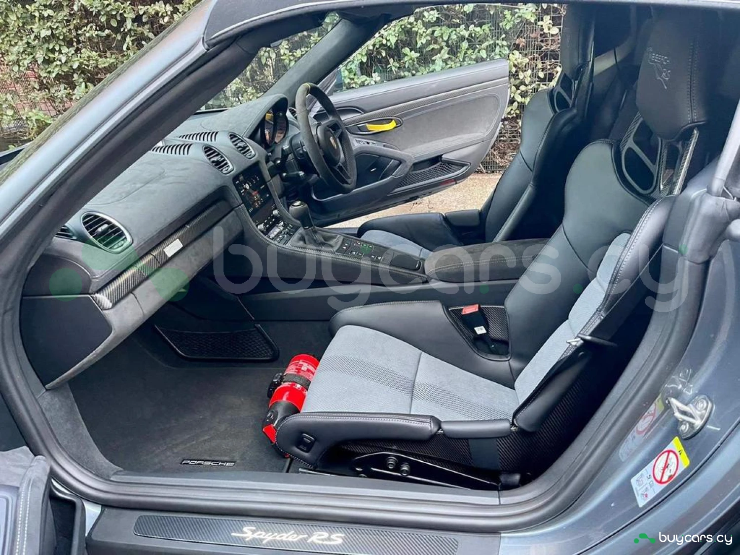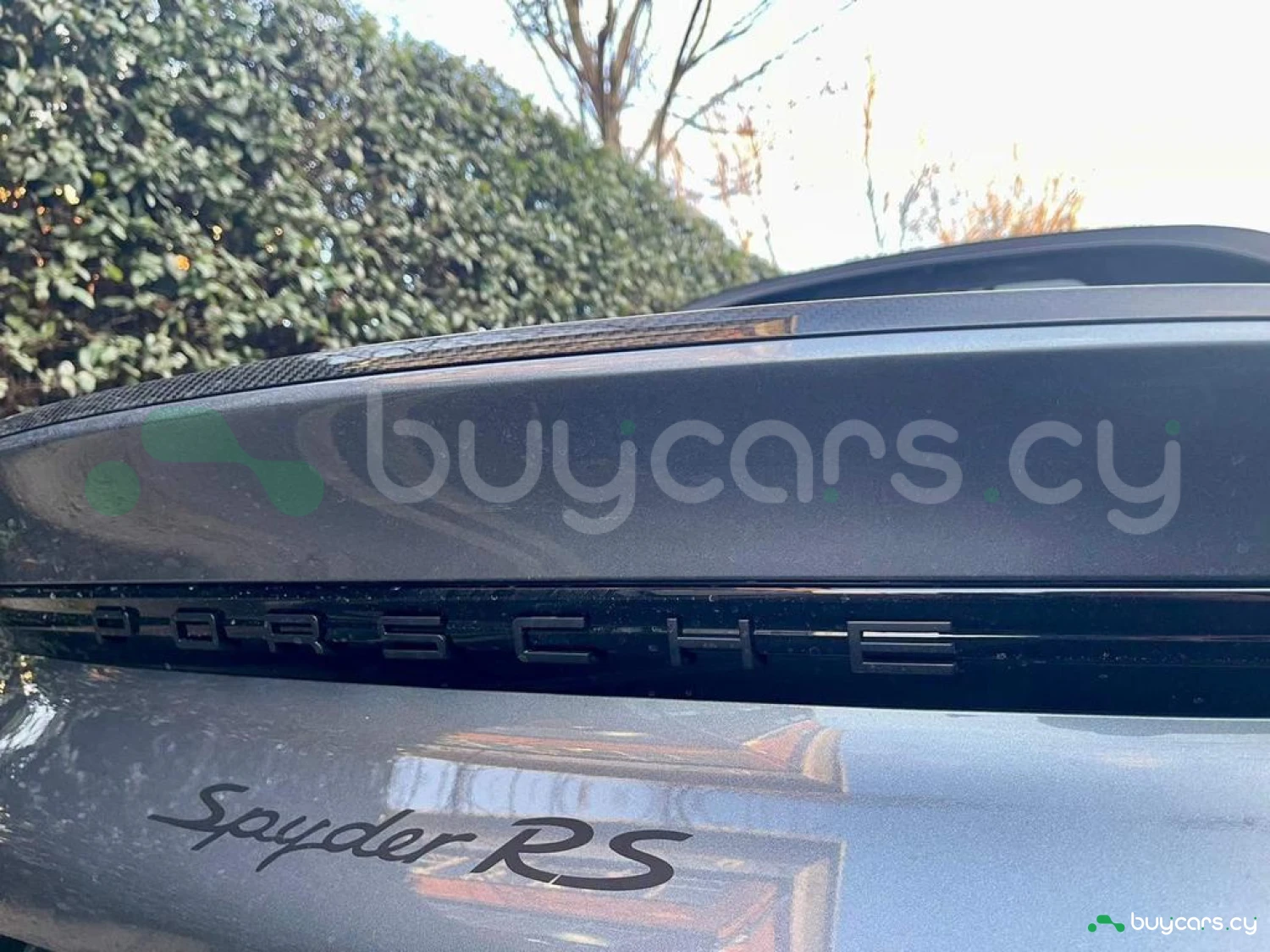 Exterior: Vanadium Grey metallic finish, 20" forged alloy wheels in dark silver, carbon-fiber reinforced plastic (CFRP) bonnet in body color with black NACA brake cooling inlets, CFRP front wheel arches in exterior color with black ventilation, fixed rear lip spoiler, manual lightweight Spyder roof in black fabric, black side window trims, Spyder RS model designation stripes, “PORSCHE” logo in satin black on rear apron, exclusive design fuel filler cap.