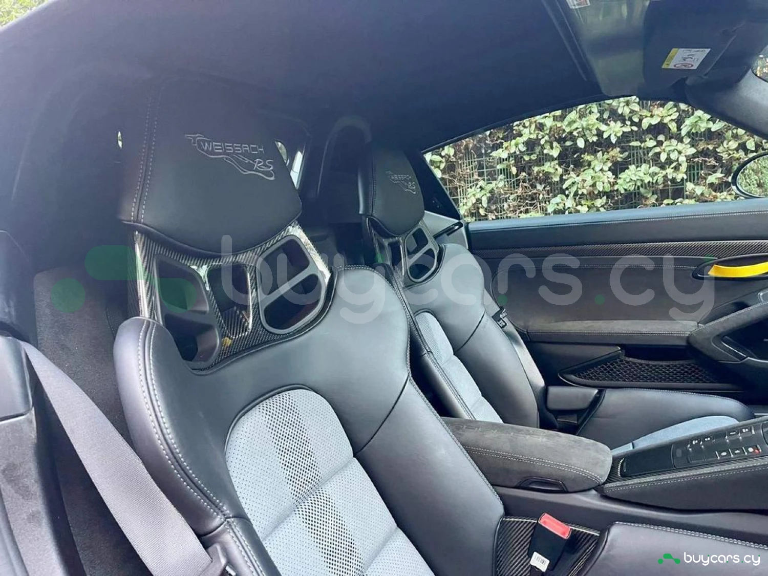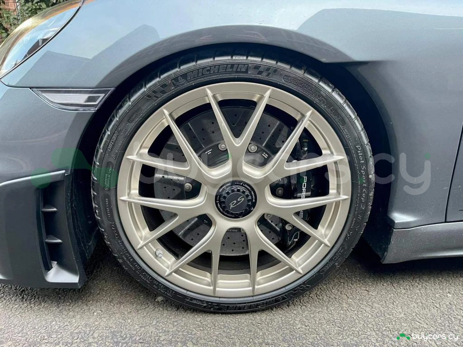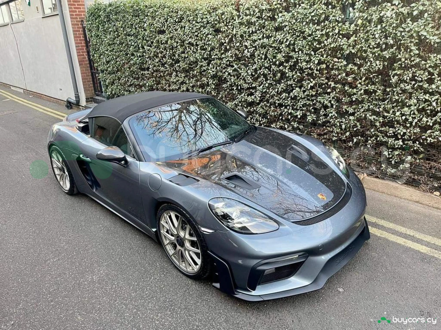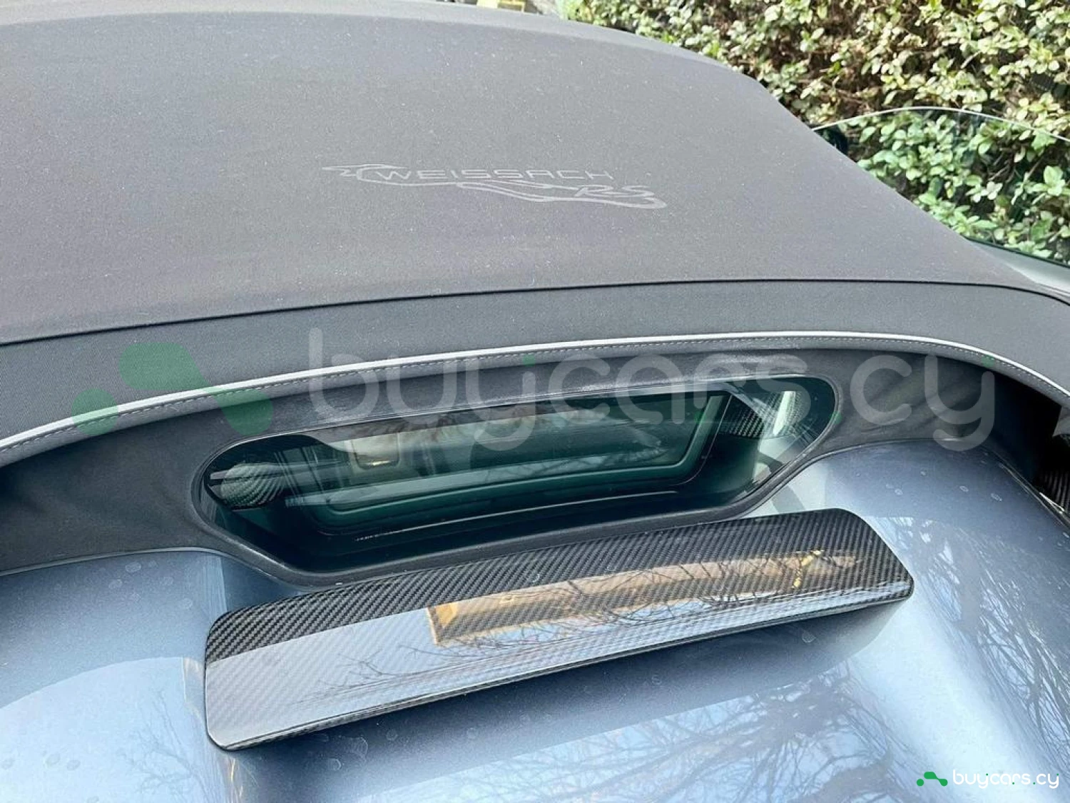 Exterior: Vanadium Grey metallic finish, 20" forged alloy wheels in dark silver, carbon-fiber reinforced plastic (CFRP) bonnet in body color with black NACA brake cooling inlets, CFRP front wheel arches in exterior color with black ventilation, fixed rear lip spoiler, manual lightweight Spyder roof in black fabric, black side window trims, Spyder RS model designation stripes, “PORSCHE” logo in satin black on rear apron, exclusive design fuel filler cap.