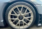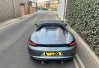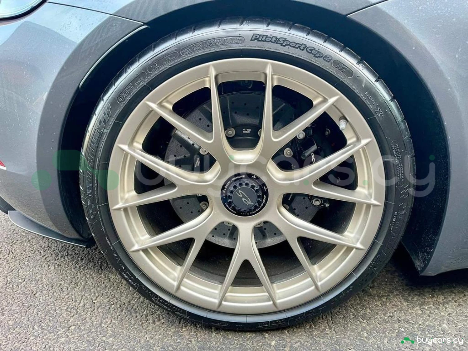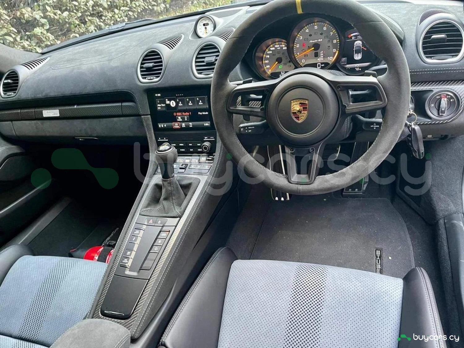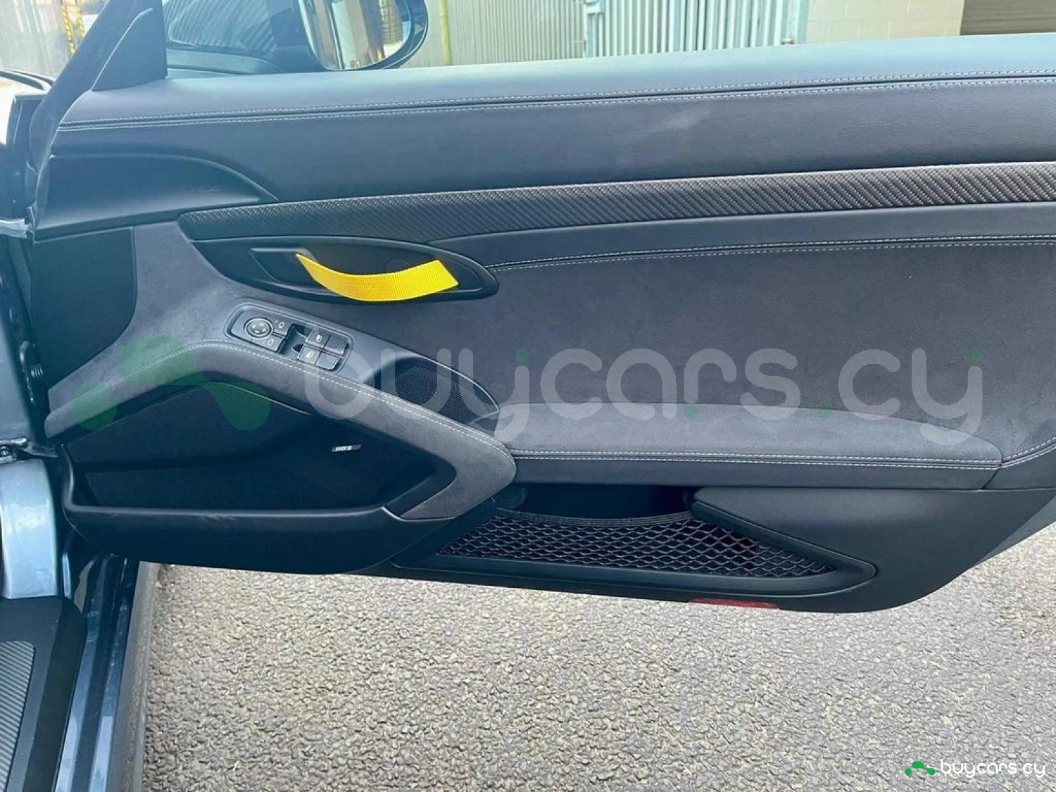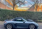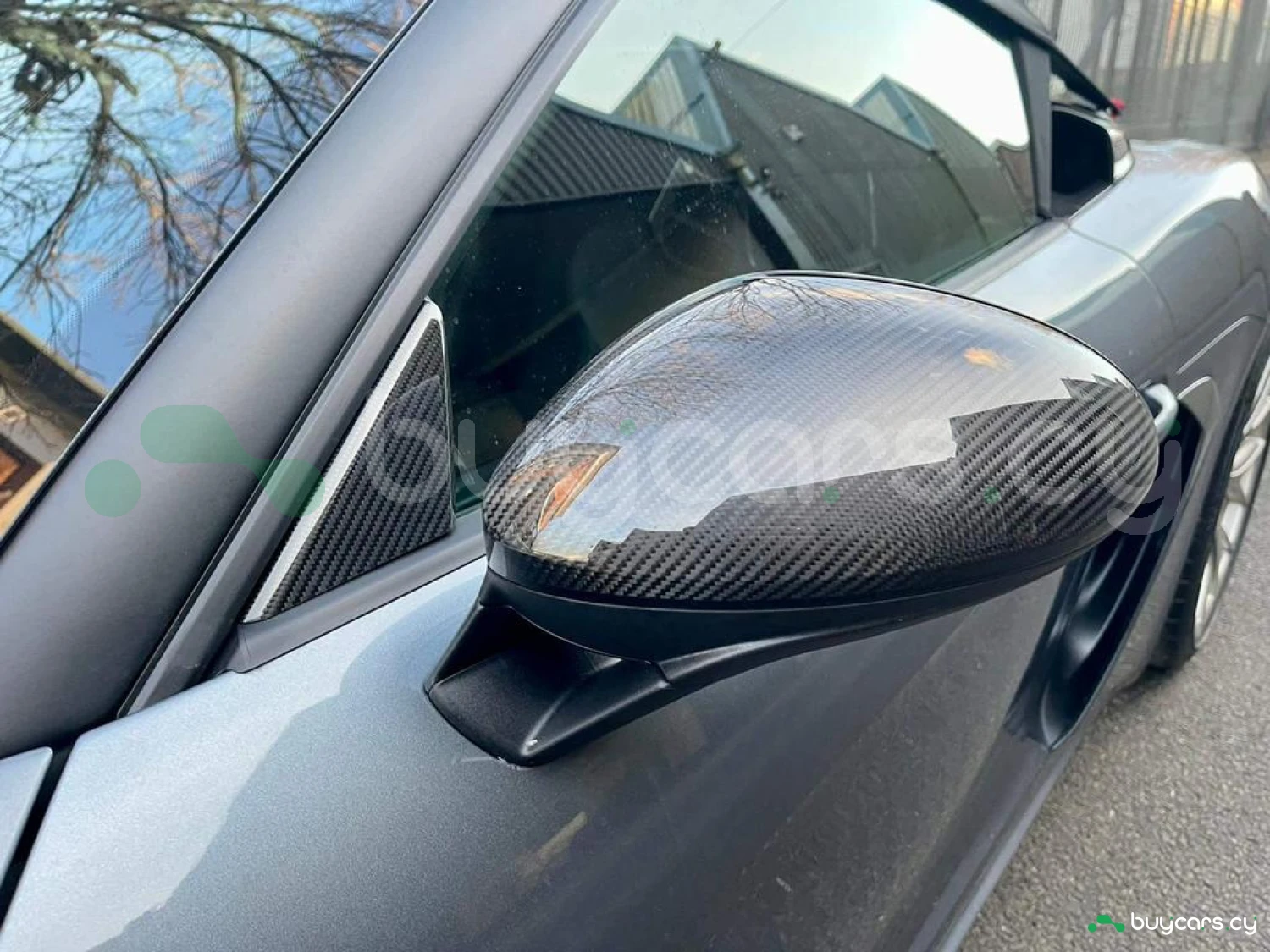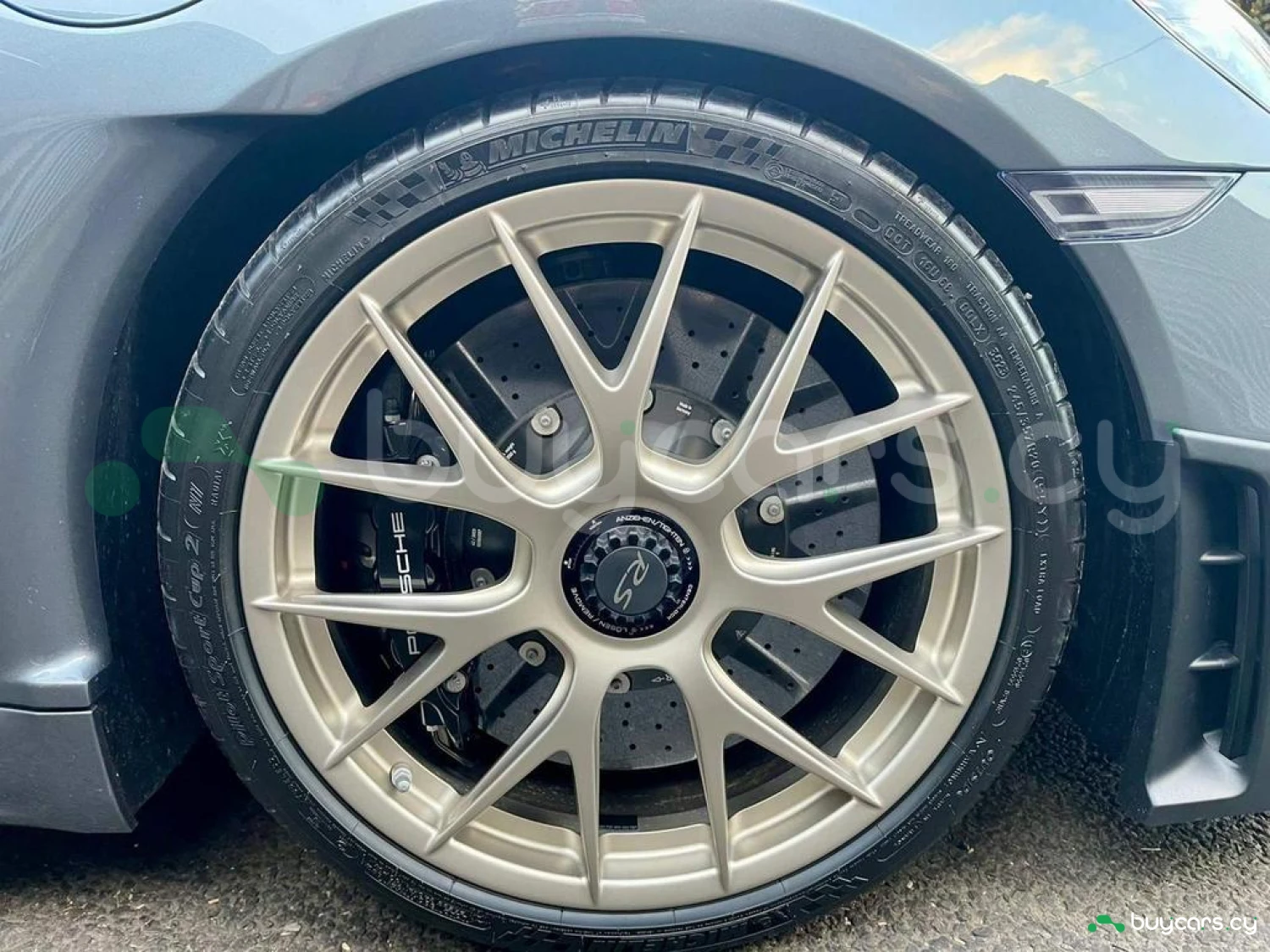 Exterior: Vanadium Grey metallic finish, 20" forged alloy wheels in dark silver, carbon-fiber reinforced plastic (CFRP) bonnet in body color with black NACA brake cooling inlets, CFRP front wheel arches in exterior color with black ventilation, fixed rear lip spoiler, manual lightweight Spyder roof in black fabric, black side window trims, Spyder RS model designation stripes, “PORSCHE” logo in satin black on rear apron, exclusive design fuel filler cap.