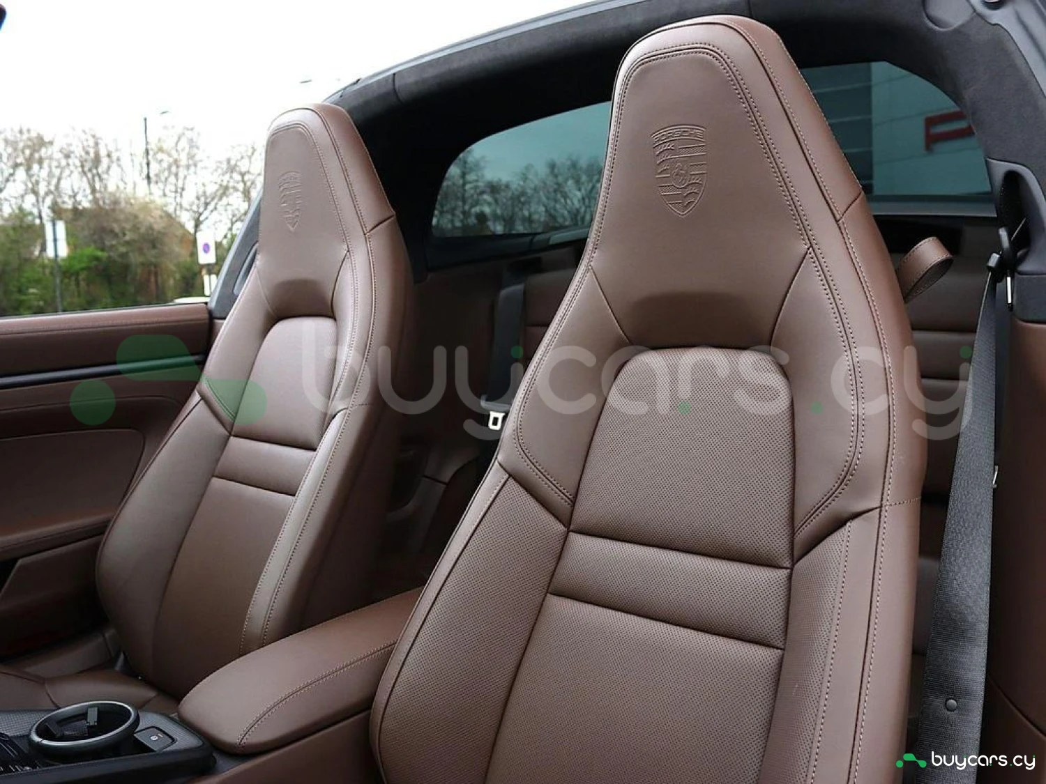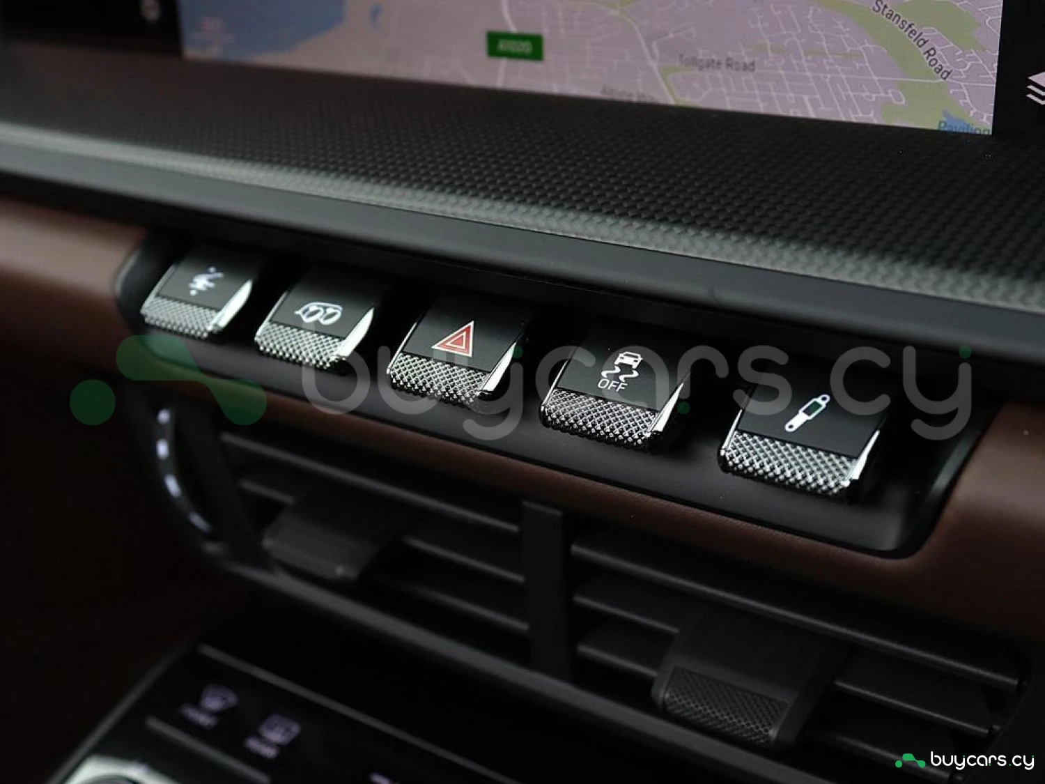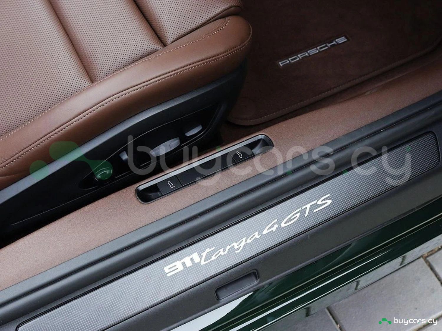 The cabin features 14-way power sports seats with memory (added extra), ventilated and heated front seats, and the Porsche Crest on headrests (added extra). Exclusive touches include the Carbon matt interior package, illuminated carbon door sills, ioniser, grey-tinted windscreen, and GT-style pedals and footrest. Deletion of the GTS logo on doors (added extra) gives it a sleek, understated look, while the Targa roll bar and other accents are finished in Satin Black.