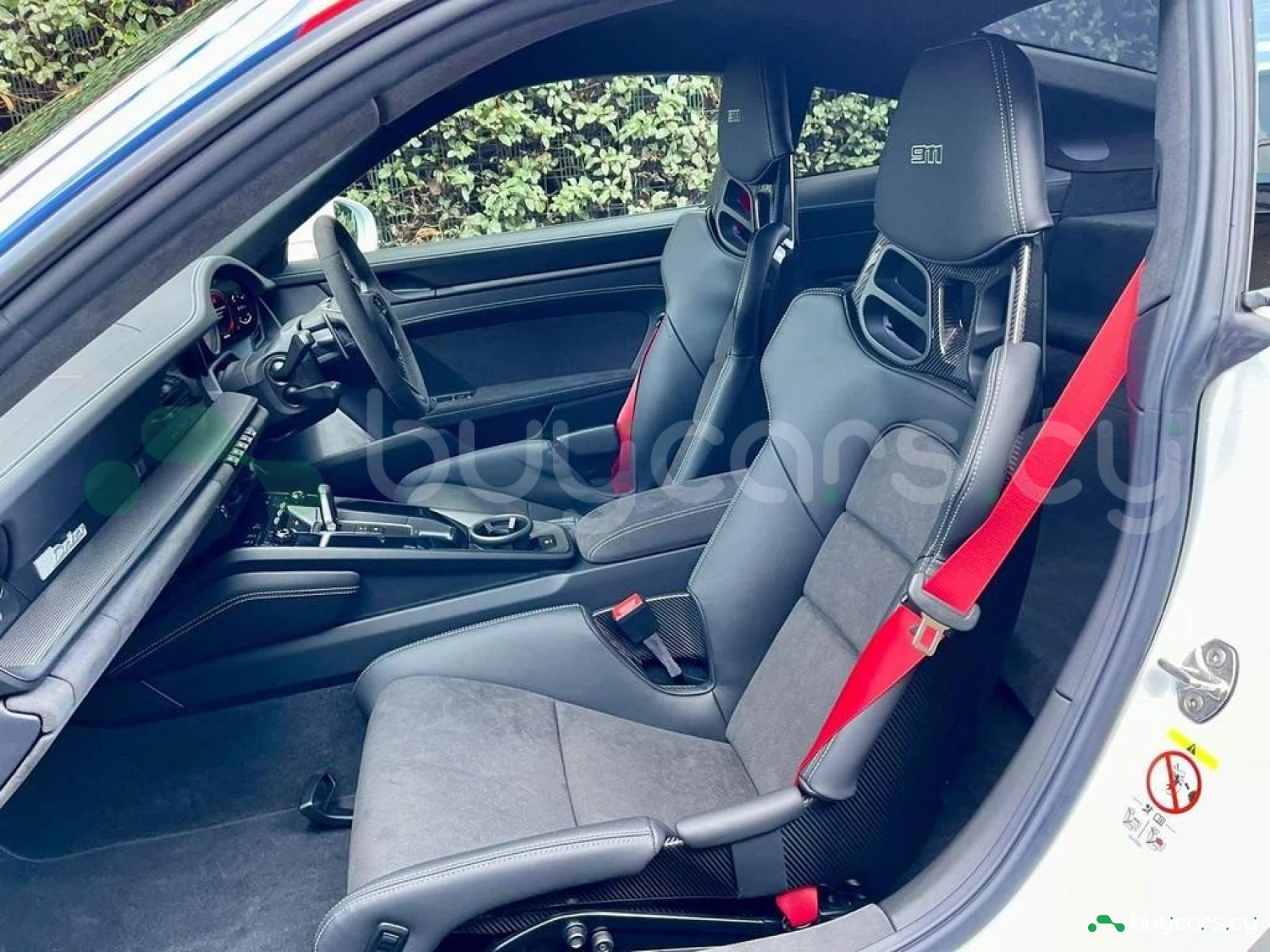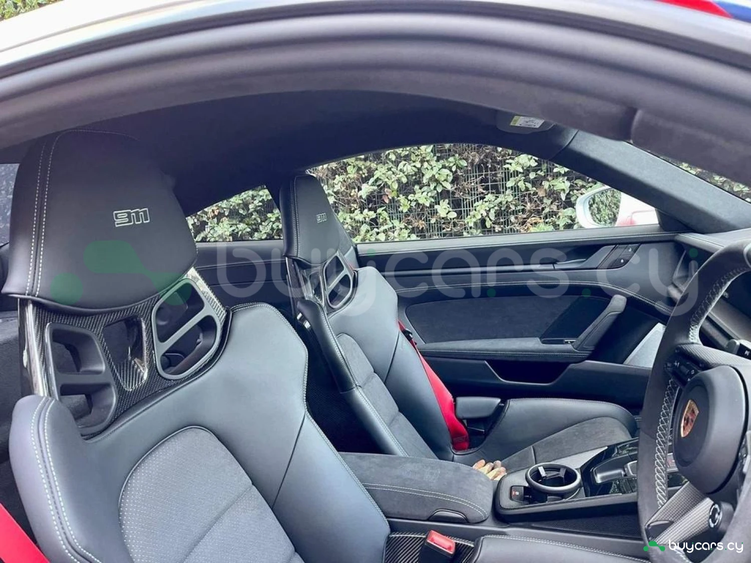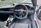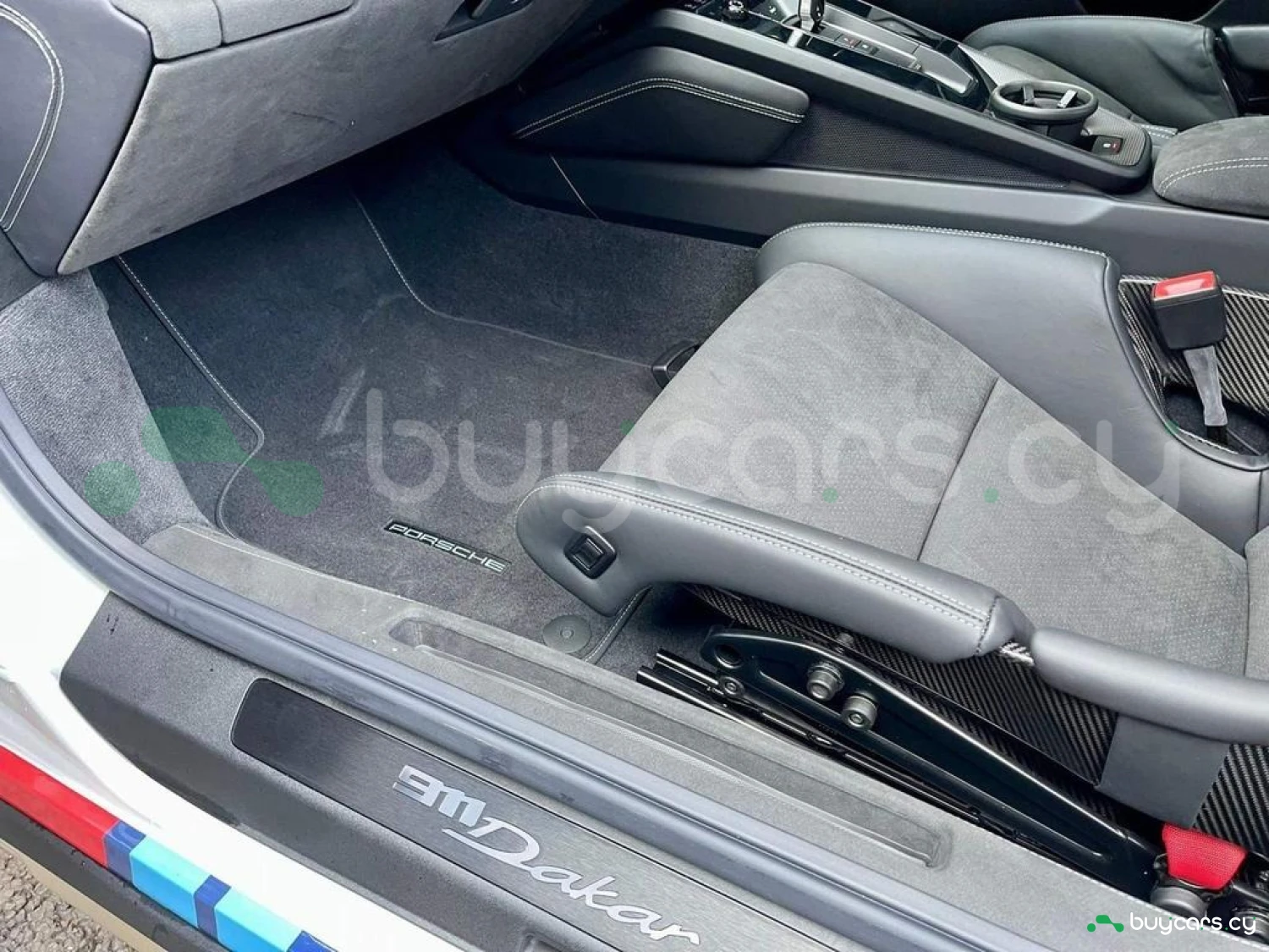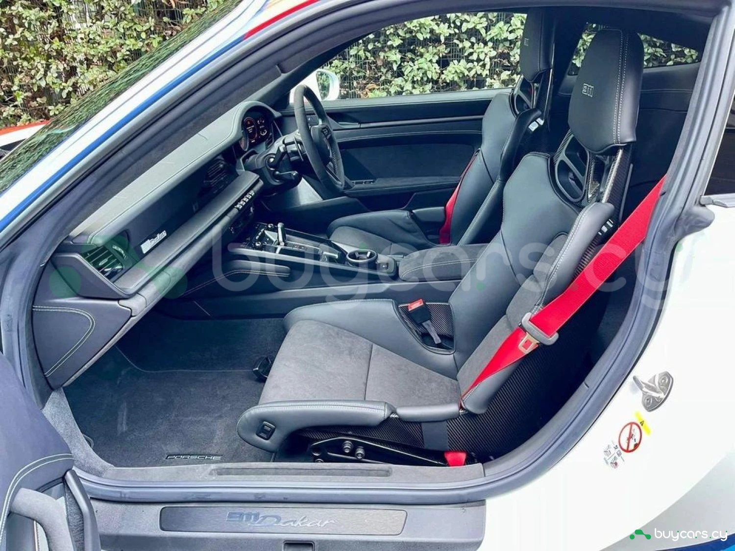 This 911 Dakar comes with a black full leather interior enhanced by the Interior Package in Race-Tex and dashboard trim in leather, giving it a purposeful yet luxurious feel. It features full bucket seats, a Race-Tex steering wheel and headliner, and unique seat belts in Guards Red (added extra). Other exclusive touches include optional stitching, Sport Chrono stopwatch in Guards Red, and a bespoke vehicle key painted with a leather key pouch (added extras). The Sport steering wheel with dark chrome bezel and red marker, aluminium PDK gear selector, and carbon accents throughout give the interior a focused and motorsport-inspired character.