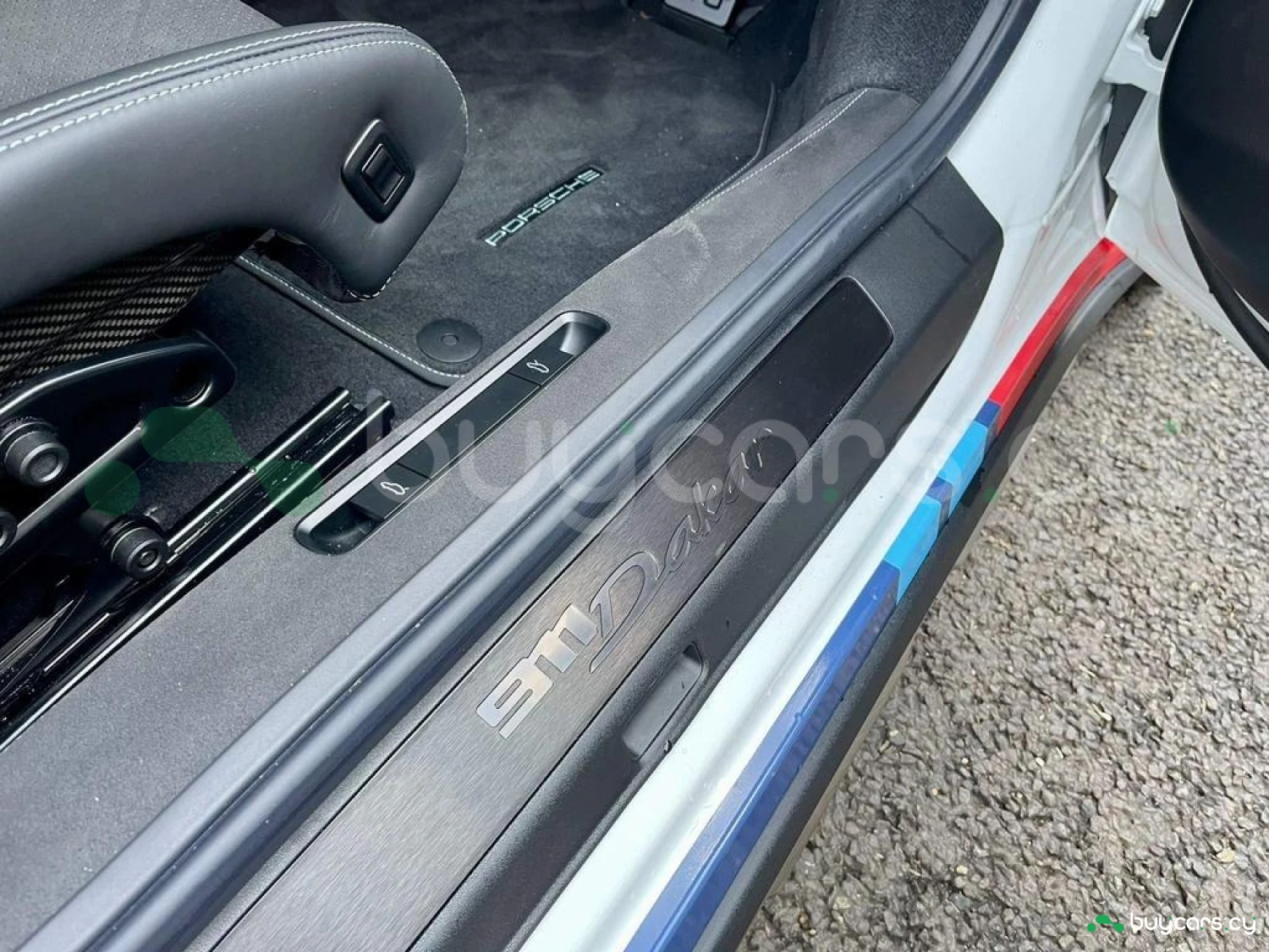 Finished in Carrara White Metallic, the 911 Dakar stands out with 23-inch Pelope alloy wheels in diamond-finished Shiny Black with titanium bolts, a bonnet in visible carbon fibre, and a full exterior package in shiny carbon fibre (added extras). Additional elements include Decorative Adhesive Set – Rallye 1978, 911 Dakar LED logo door courtesy lights, roof electrification with external power connection, and a fixed front apron and rear apron in stainless steel. Privacy glass, lightweight carbon components, and a clear LED taillight strip complete its aggressive and purposeful styling.