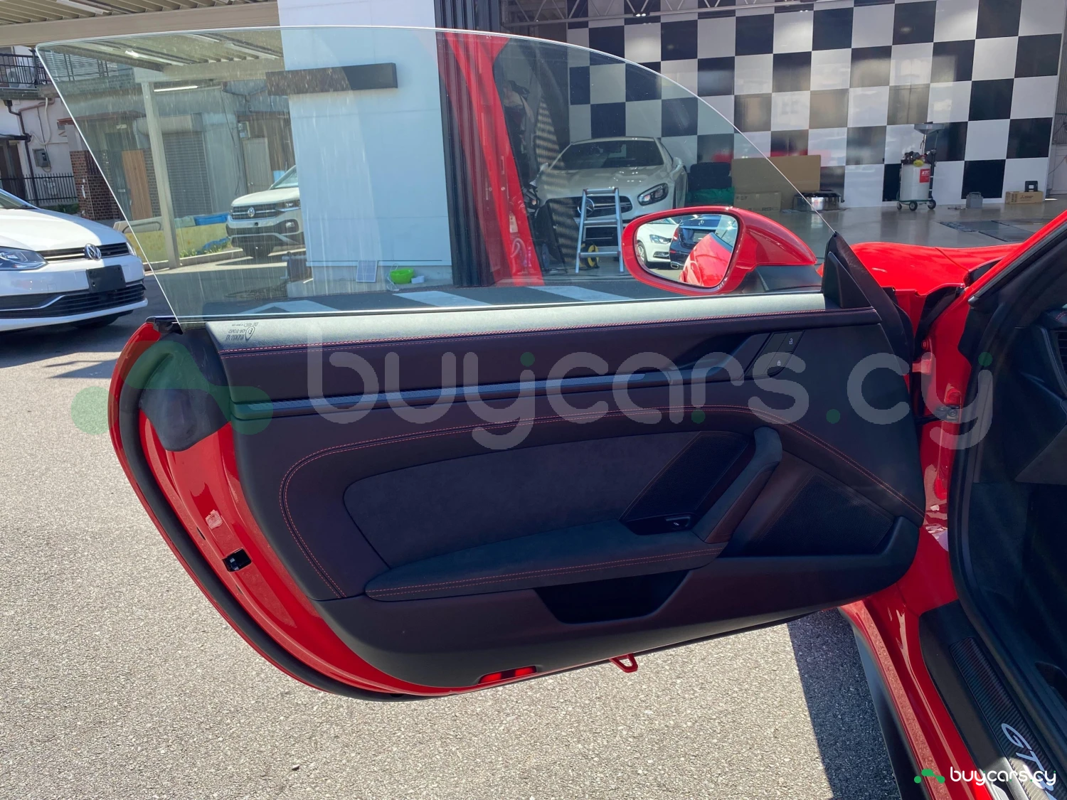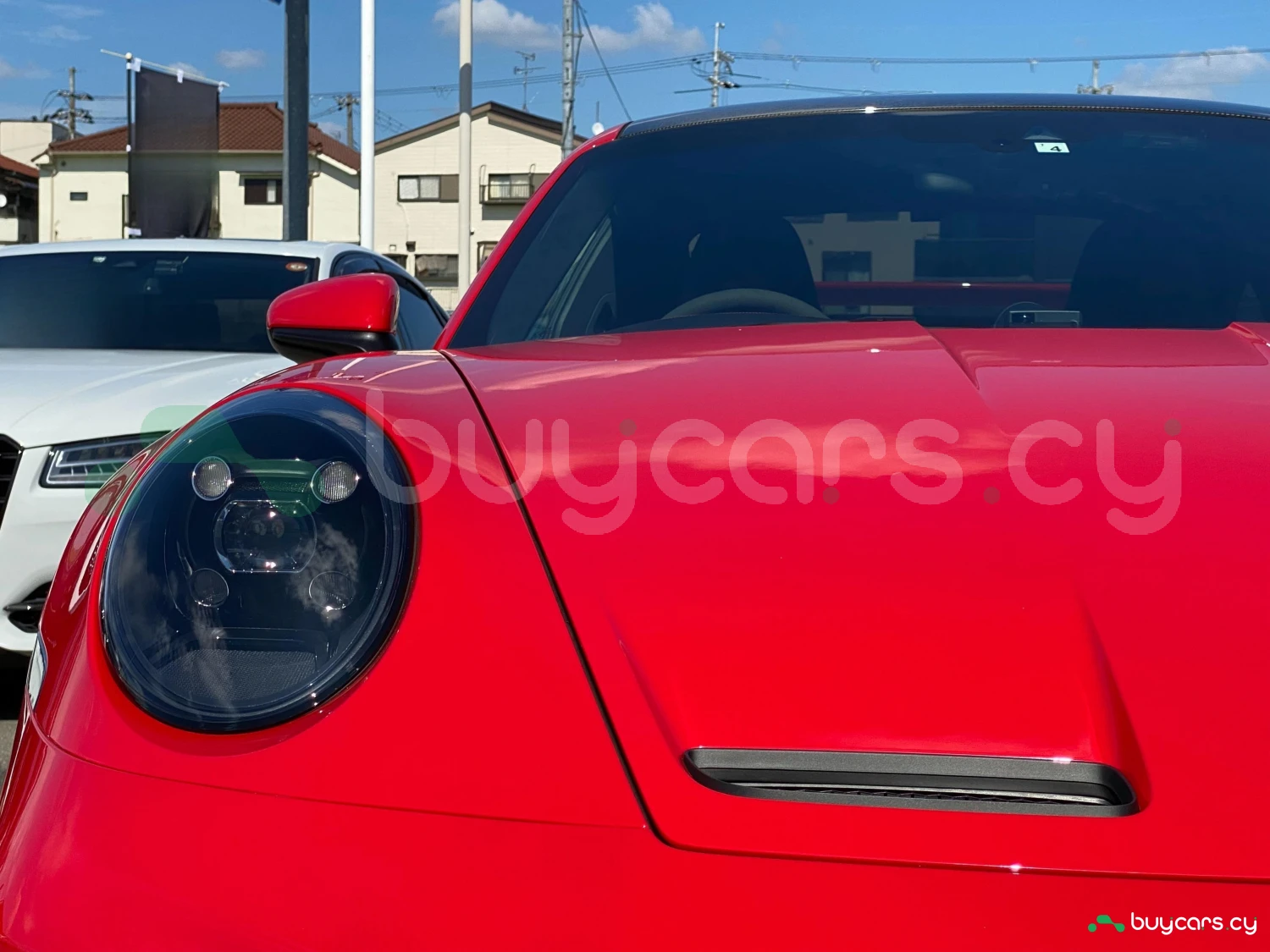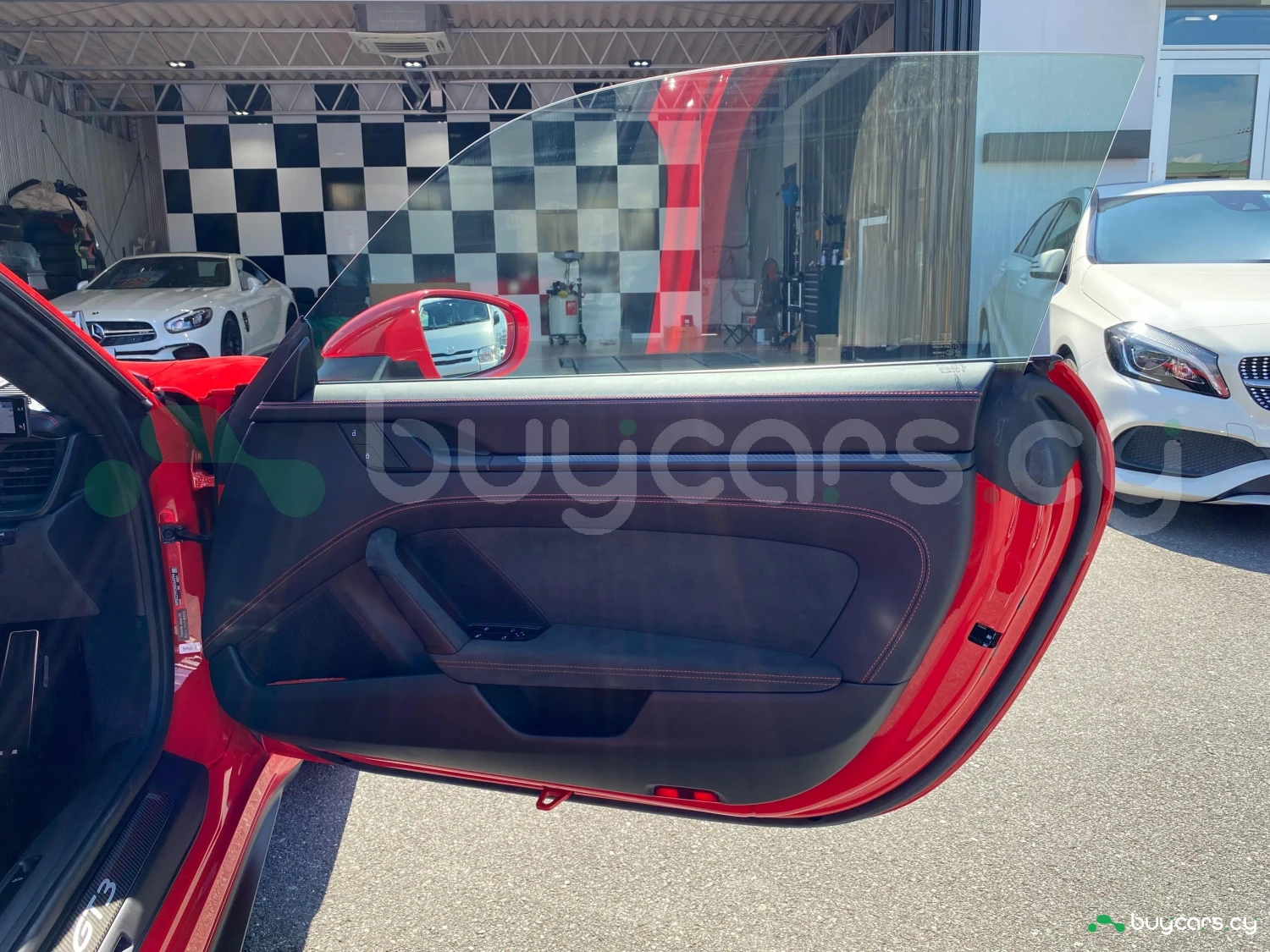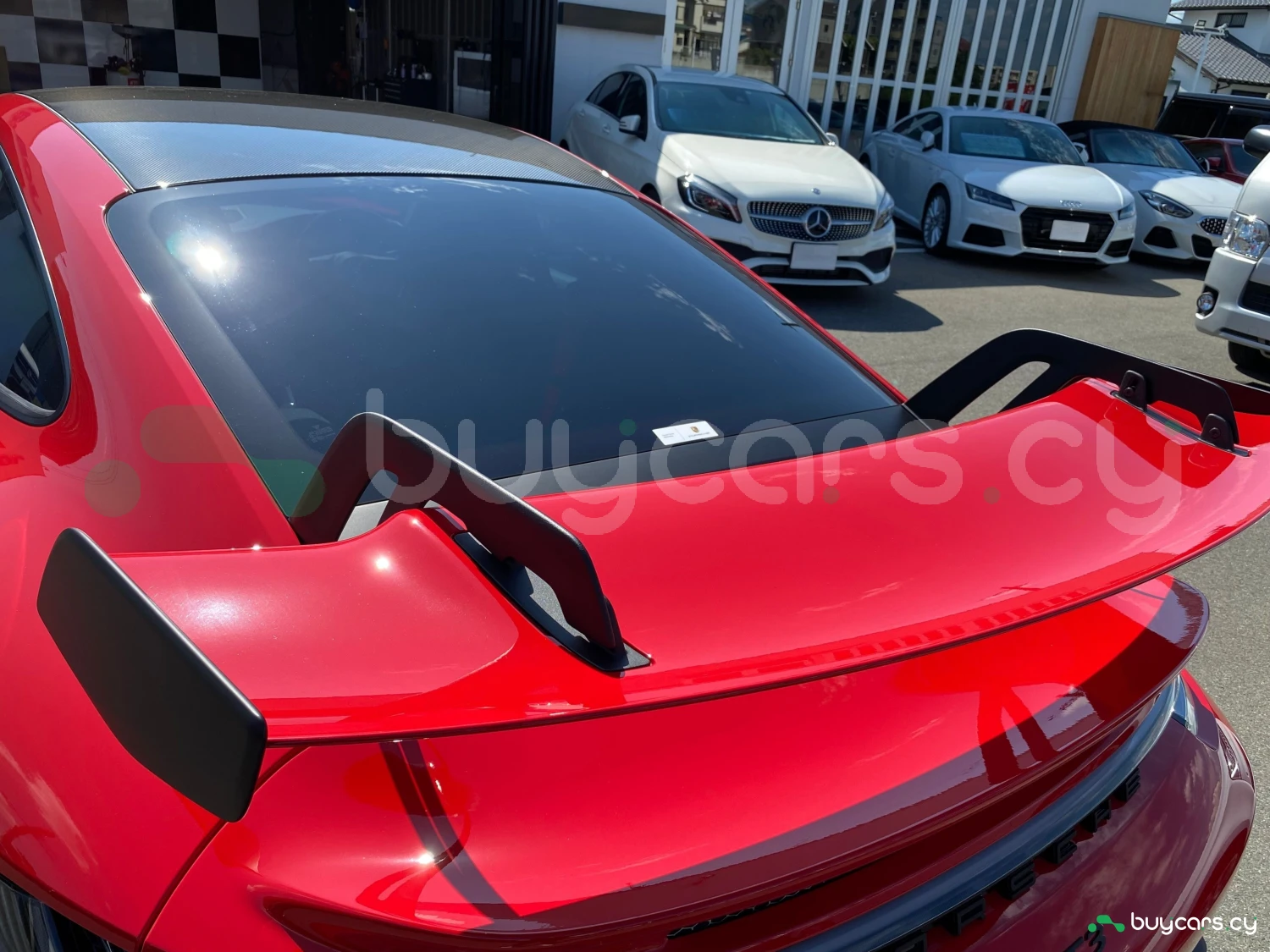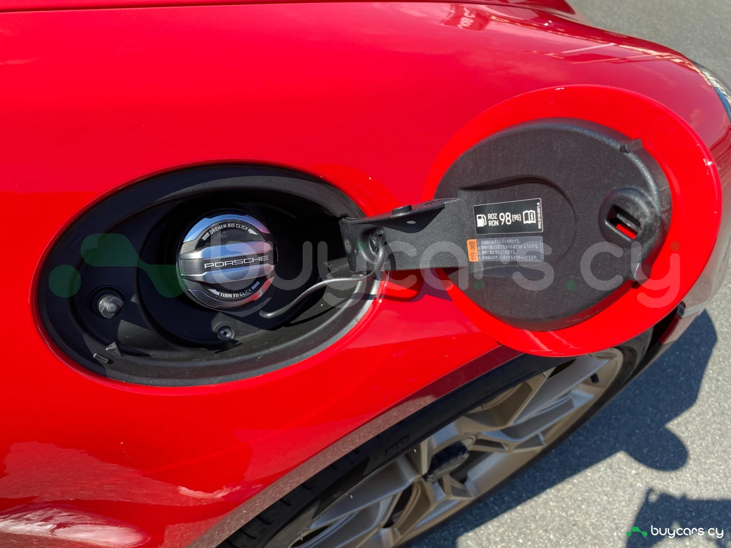 Sports coupe, 2 doors, 2 seats, 4.0L (4000cc) naturally aspirated gasoline engine, 7-speed PDK automatic transmission with manual mode, 2WD (rear-wheel drive), Right-hand drive, Guards Red, Carbon roof, Chrono Package, Adaptive cruise control, ABS, Power steering, Anti-skid system, Driver/Passenger/Side/Curtain airbags, Rear camera, Obstacle sensors, Idling stop system, Anti-theft system, LED headlights, Aluminum wheels (satin neodymium finish), Black painted brake calipers, Electric seats, Heated seats, Air conditioning, Navigation system (memory), Music player connectivity, Dashcam, Smart key & keyless entry, Power windows