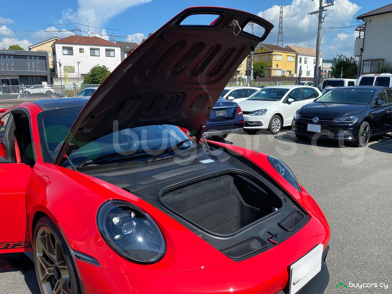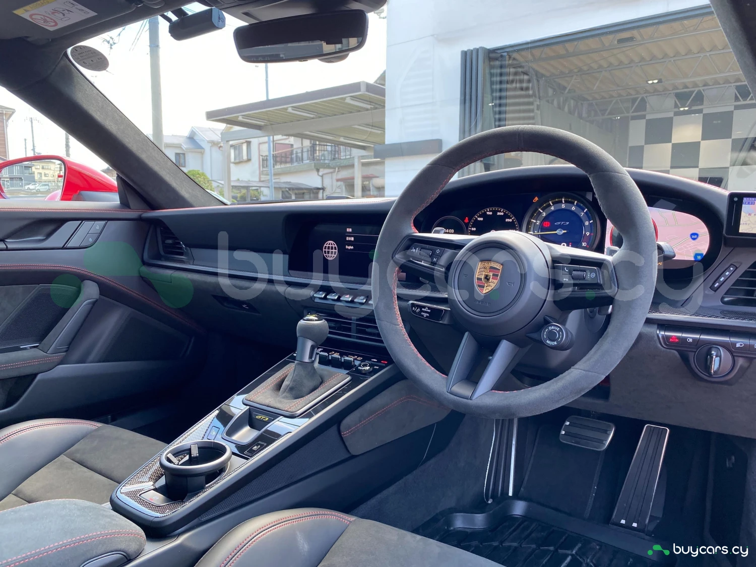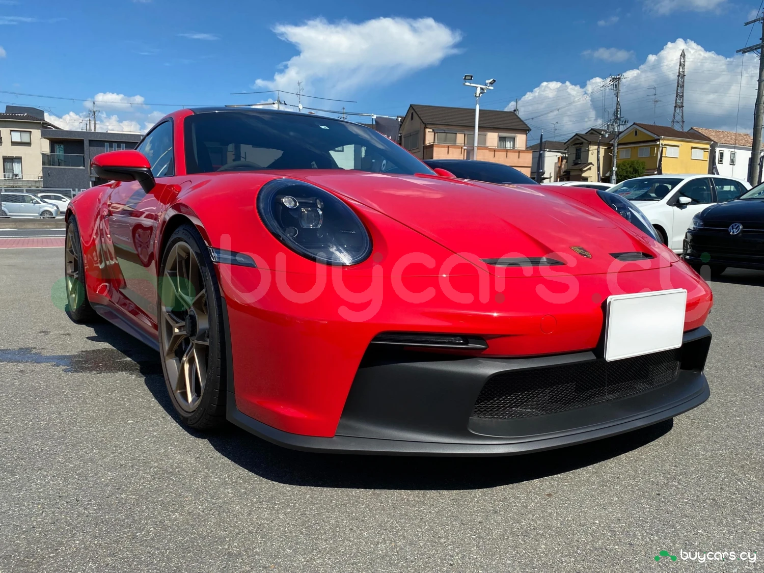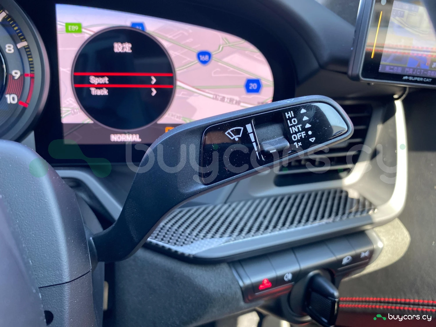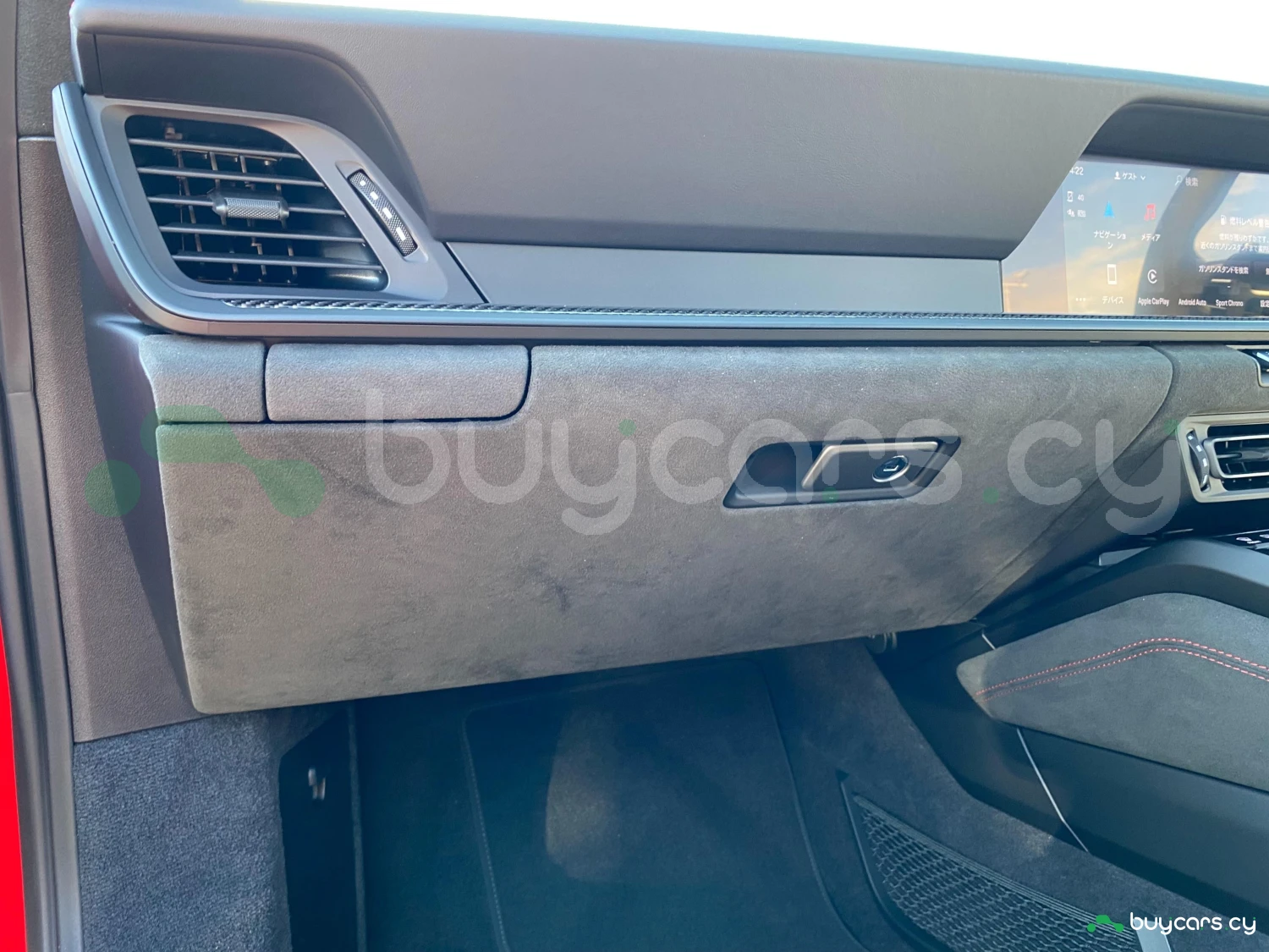 Sports coupe, 2 doors, 2 seats, 4.0L (4000cc) naturally aspirated gasoline engine, 7-speed PDK automatic transmission with manual mode, 2WD (rear-wheel drive), Right-hand drive, Guards Red, Carbon roof, Chrono Package, Adaptive cruise control, ABS, Power steering, Anti-skid system, Driver/Passenger/Side/Curtain airbags, Rear camera, Obstacle sensors, Idling stop system, Anti-theft system, LED headlights, Aluminum wheels (satin neodymium finish), Black painted brake calipers, Electric seats, Heated seats, Air conditioning, Navigation system (memory), Music player connectivity, Dashcam, Smart key & keyless entry, Power windows