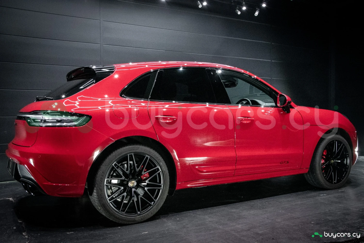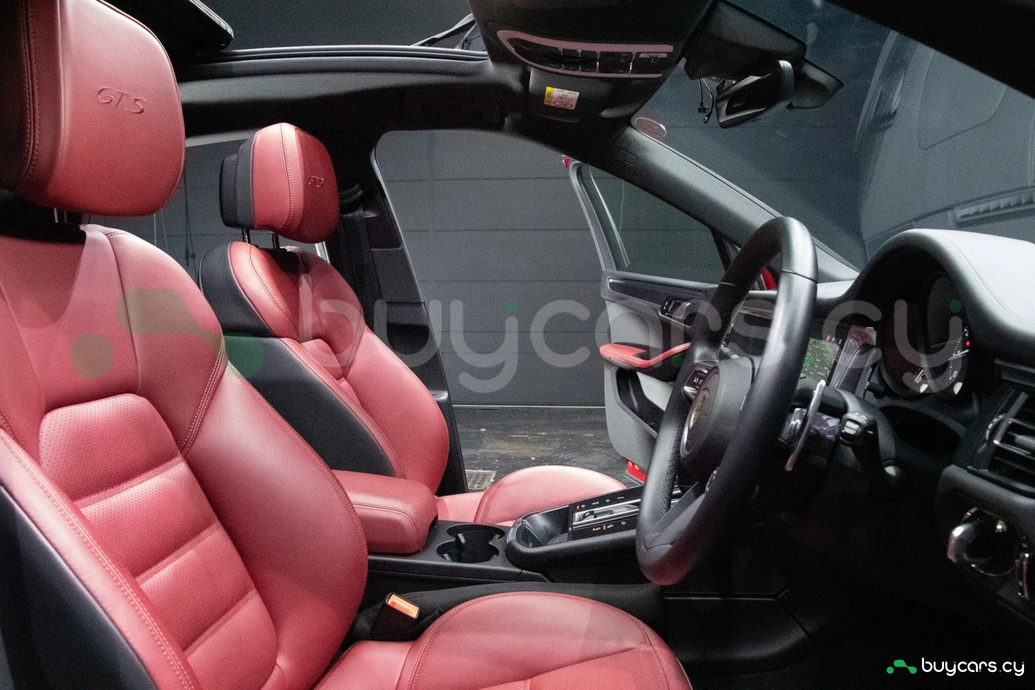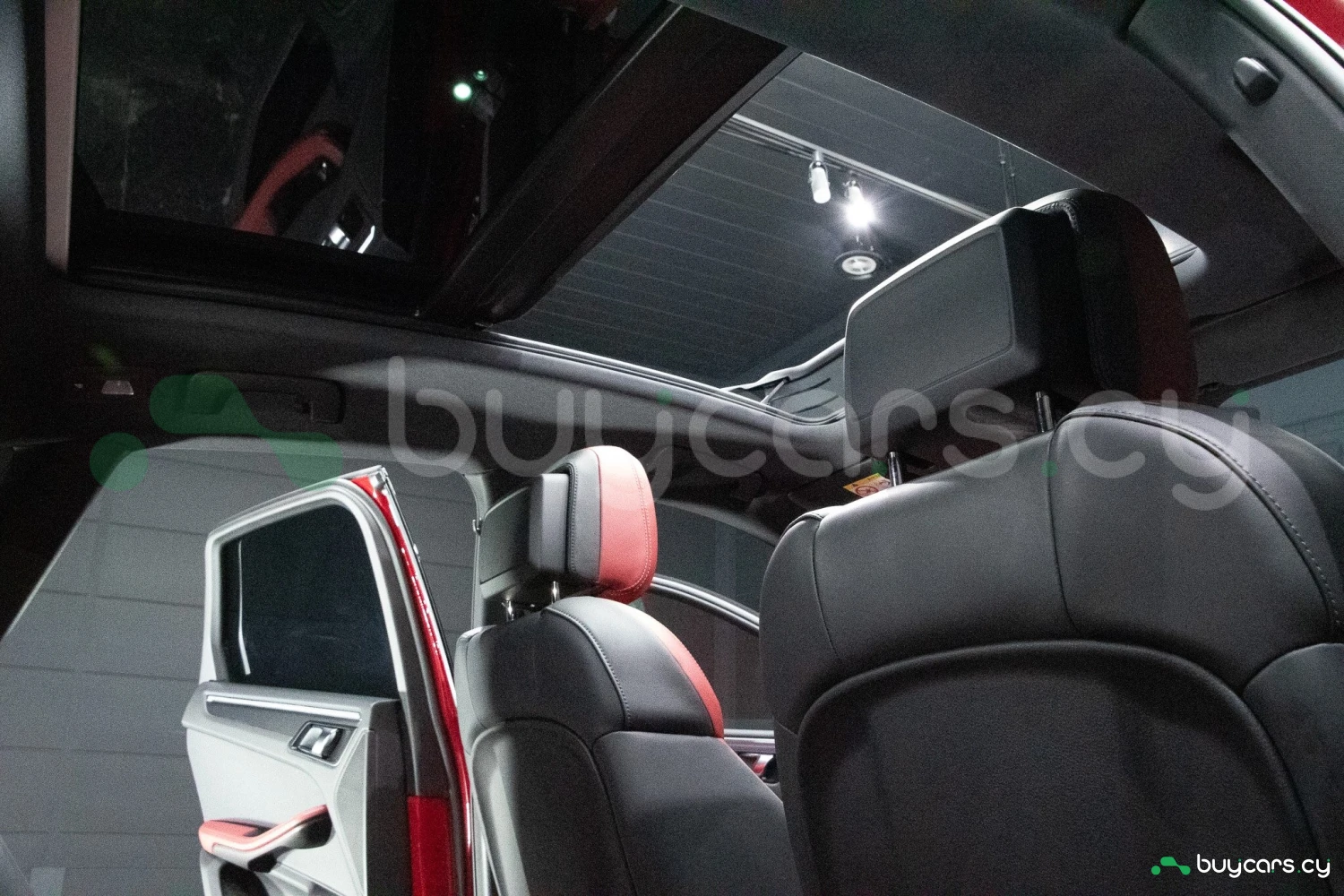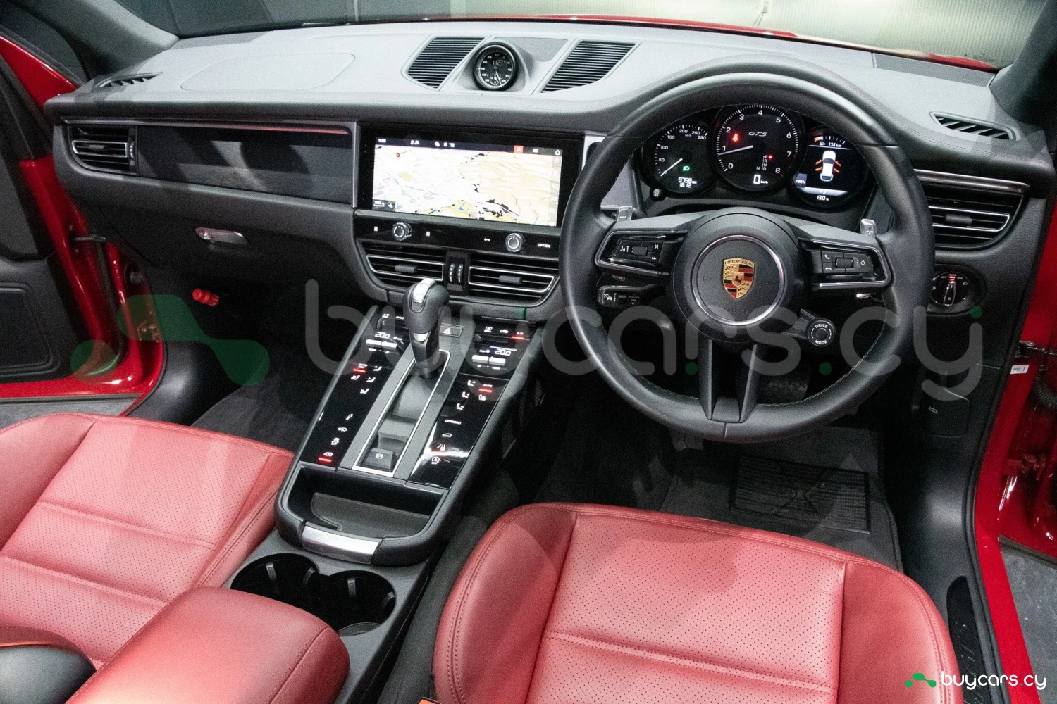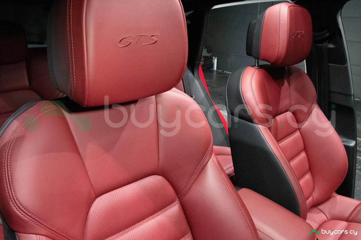The bold Carmine Red paint is offset by high-gloss black exterior elements, including window trim, mirrors, and side blades, reinforcing the vehicle's sporty stance. Signature GTS styling elements such as a blacked-out rear diffuser, dark LED taillights, and 21-inch alloy wheels complete the aggressive look. LED headlights with PDLS+ provide adaptive lighting for enhanced nighttime visibility and safety.