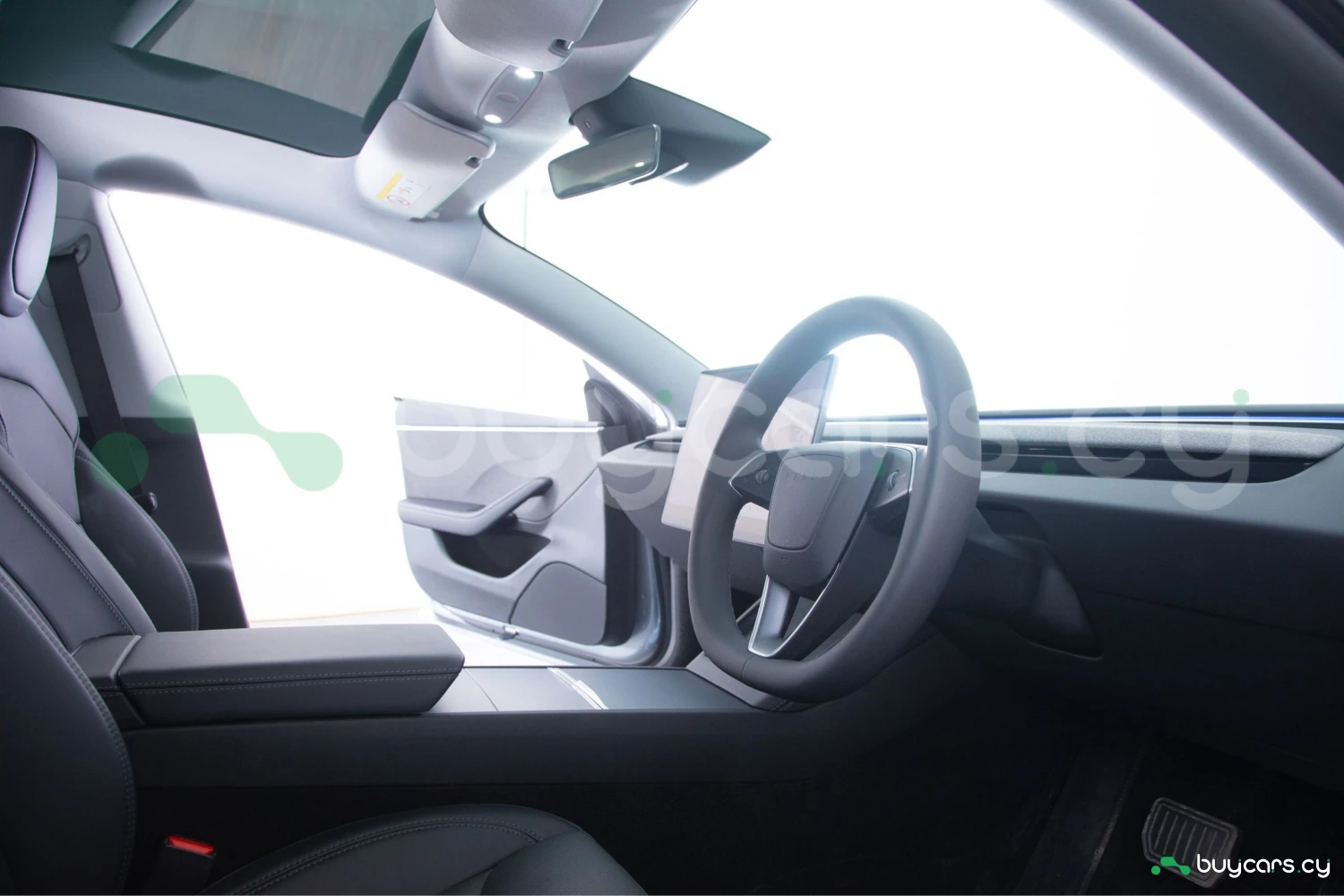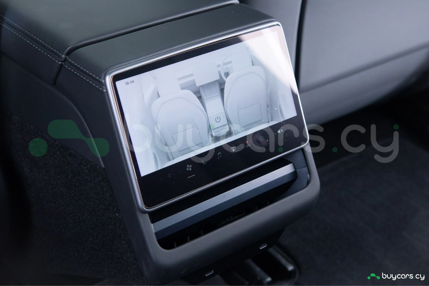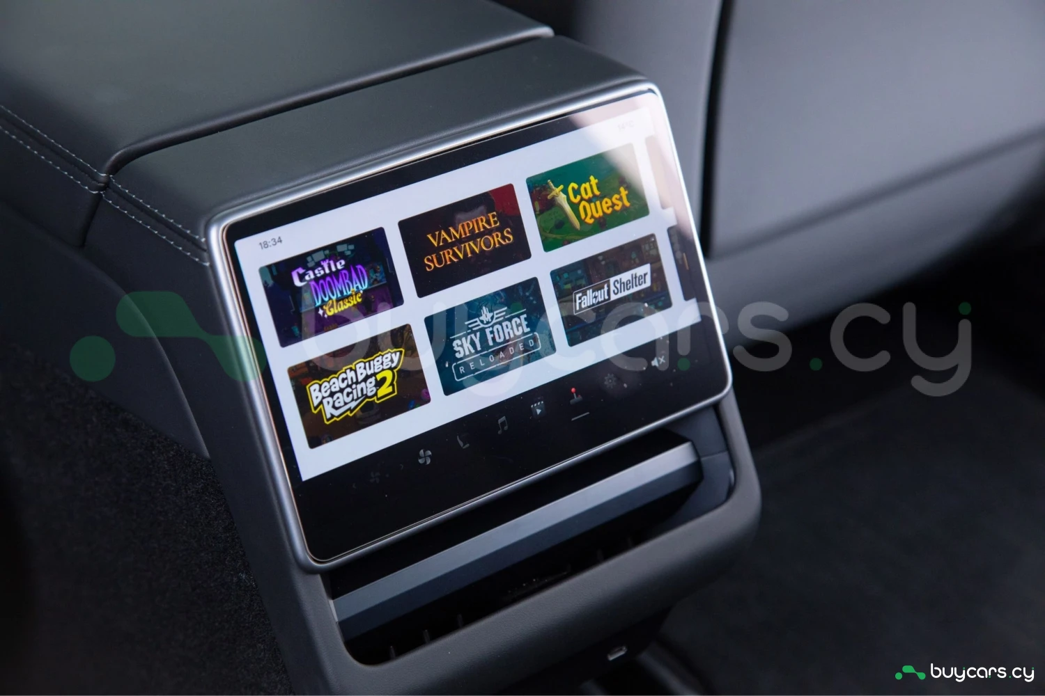 The minimalist Tesla interior features a large central touchscreen interface, rear passenger monitor, heated seats, and a heated steering wheel. Advanced connectivity, digital controls, and Tesla’s FSD Computer 4 enhance the driving experience with cutting-edge software capabilities.