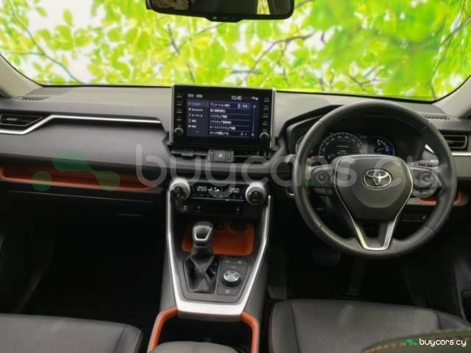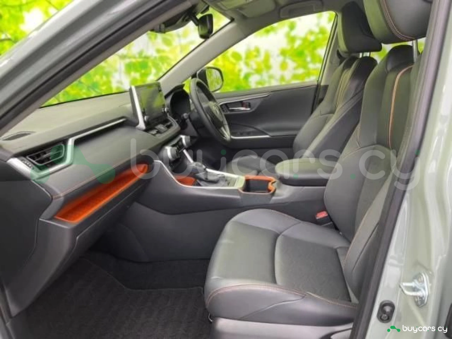 The cabin of the RAV4 Adventure is designed for practicality and comfort, with durable soft-touch materials, orange accent stitching, and an adventure-themed interior trim. It offers spacious seating for five, heated front seats, dual-zone climate control, and a leather-wrapped steering wheel. The infotainment system includes an 8-inch touchscreen with Apple CarPlay and Android Auto, along with a 7-inch digital driver display.