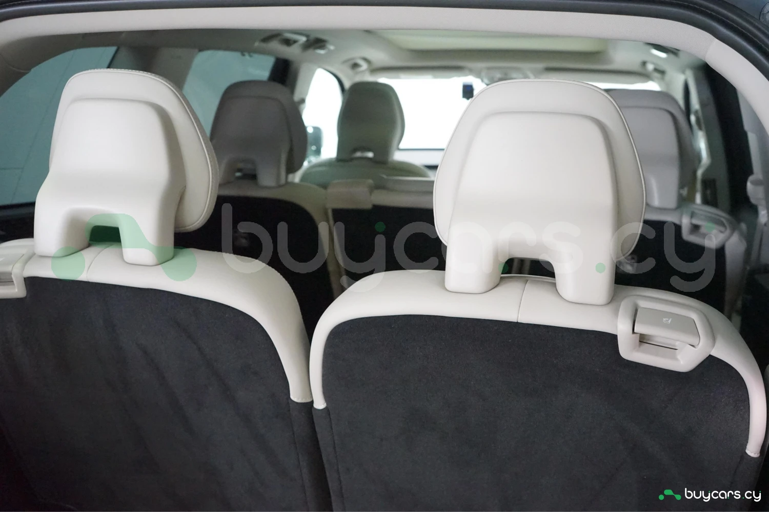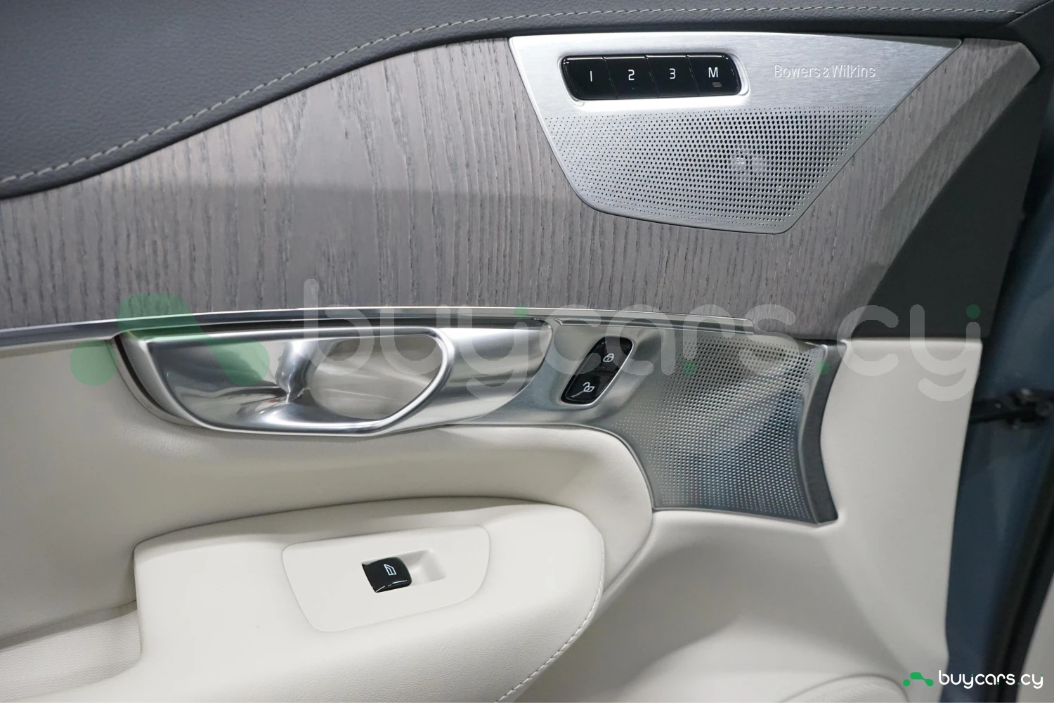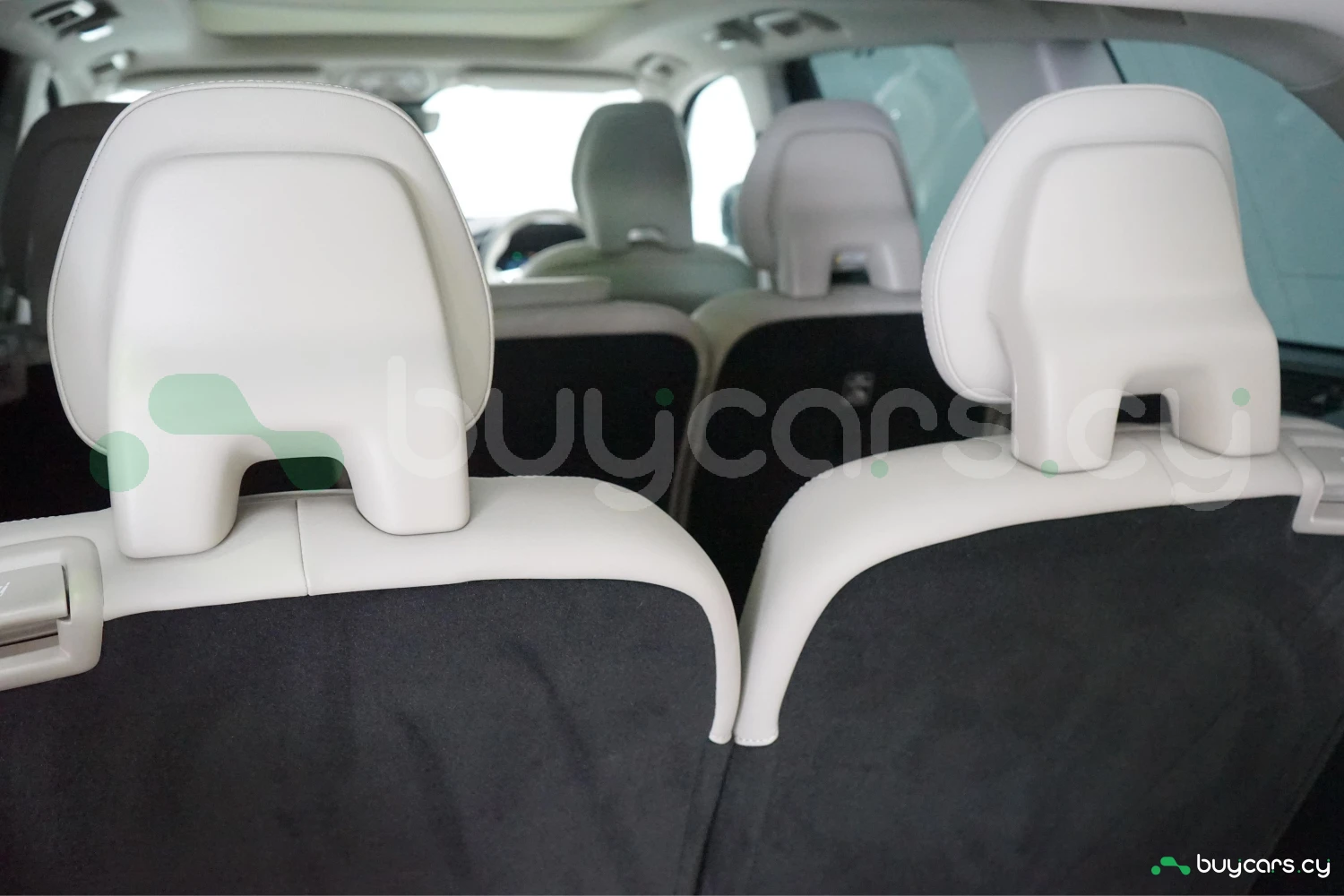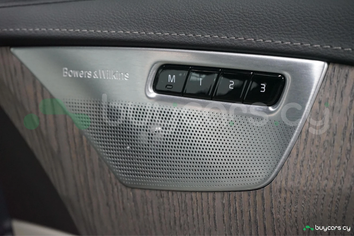 The cabin accommodates seven passengers with heated leather seats, panoramic sunroof, Bowers & Wilkins audio, and Volvo Intellisafe. Navigation, Bluetooth, USB connectivity, and a power back door enhance convenience.