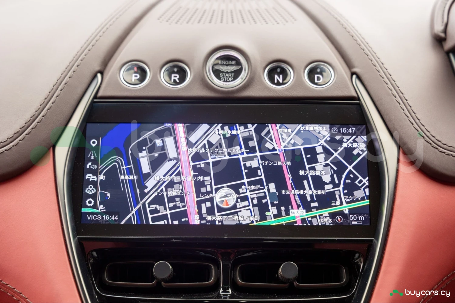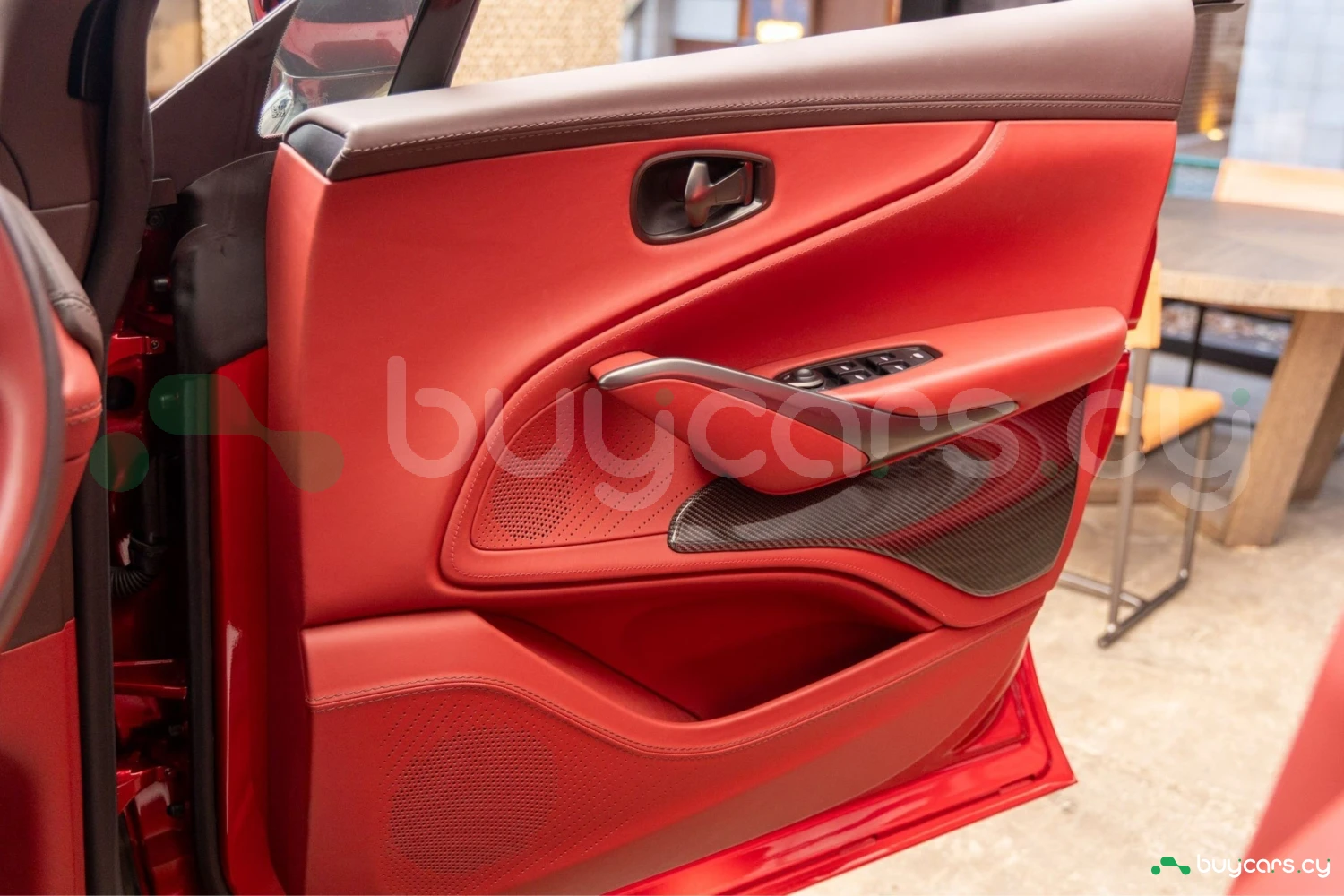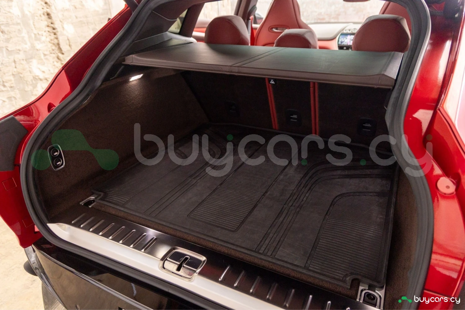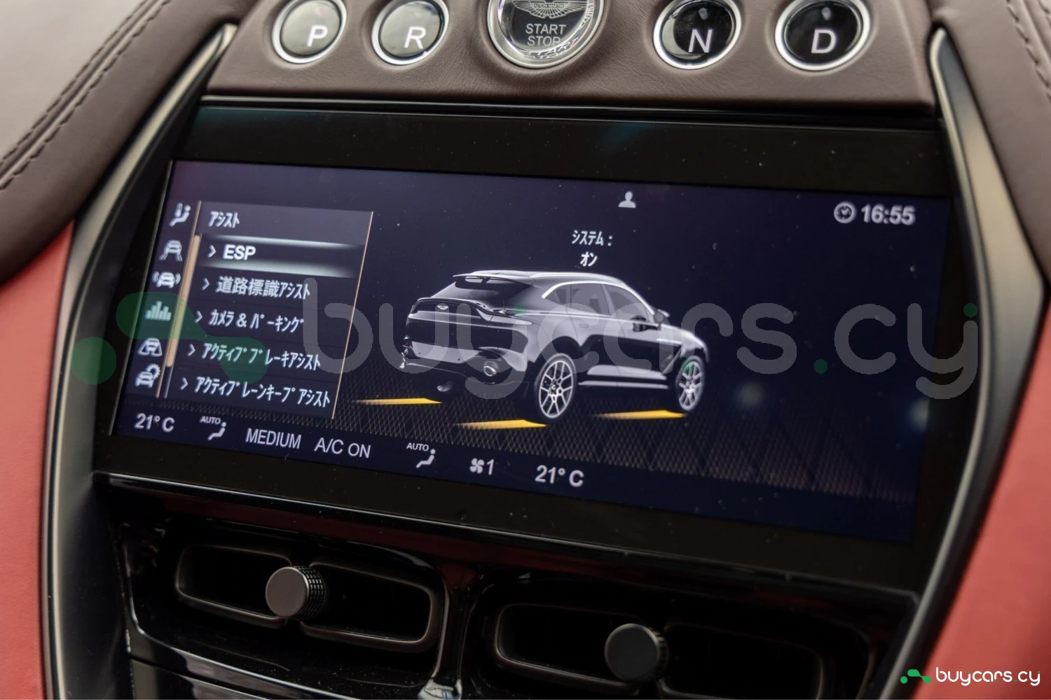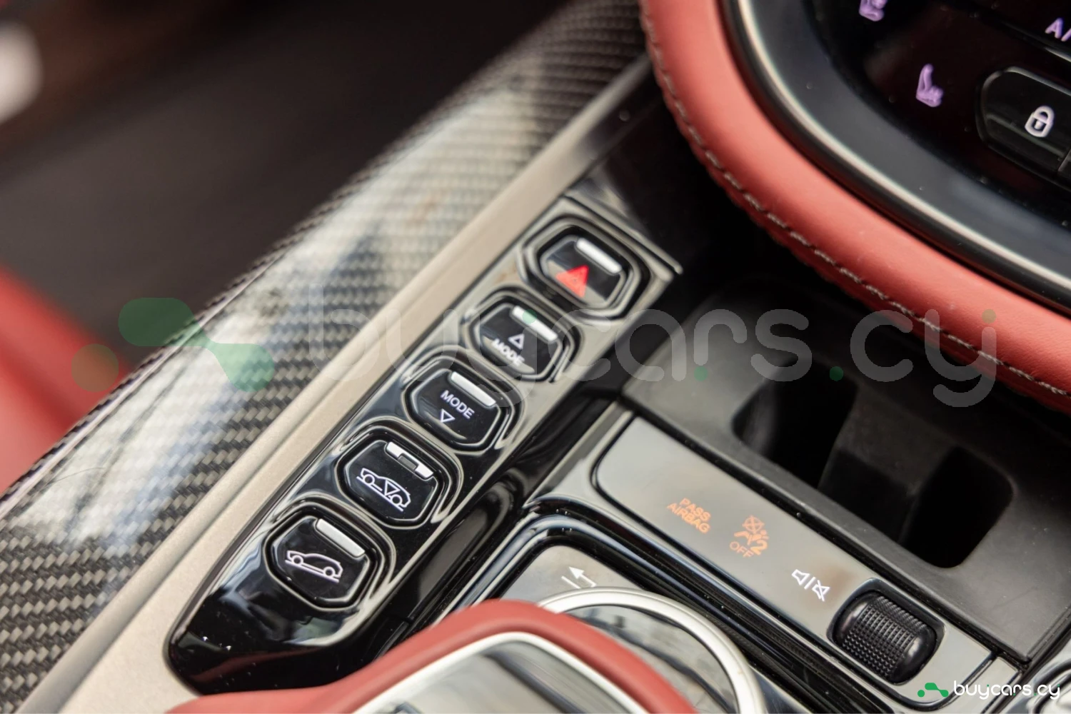 Салон рассчитан на пять человек и отделан Duotone Leather (Red/Brown) с leather roof liner и элементами Carbon Interior. Из оборудования — Heated & Ventilated Seats, Seat air conditioning, Seat heater, электрические регулировки сидений, TV: Full-segment, Display audio с поддержкой Apple CarPlay/Android Auto, Car navigation system (HDD) и dashcam. Для удобства предусмотрены Keyless, Smart key, Power windows и возможность подключения музыкального плеера.