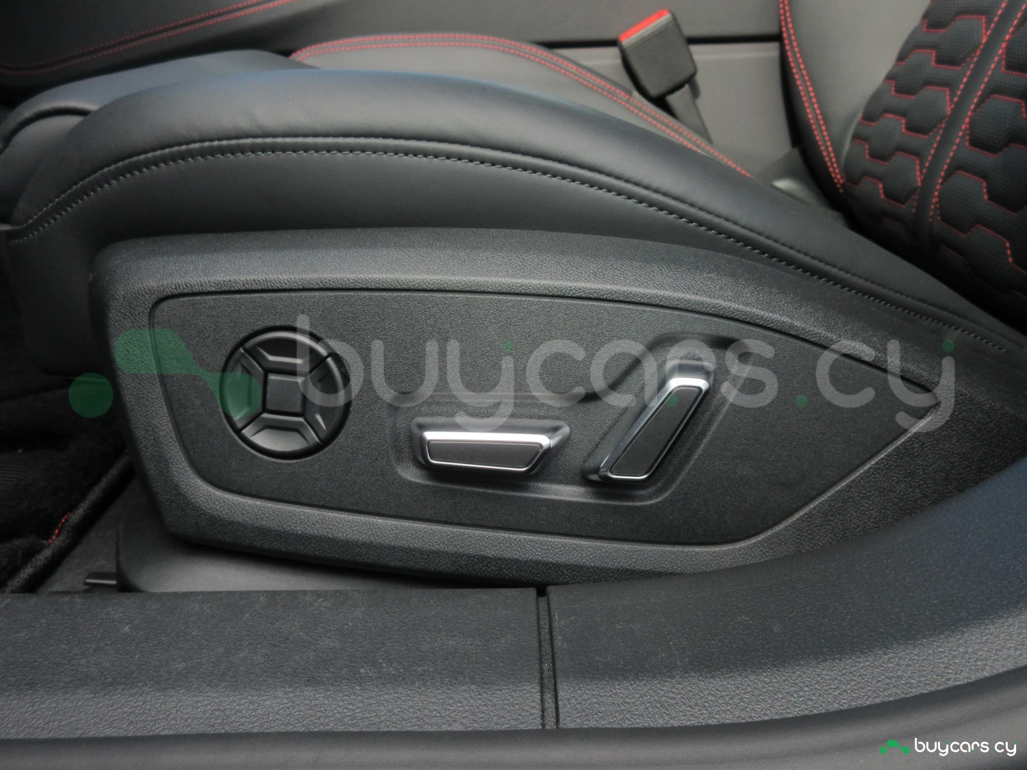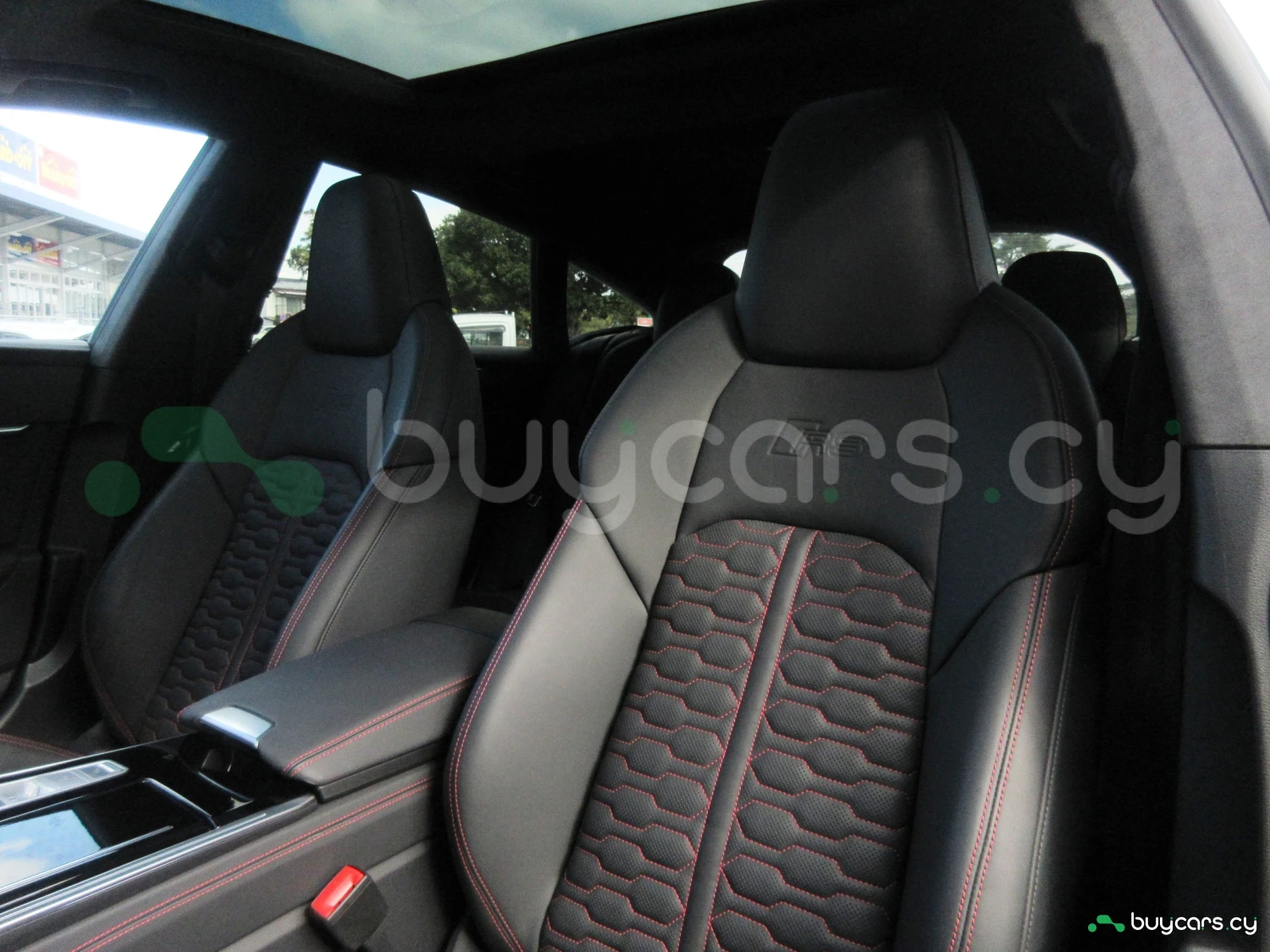 Интерьер: Премиальные спортивные сиденья из кожи Valcona черного цвета с логотипом RS, многофункциональный кожаный руль с подогревом и подрулевыми лепестками, цифровая приборная панель (Audi Virtual Cockpit), высококачественная отделка интерьера с декоративными панелями из карбона Twill, атмосферная подсветка салона, проекционный дисплей.