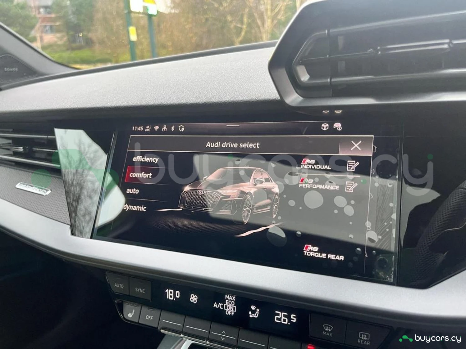 Технологии и мультимедиа: Автомобиль оснащен пакетом Technology Pack Pro, включающим систему MMI Navigation Plus с 10,1-дюймовым сенсорным дисплеем, виртуальную приборную панель Audi Virtual Cockpit RS с 12,3-дюймовым дисплеем, Audi App Store и интерфейс для смартфонов, поддержку Apple CarPlay и Android Auto, беспроводную зарядку Audi Phone Box, цифровое радио DAB, систему экстренного вызова E-Call и USB-порты с функцией зарядки для задних пассажиров.