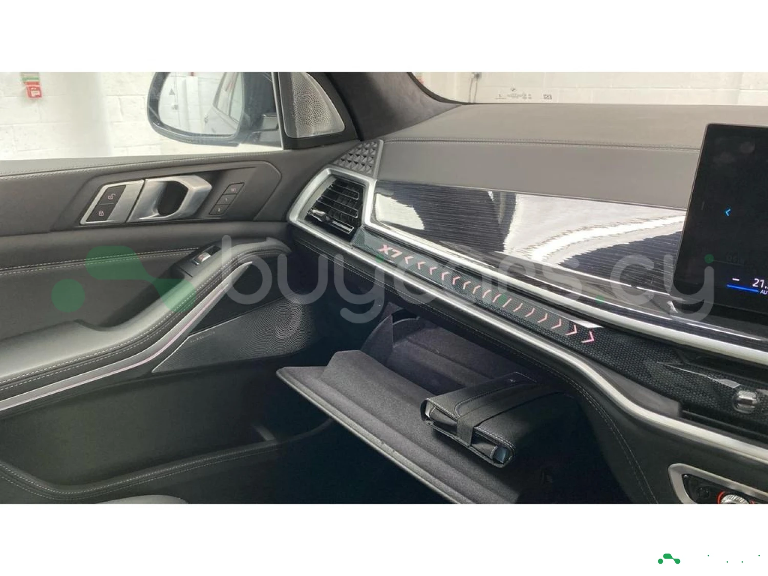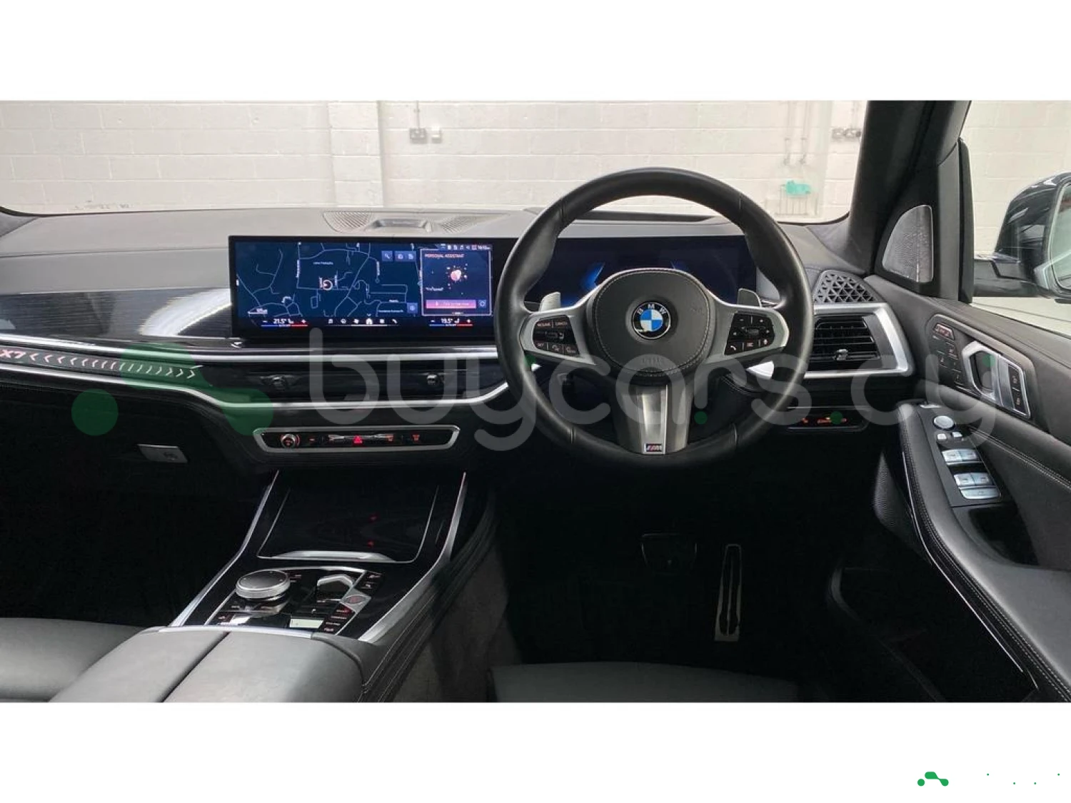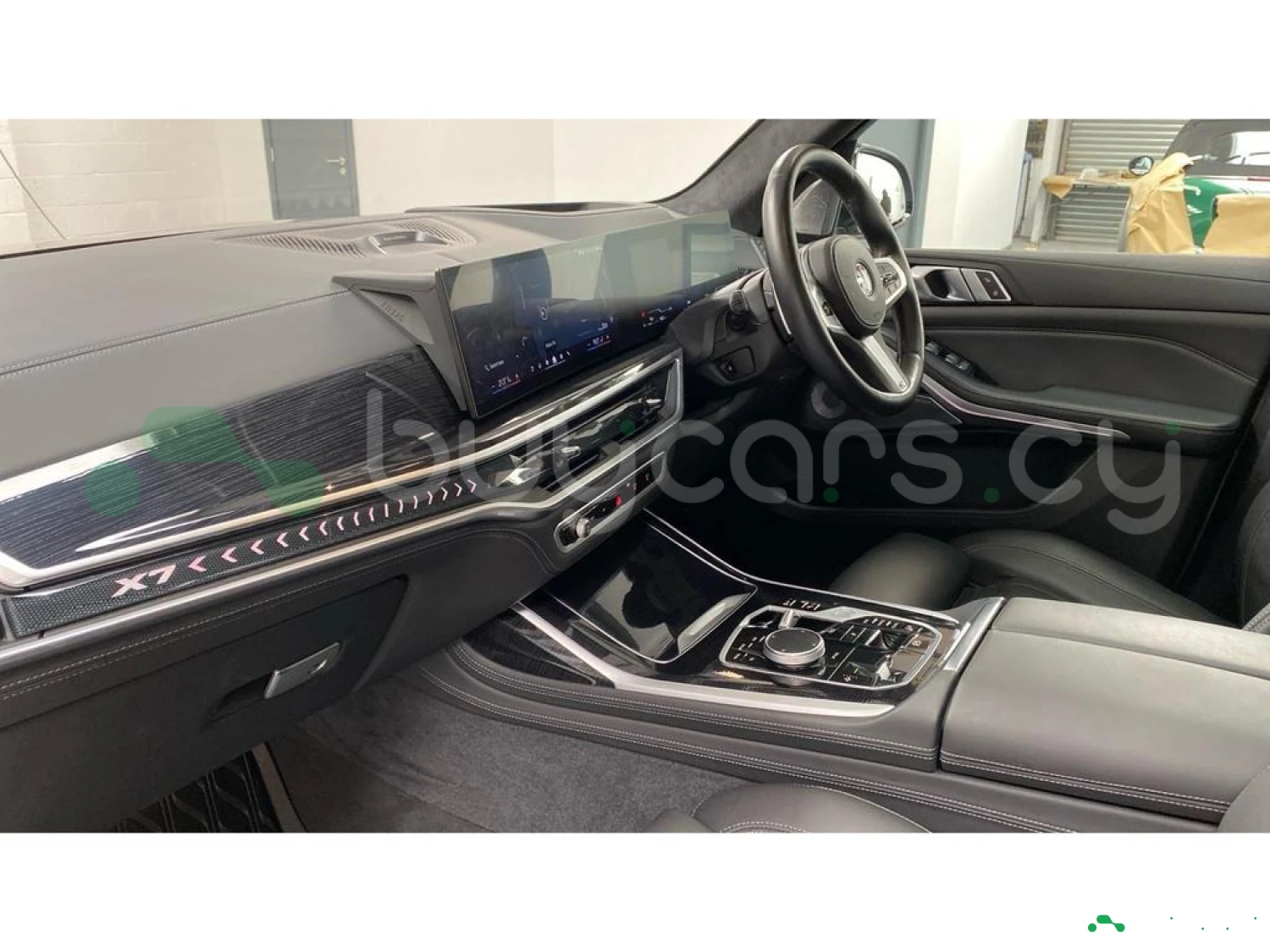Внутри BMW X7 3.0 xDrive 40i M Sport салон выполнен с учётом роскоши и спортивного духа. Здесь используются кожаные сиденья Full Merino и Alcantara обивка потолка, создающие атмосферу элегантности и комфорта. В автомобиле установлен 12,3-дюймовый цифровой дисплей, который обеспечивает чёткое отображение всей важной информации о вождении. Мультимедийная система Live Cockpit Pro управляется через 12,3-дюймовый сенсорный экран, поддерживающий Apple CarPlay и Android Auto. Пакет Technology Plus Pack включает в себя Bowers & Wilkins Diamond Surround Sound, создавая исключительное аудио-впечатление.