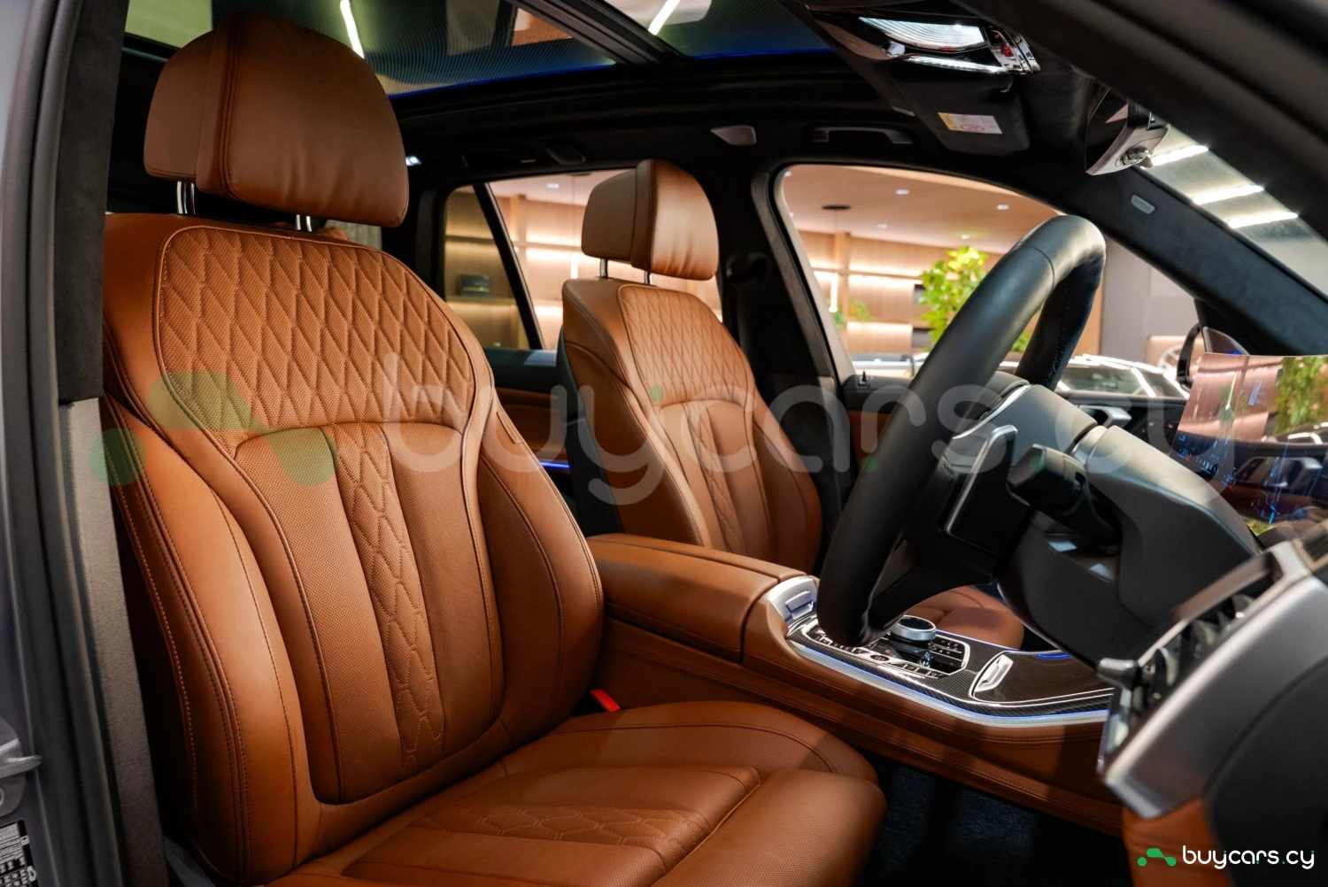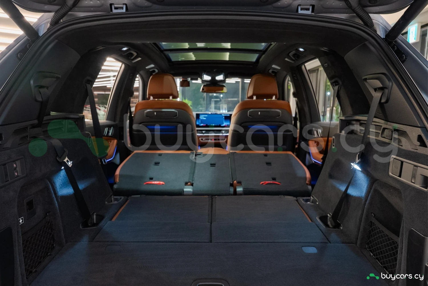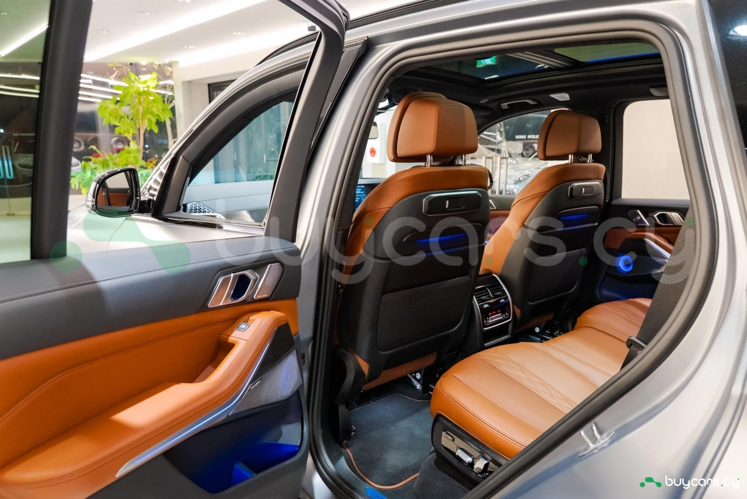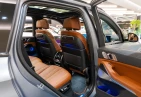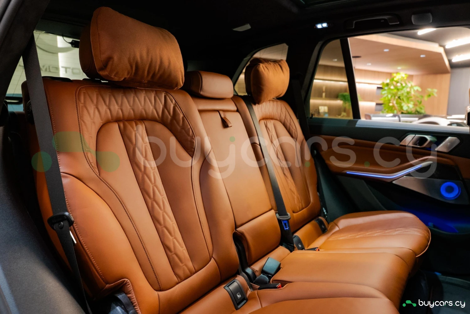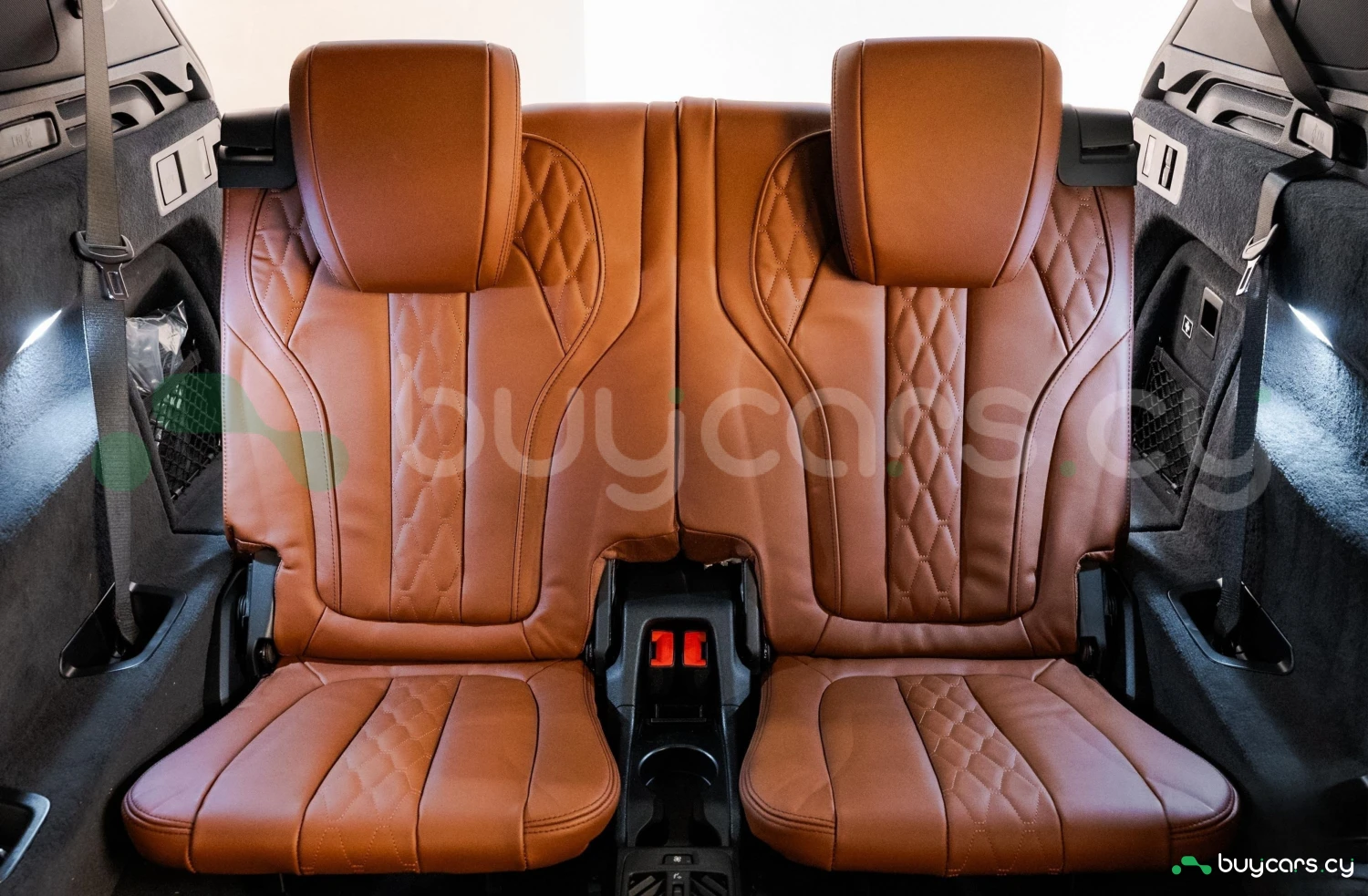 Салон отделан роскошной кожей BMW Individual Full Merino и выполнен с использованием премиальных материалов. Панорамная крыша Sky Lounge создаёт атмосферу простора и уюта, а подогрев и вентиляция сидений, а также подогрев заднего ряда обеспечивают максимальный комфорт для всех пассажиров. Семиместная компоновка повышает практичность автомобиля.