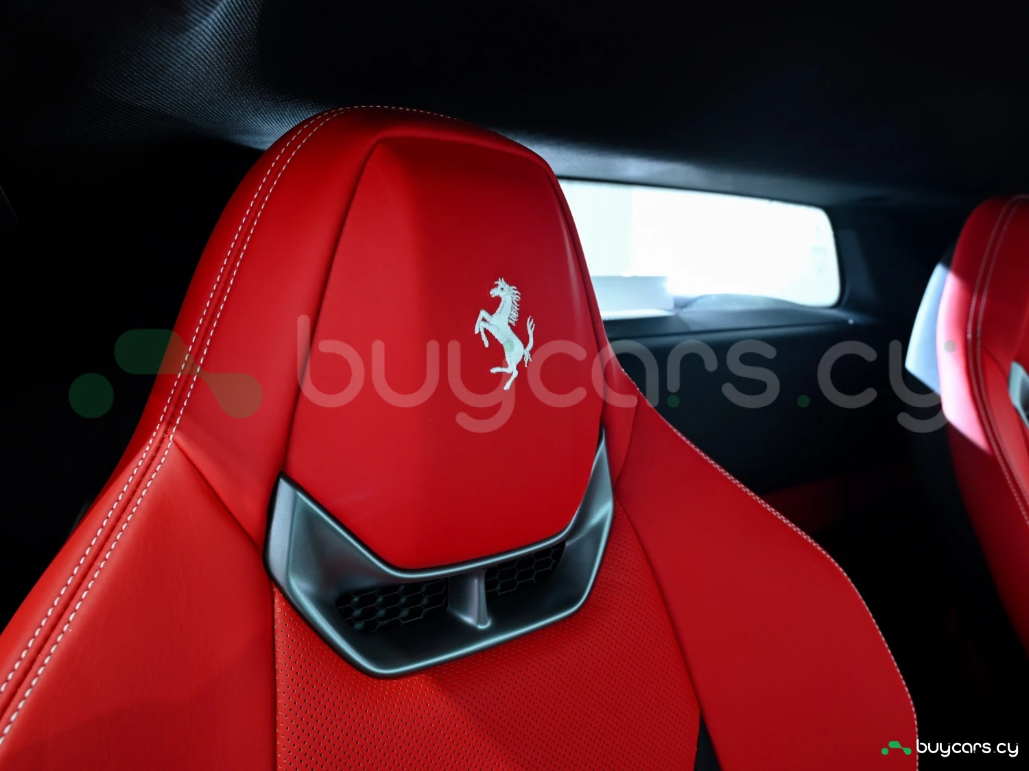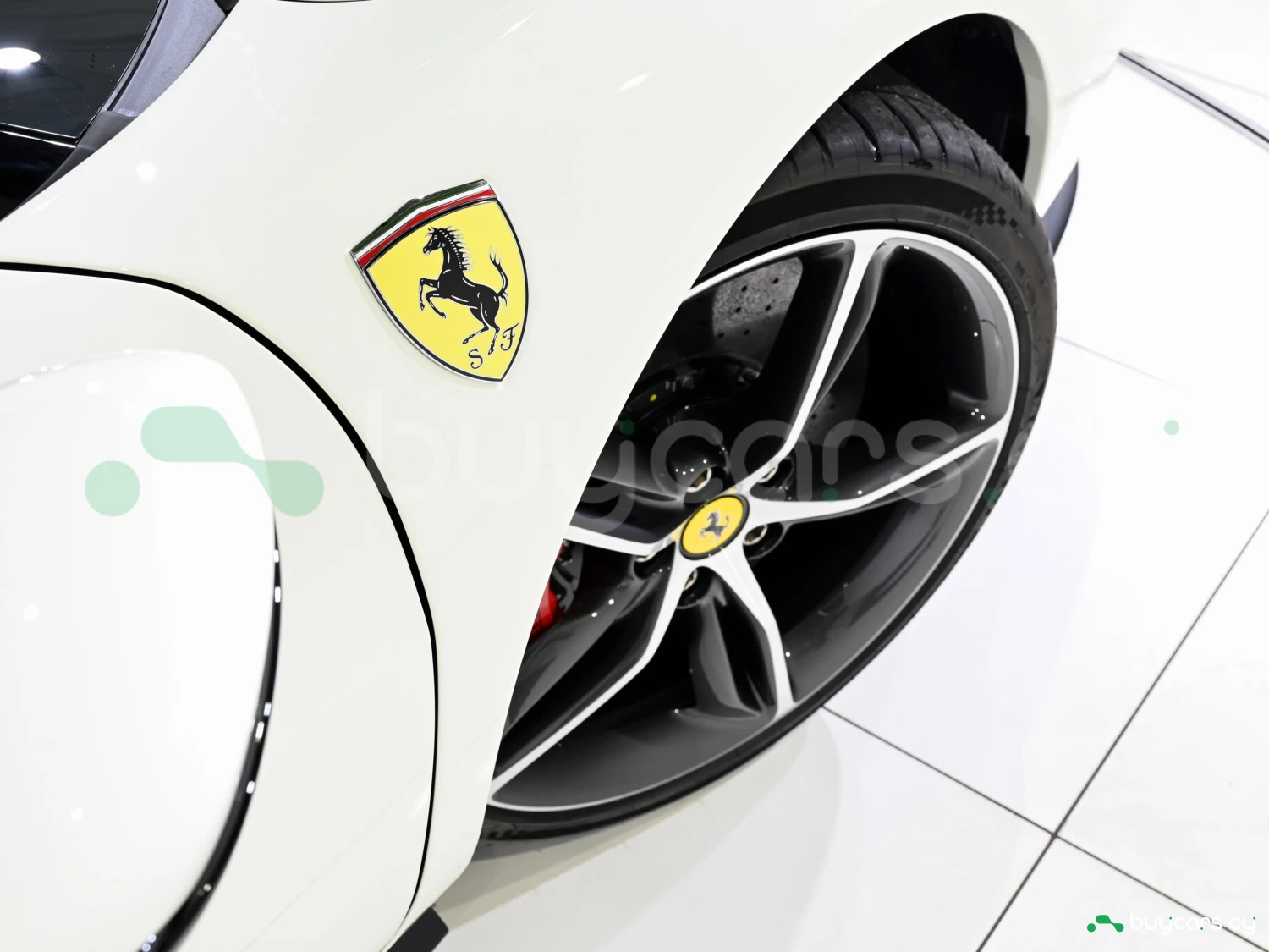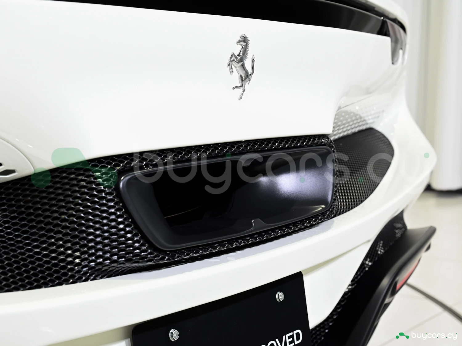 Дизайн автомобиля гармонично сочетает классические формы Ferrari с современными аэродинамическими решениями. Цвет Bianco Avus подчёркивает динамичные линии кузова, а такие элементы, как активный задний спойлер, светодиодная оптика и скрытые дверные ручки, подчеркивают спортивный дух модели. Пропорции и архитектура автомобиля указывают на его ориентацию на высокие скорости и маневренность.