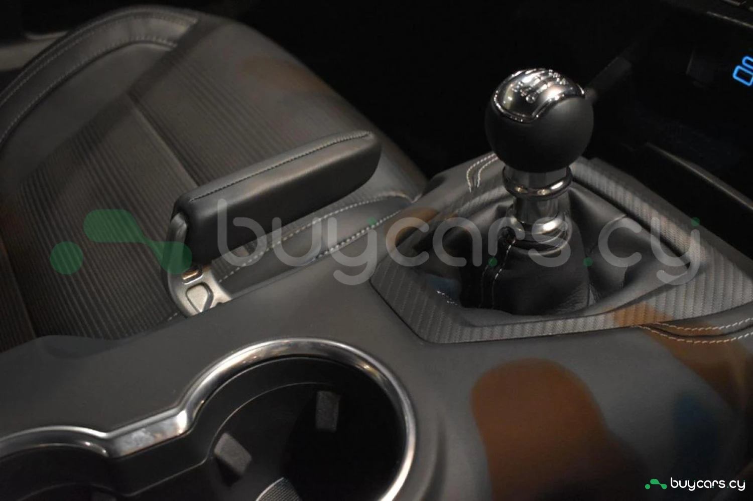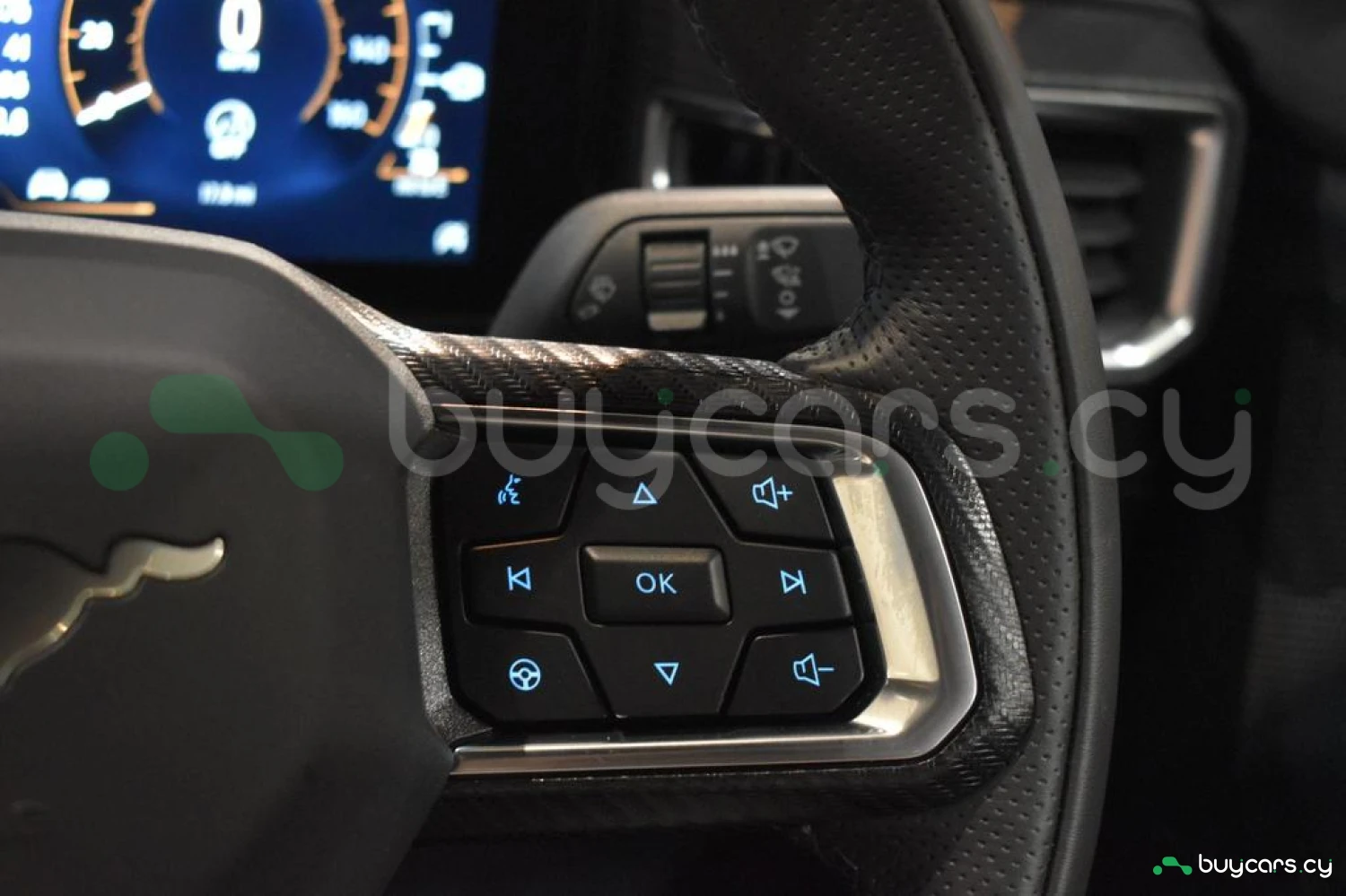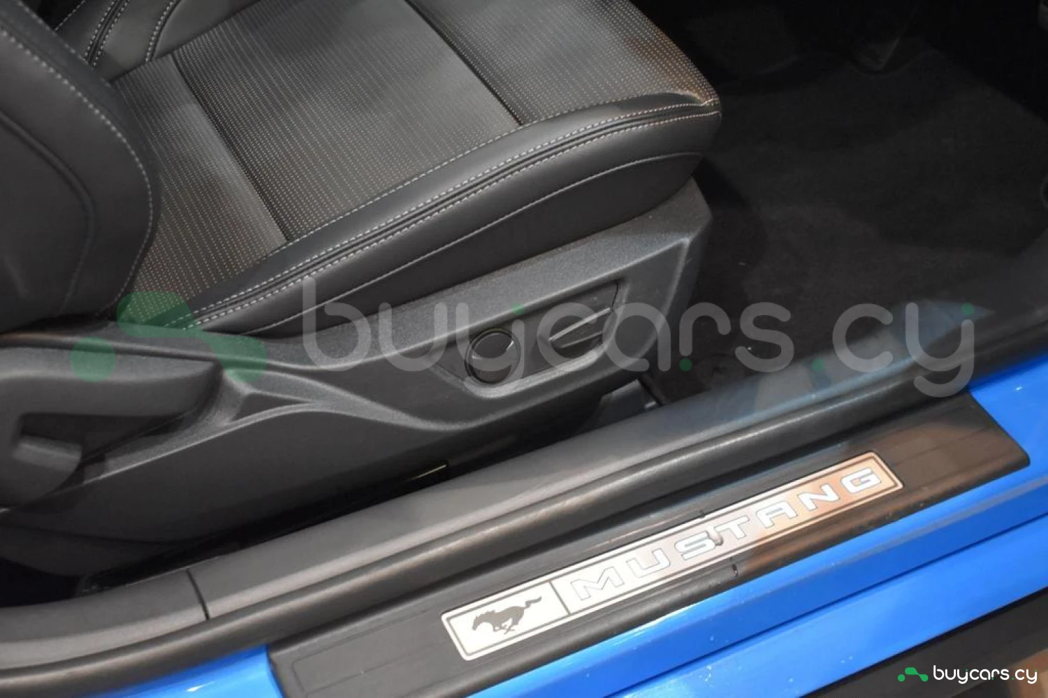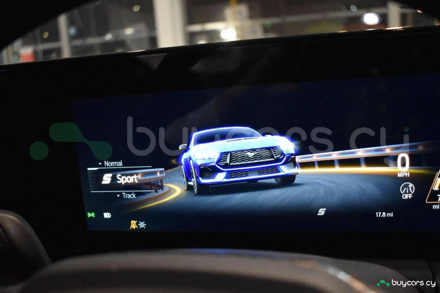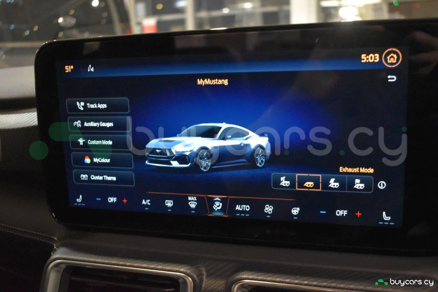 Экстерьер: Окраска Grabber Blue Metallic, 19-дюймовые окрашенные легкосплавные диски, комплект GT bodykit с черными молдингами дверных рам, передняя решетка радиатора GT с вертикальными силовыми ребрами, четыре выхлопные трубы, красные тормозные суппорты с белым логотипом, складывающиеся зеркала с подсветкой логотипа Mustang.