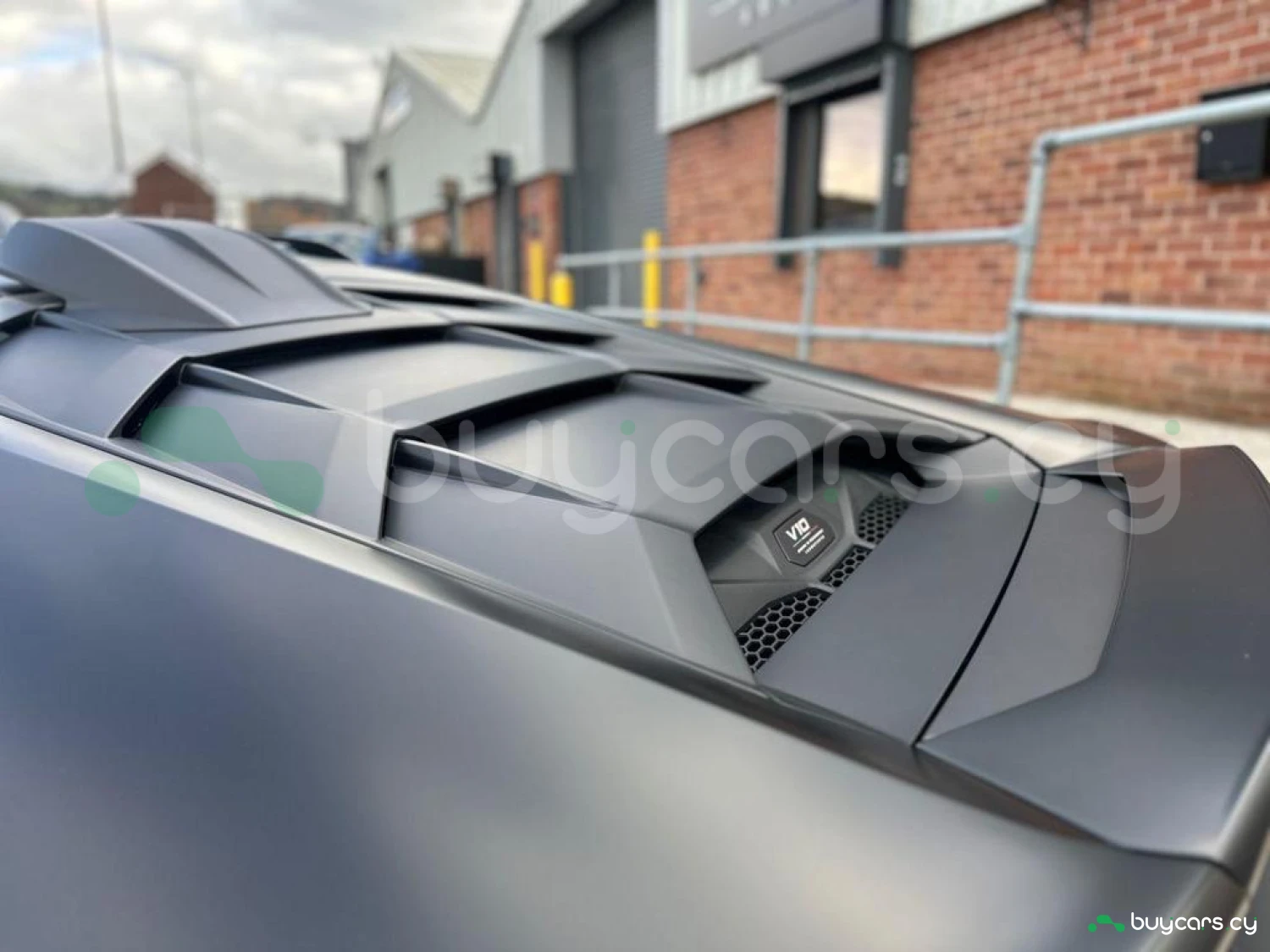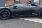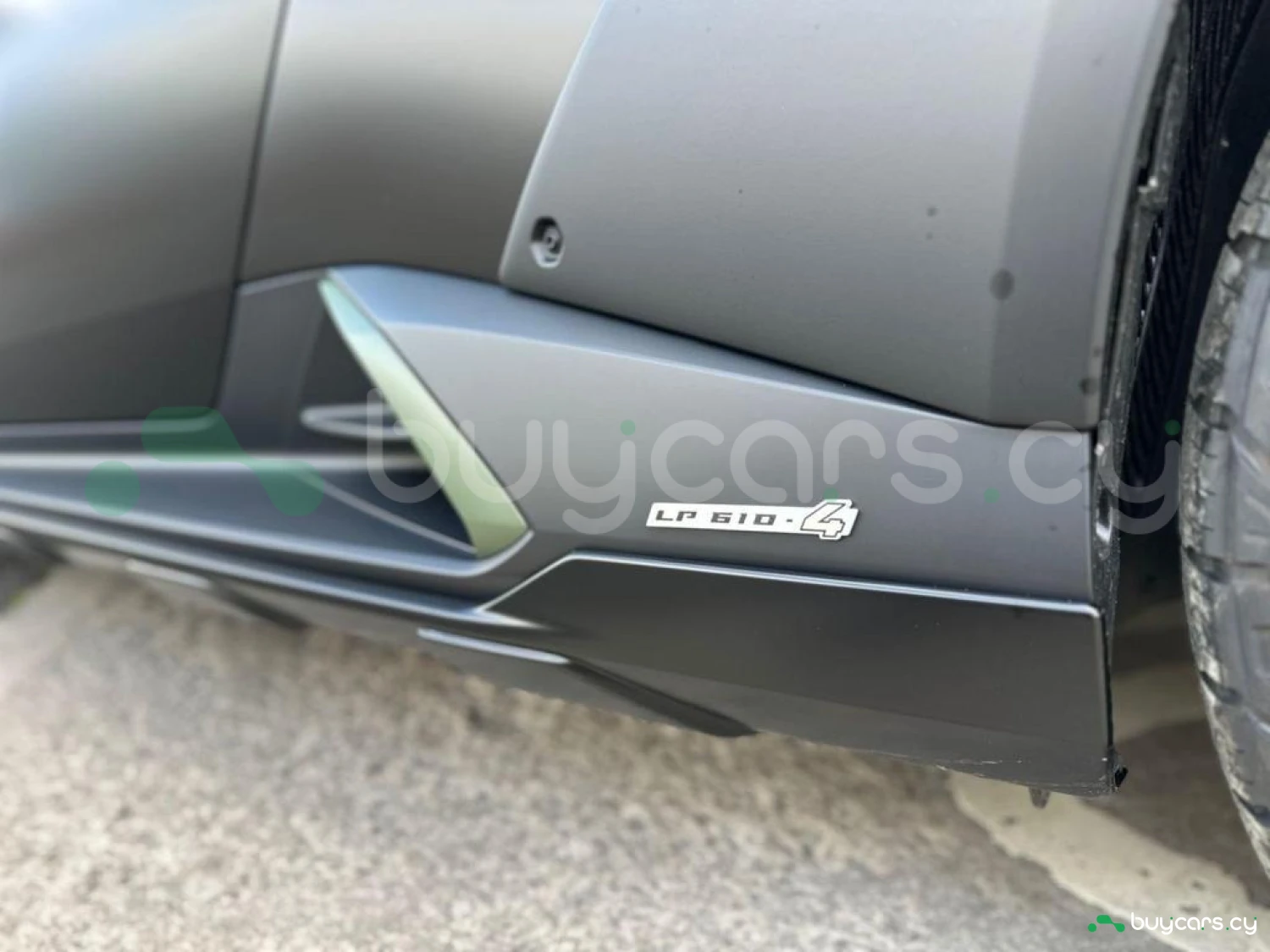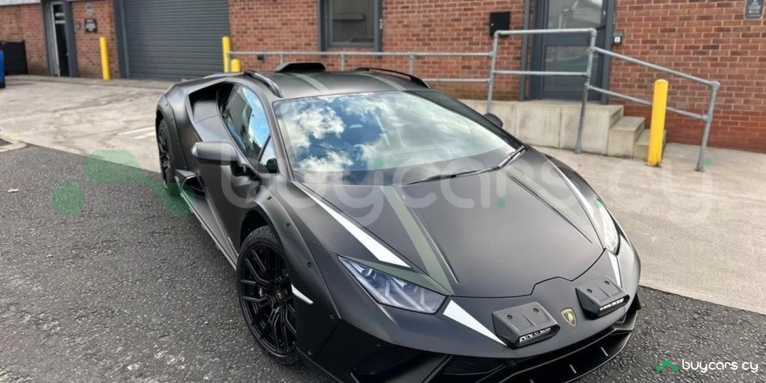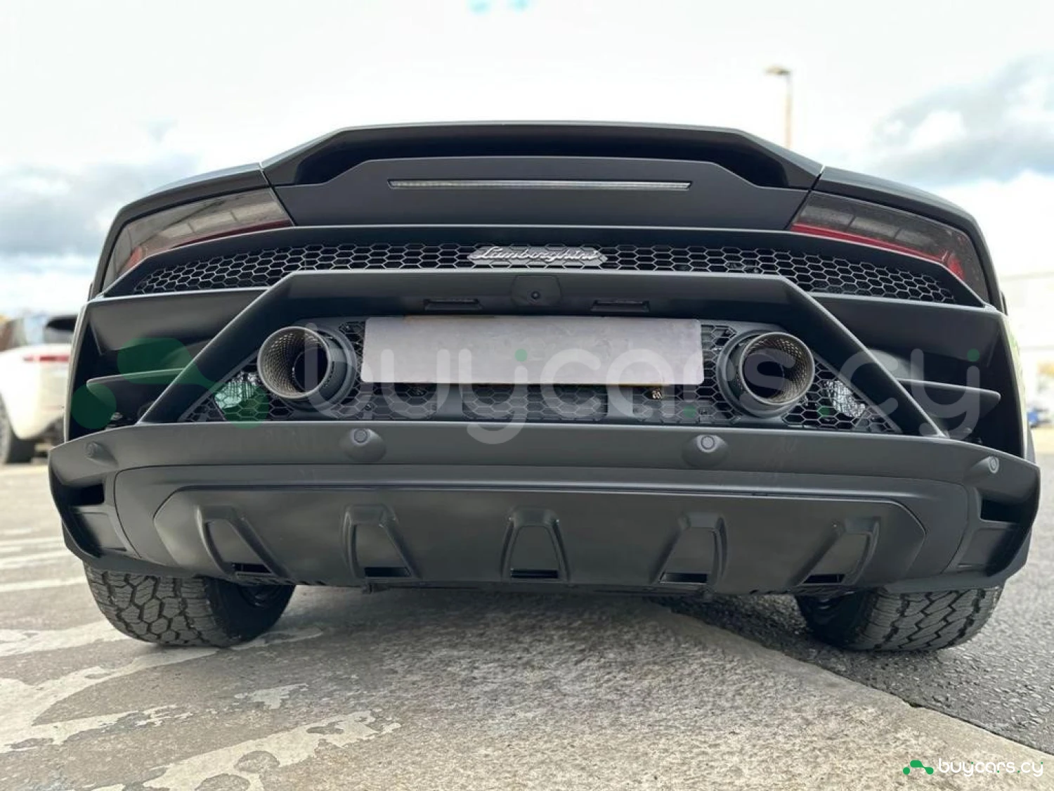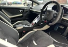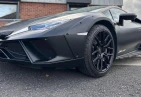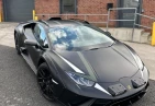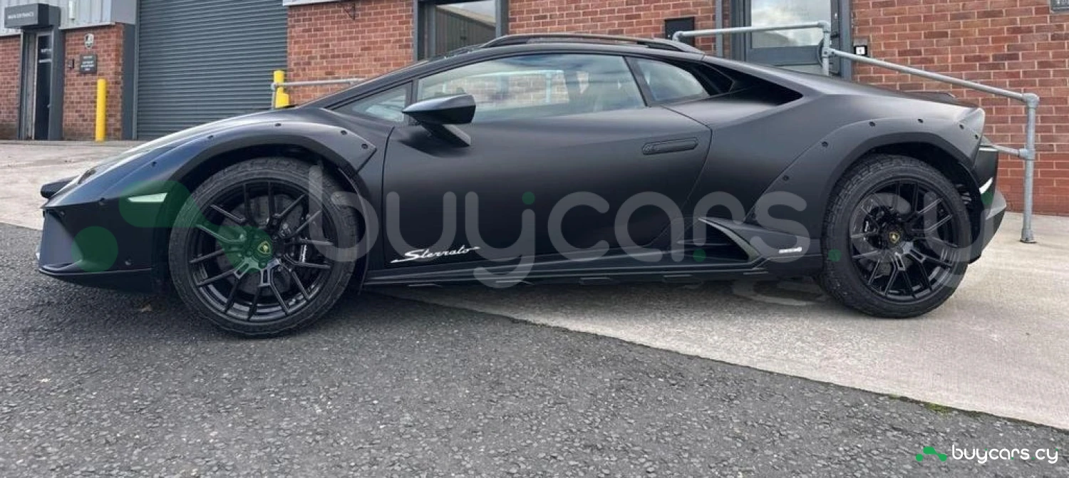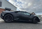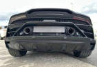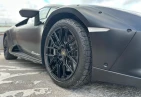 Экстерьер: Черный цвет кузова придает автомобилю агрессивный и стильный облик. Huracán оснащен 19-дюймовыми легкосплавными дисками Cerere Casted Silver, обутыми в шины Bridgestone Dueler (235/40 R19 спереди, 285/40 R19 сзади) для оптимального сцепления с дорогой. Легкий алюминиевый кузов и гибридное шасси из алюминия и карбона улучшают управляемость и динамику. Внешний облик дополняют матовые черные элементы, хромированный логотип Lamborghini на задней части, наклейка на боковой двери и выхлопные патрубки в матовом сером цвете. Глянцевые черные рейлинги и зеркала (дополнительные опции) придают автомобилю премиальный вид.