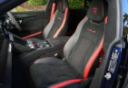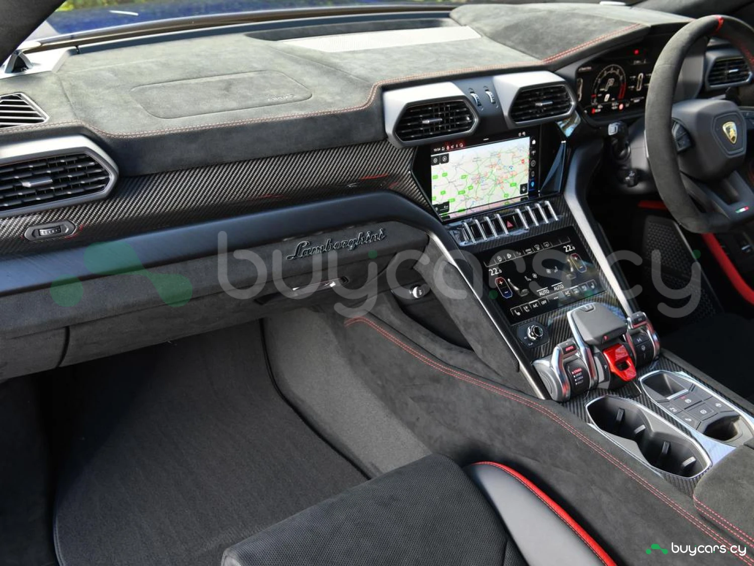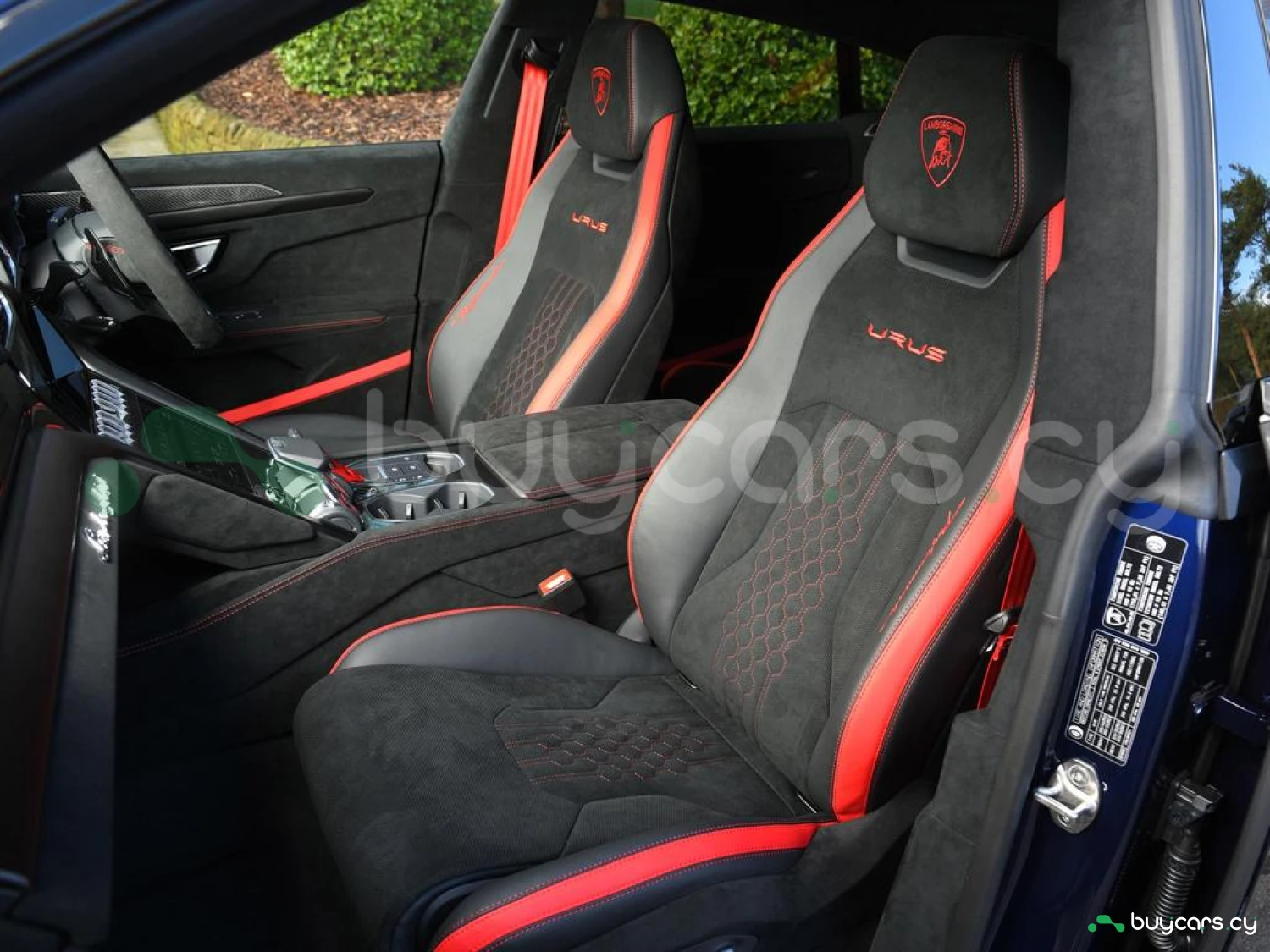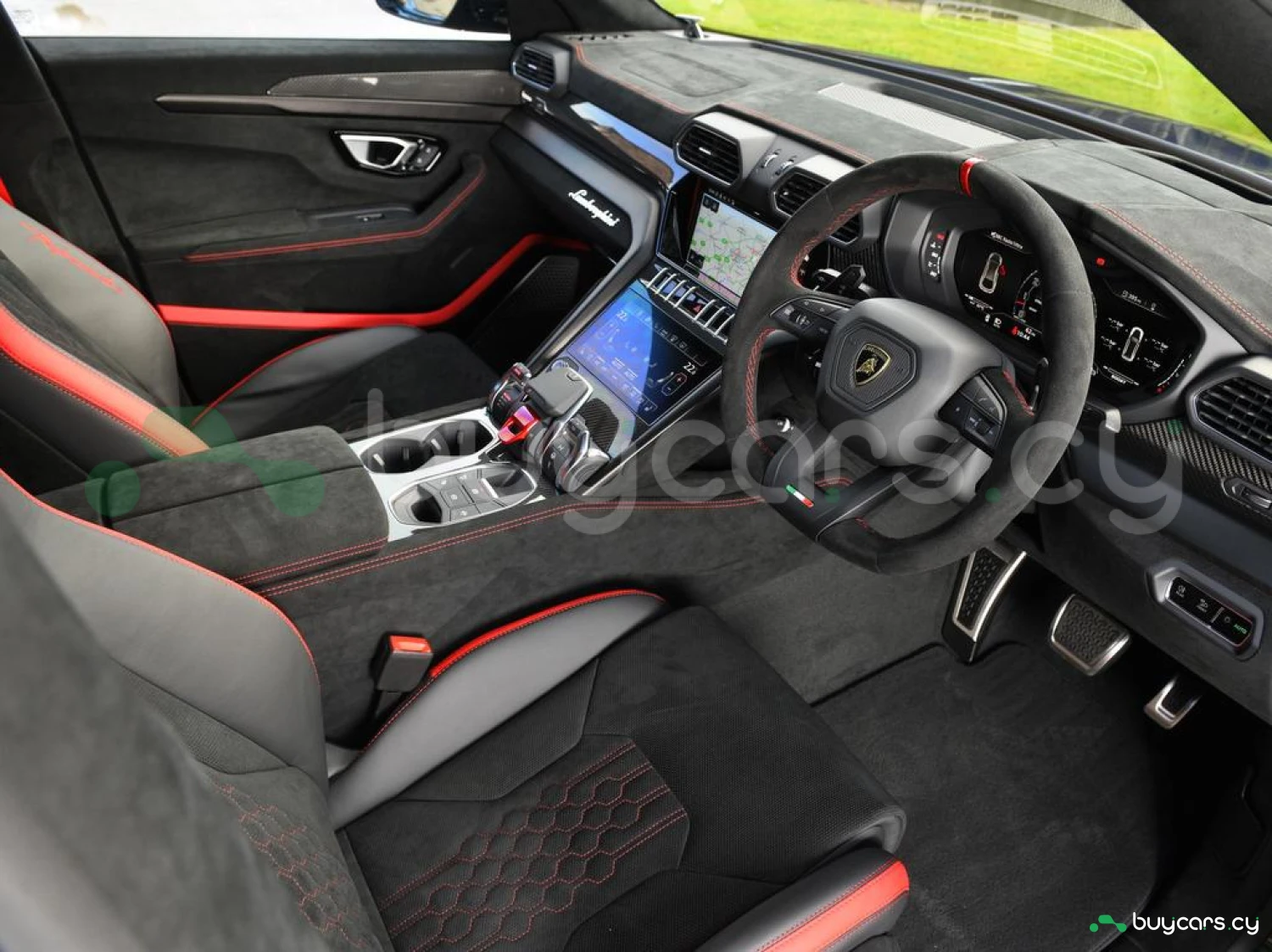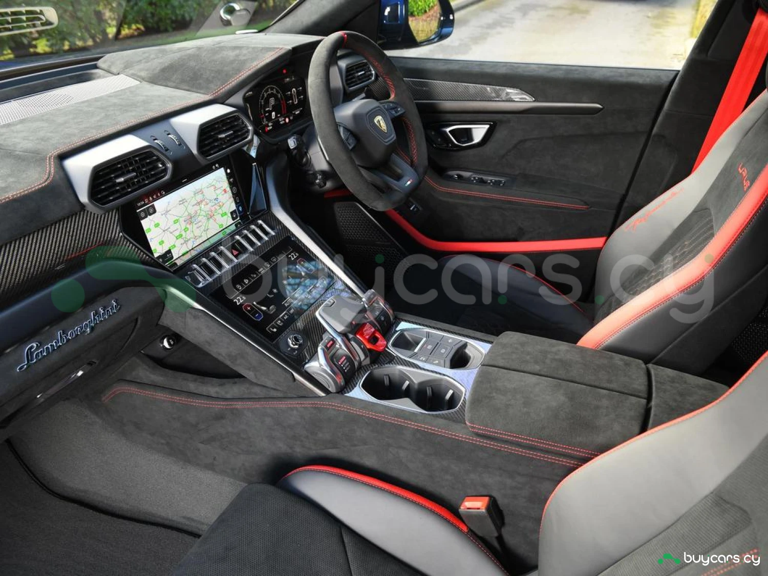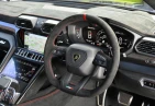 Интерьер и комфорт: Салон выполнен в двухцветной алькантаре Sportivo с отделкой Performante, включая контрастную прострочку Rosso Alala и ремни безопасности в этом же цвете. Интерьер дополнен карбоновыми вставками Carbon Twill, приборной панелью, обшитой алькантарой, а также логотипом Lamborghini на торпедо. Полностью электрические передние сиденья с вентиляцией и массажем, подогрев задних сидений и двери с доводчиками (Soft Close) обеспечивают максимальный комфорт. Спортивный руль, обтянутый алькантарой и кожей, с темно-хромированным ободом и маркером Rosso придает спортивный стиль.