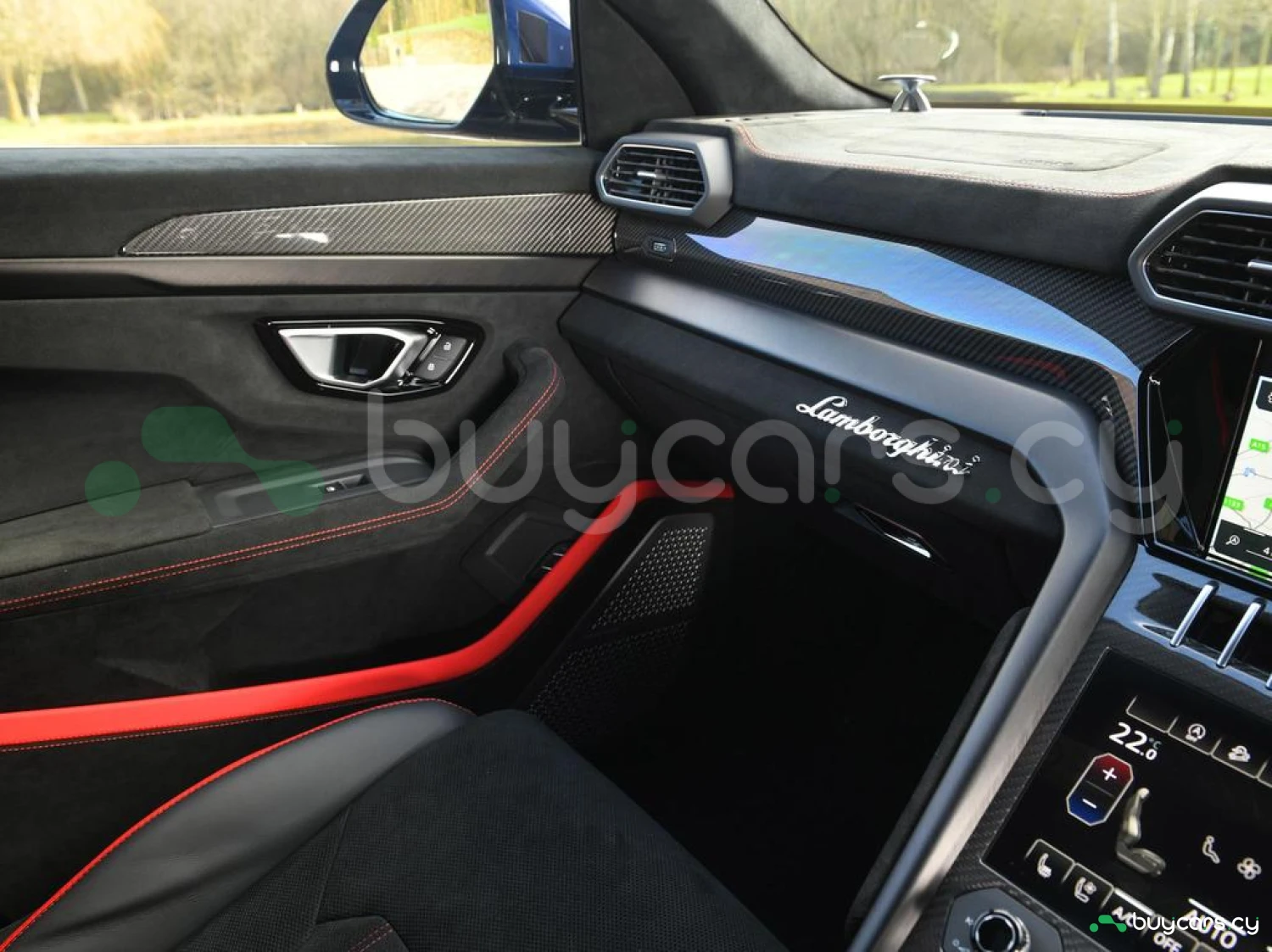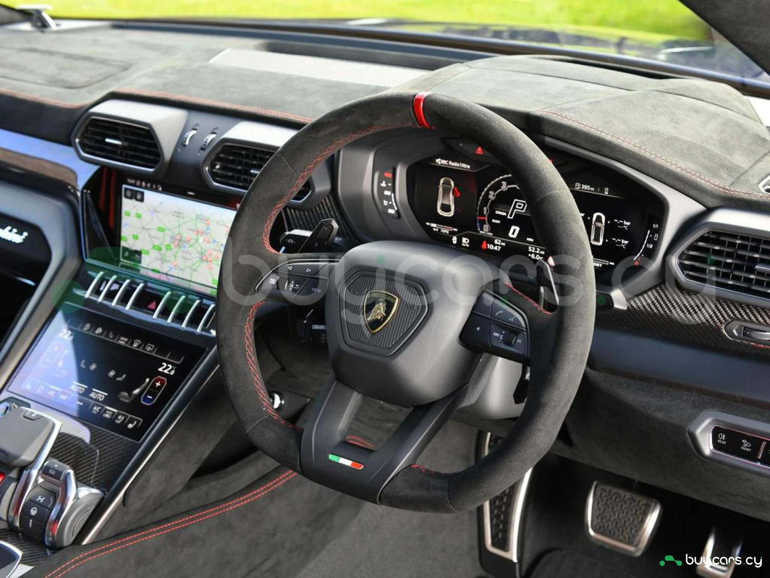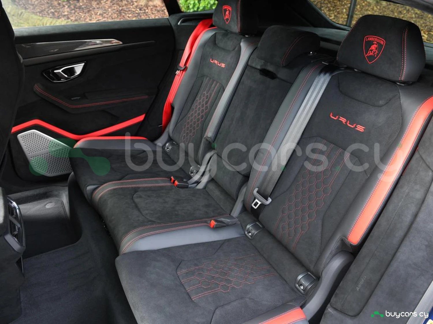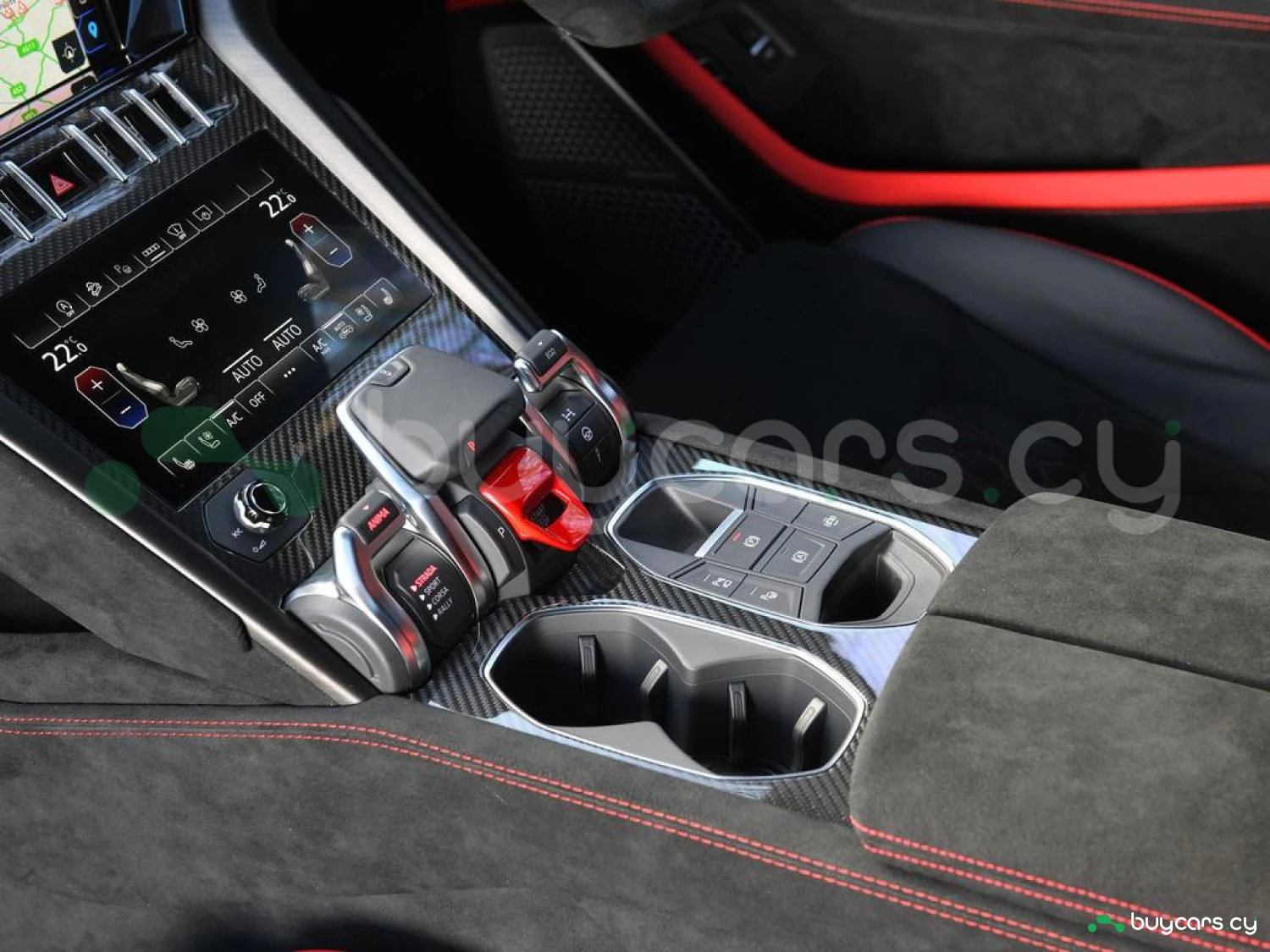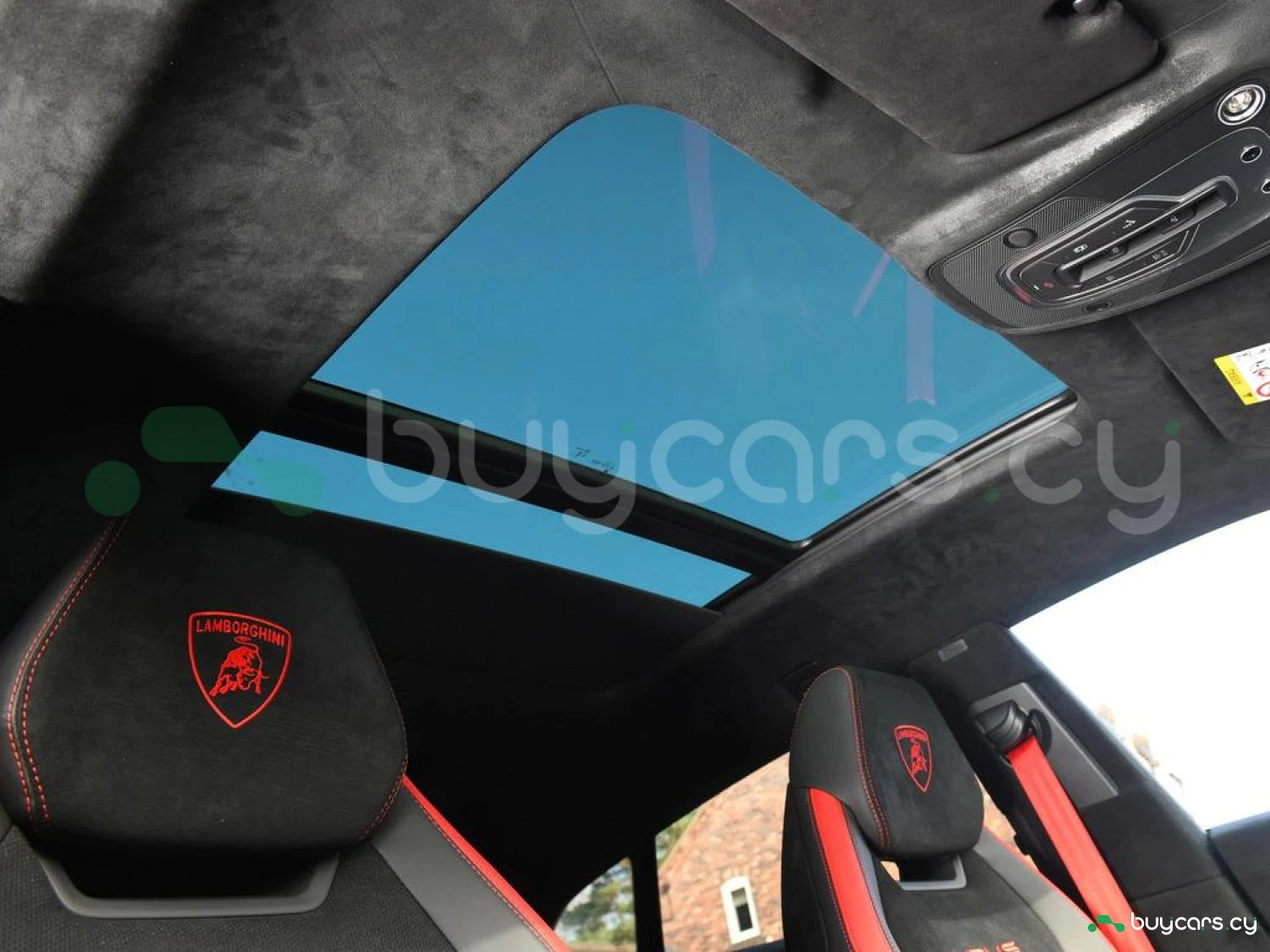 Интерьер и комфорт: Салон выполнен в двухцветной алькантаре Sportivo с отделкой Performante, включая контрастную прострочку Rosso Alala и ремни безопасности в этом же цвете. Интерьер дополнен карбоновыми вставками Carbon Twill, приборной панелью, обшитой алькантарой, а также логотипом Lamborghini на торпедо. Полностью электрические передние сиденья с вентиляцией и массажем, подогрев задних сидений и двери с доводчиками (Soft Close) обеспечивают максимальный комфорт. Спортивный руль, обтянутый алькантарой и кожей, с темно-хромированным ободом и маркером Rosso придает спортивный стиль.