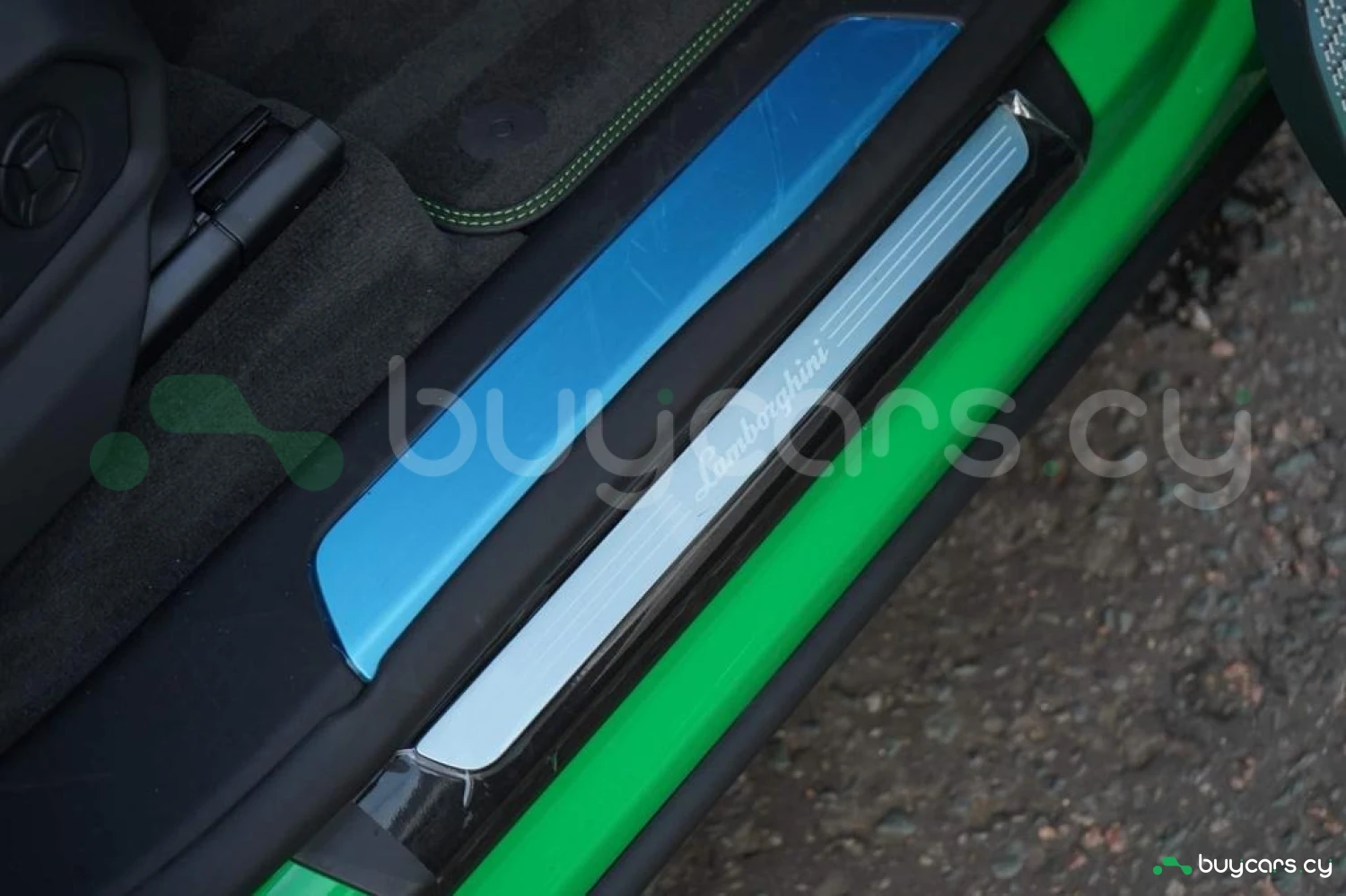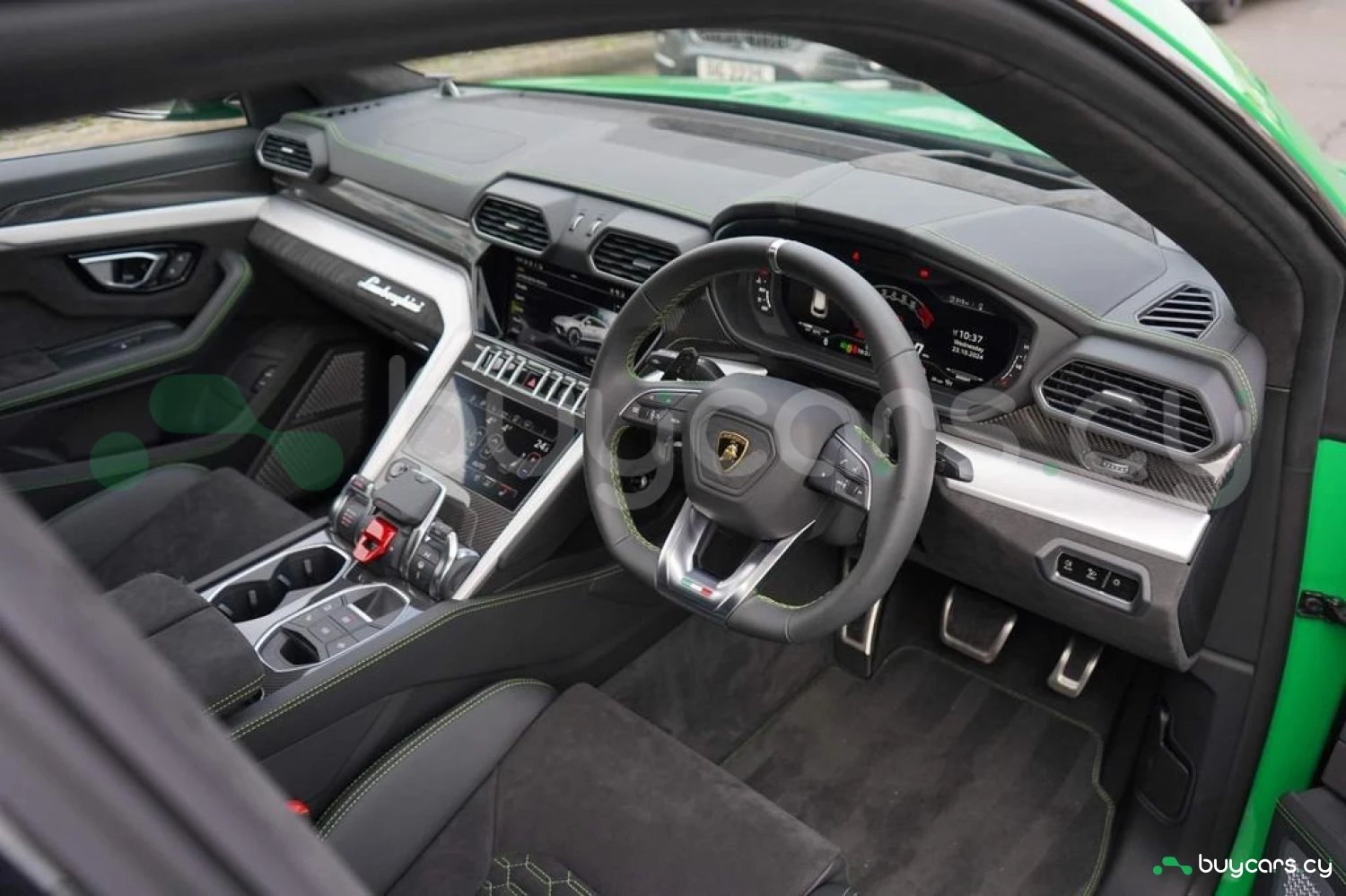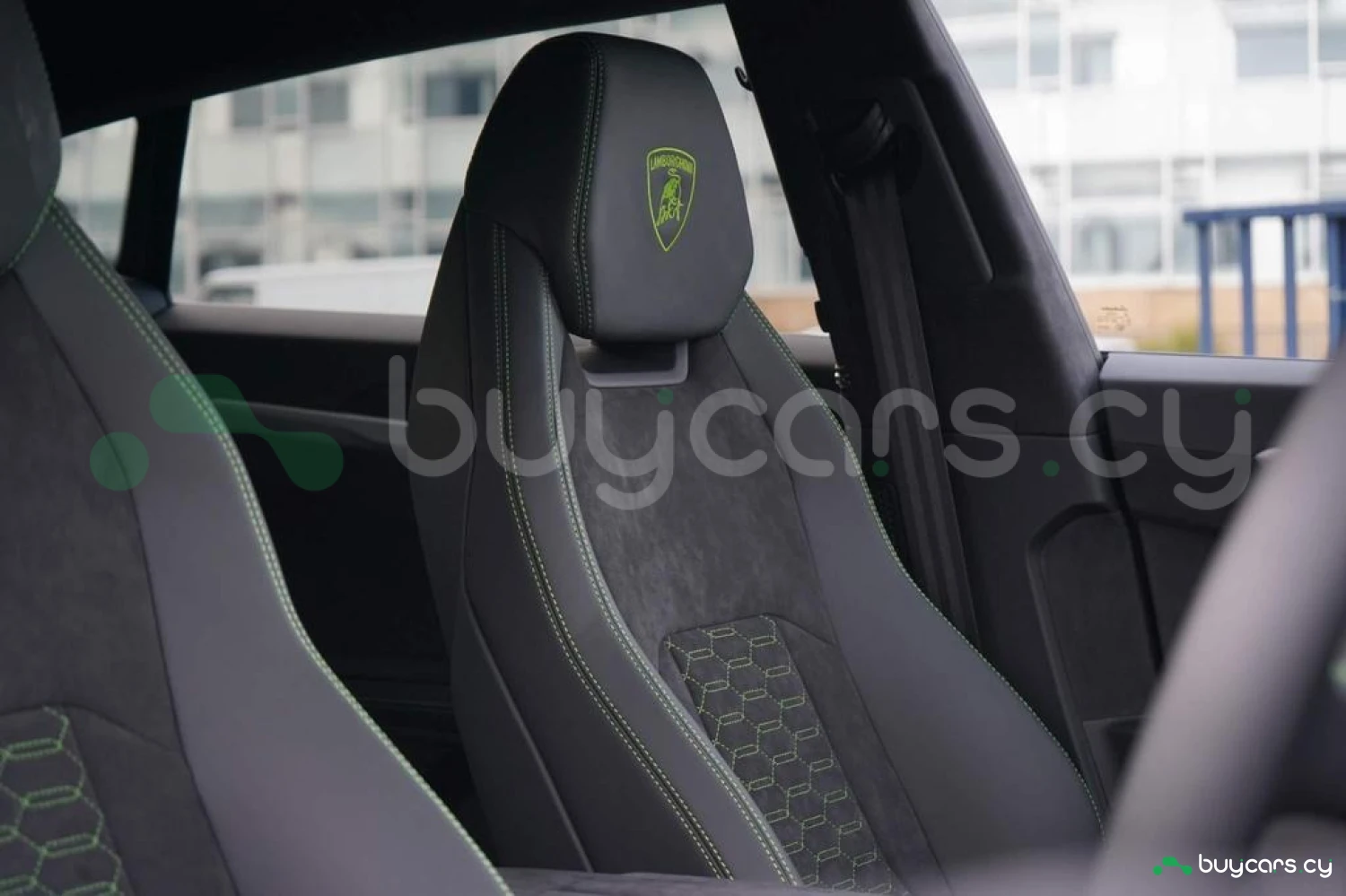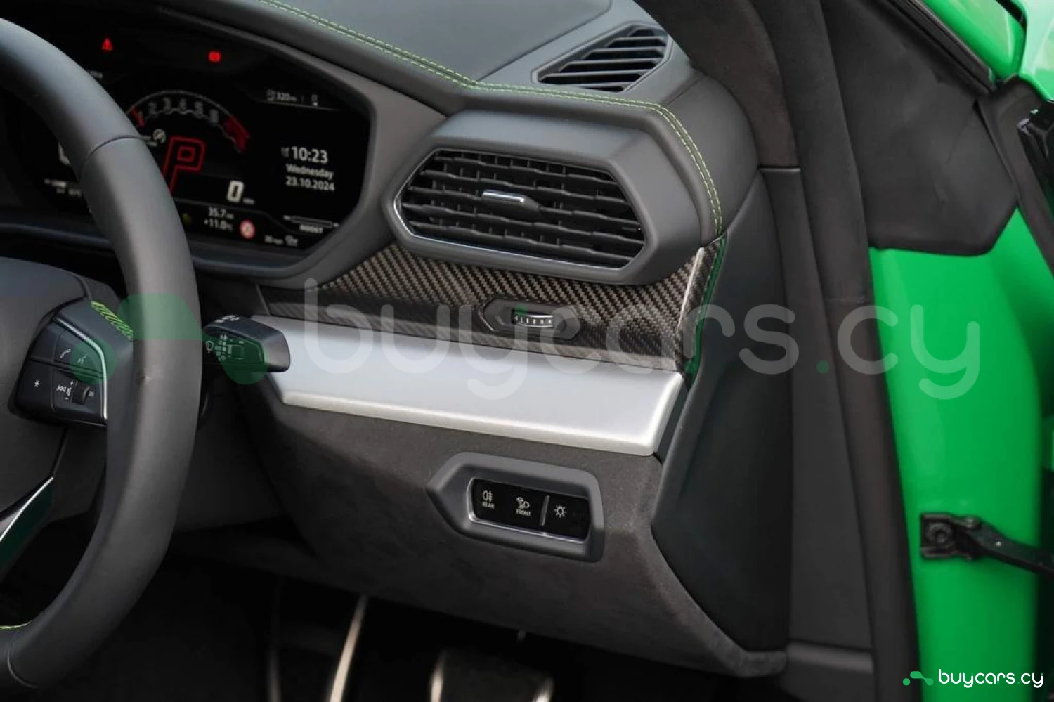 Комфорт и интерьер: Интерьер выполнен в обивке Nero Ade (однотонная кожа) с эксклюзивной алькантарой Q-Citura. Карбоновый интерьерный пакет (Small Interior Carbon Package) добавляет спортивный стиль. Многофункциональный подогреваемый руль из гладкой кожи, а также фирменная вышивка логотипа Lamborghini на подголовниках подчеркивают уровень премиального комфорта. Дополнительно установлены полы с кожаной окантовкой и двойной строчкой, а также опциональная прострочка интерьера и руля.